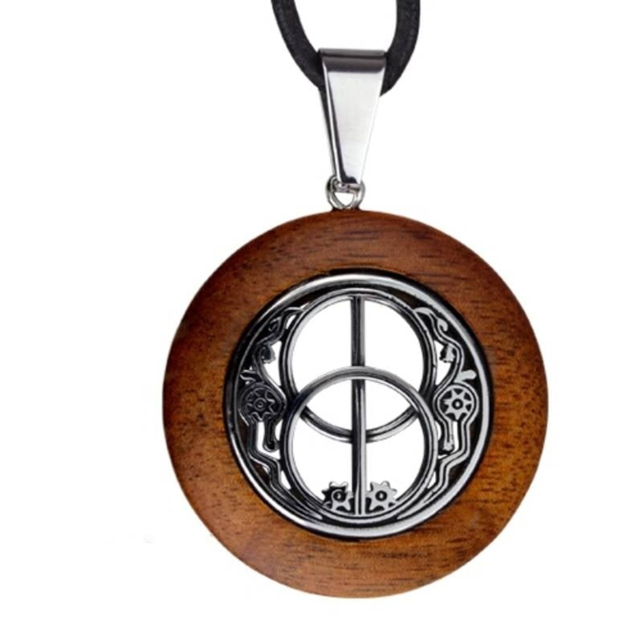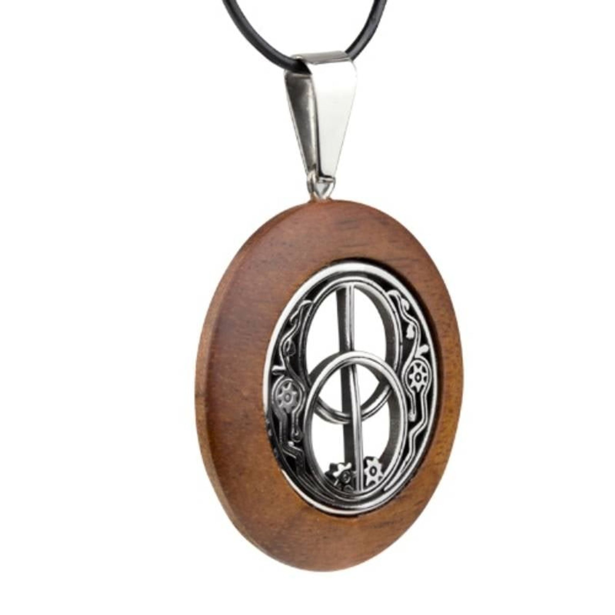Mönstret från Chalice brunn i rostfritt stål. Detta mönster är sedan inramat av en cirkel i valnötsträ.