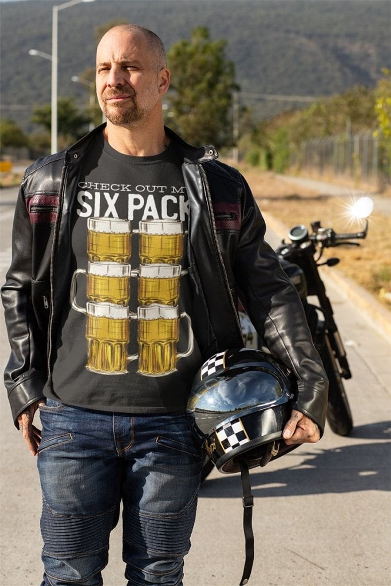 Denna svarta T-shirt med det lekfulla trycket "CHECK OUT MY SIX PACK" är den perfekta kompanjonen för den som tar sin öl lika seriöst som sin träning. Varför stå i gymmet och jobba för sex stycken magrutor när du kan stoltsera med en "six pack" som verkligen räknas – och en som dessutom är mycket roligare att dela med vänner.