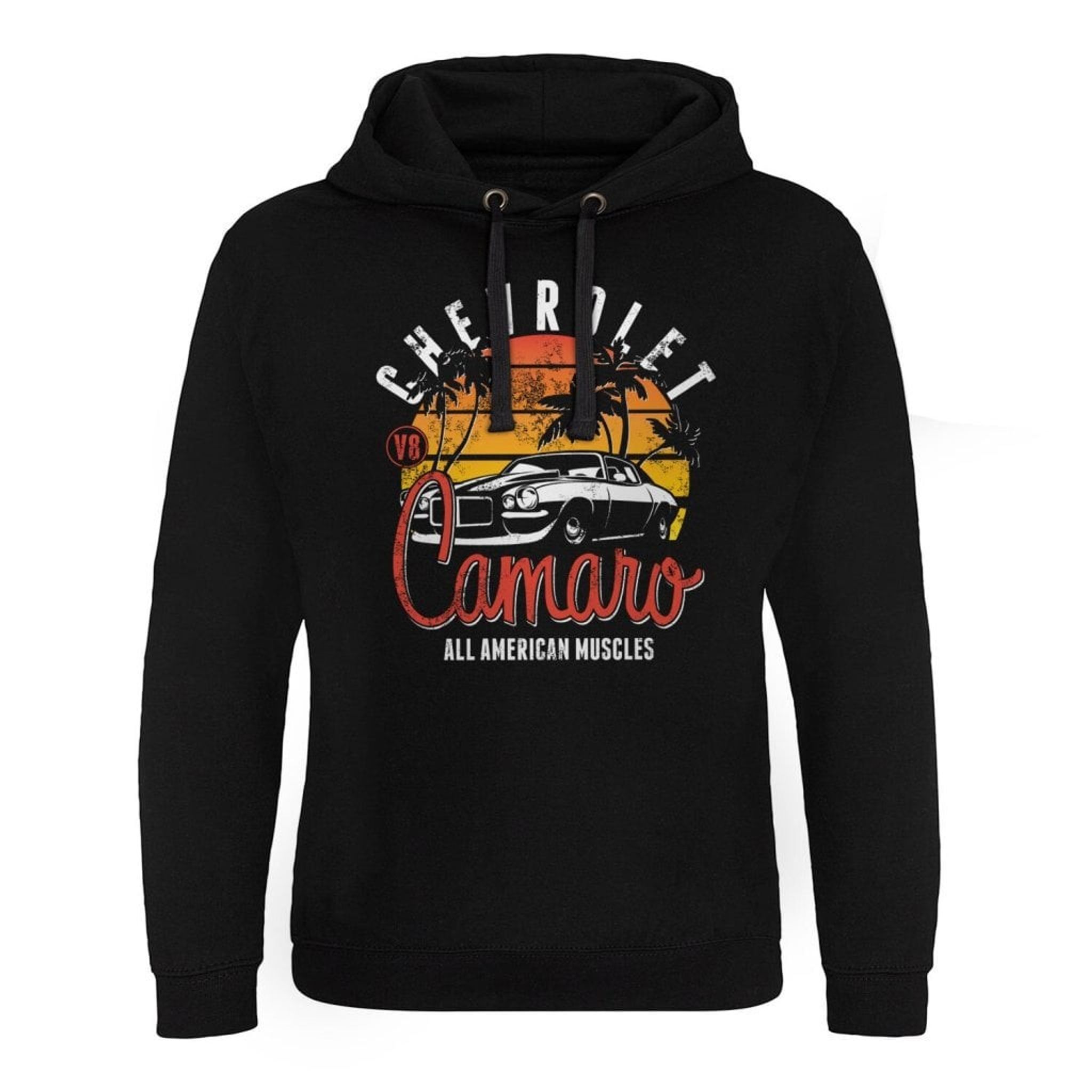 På framsidan av denna hoodie ser du en äkta amerikansk ikon - en Chevrolet Camaro omgiven av palmer som ser ut att ha rymt från en semesterbrochyr. Det är som att ha en bit av den amerikanska drömmen tryckt på ditt plagg, och varje gång du bär den hoodie känns det som om du är redo att kasta dig ut på vägarna i en klassisk muscle car.