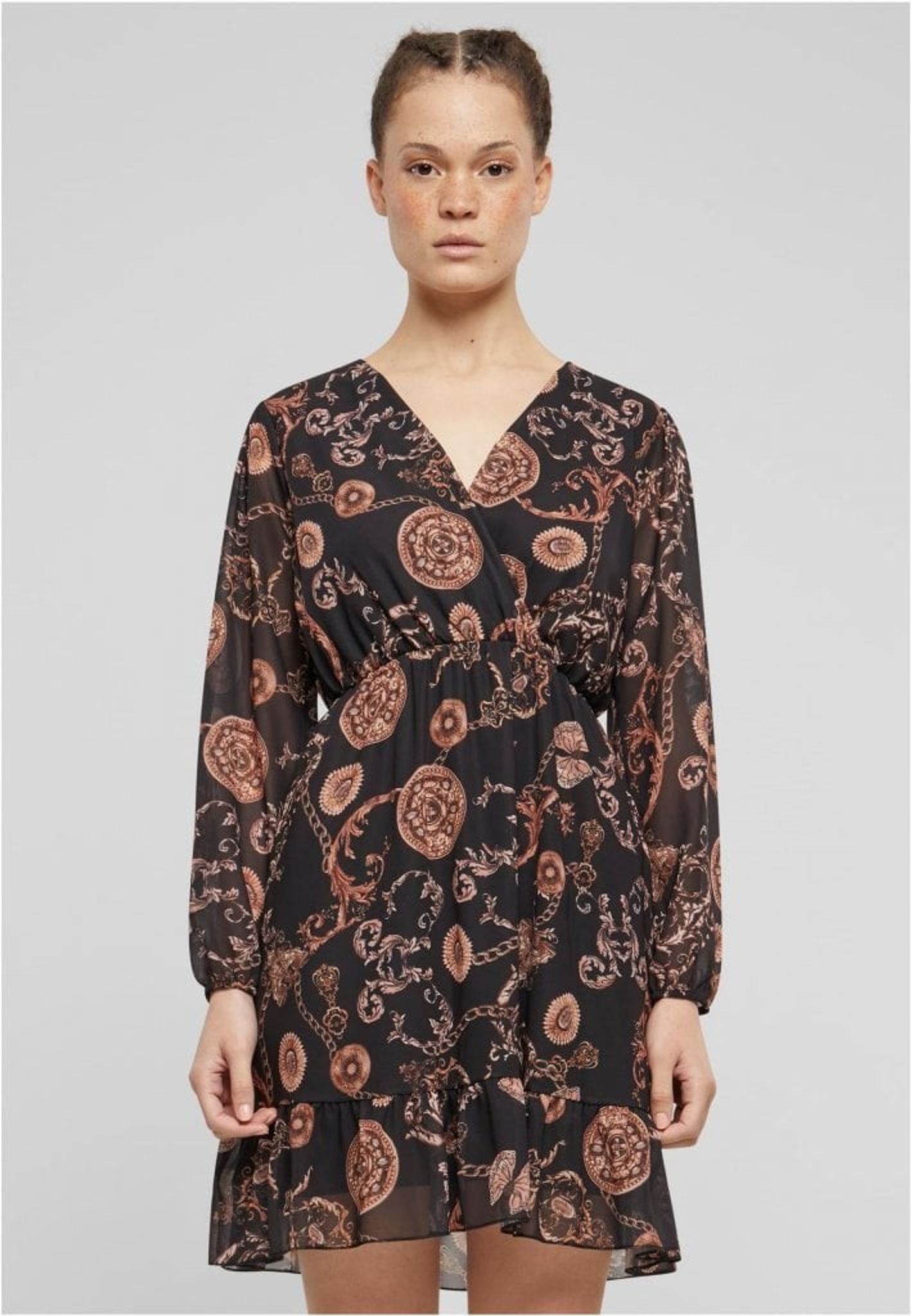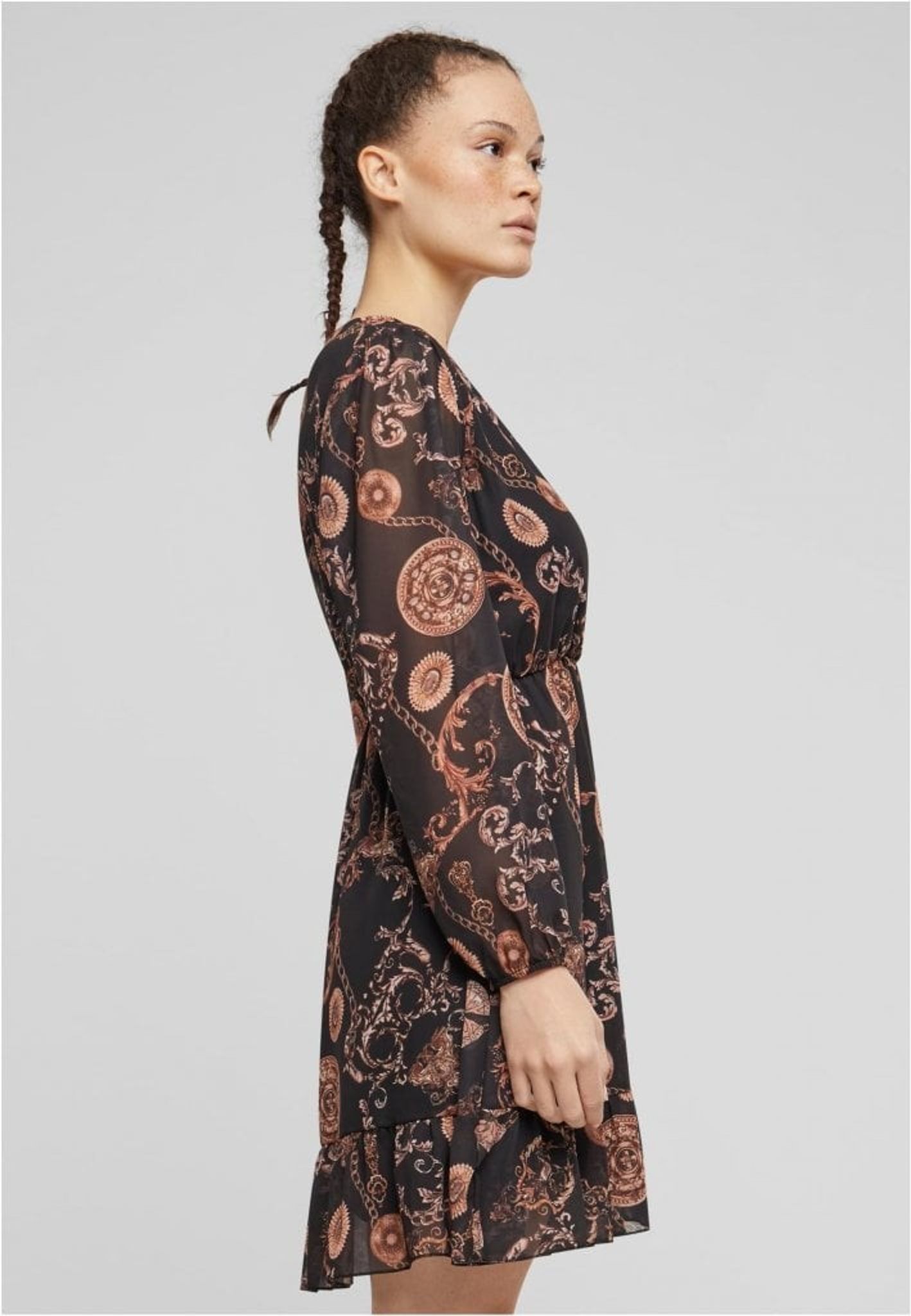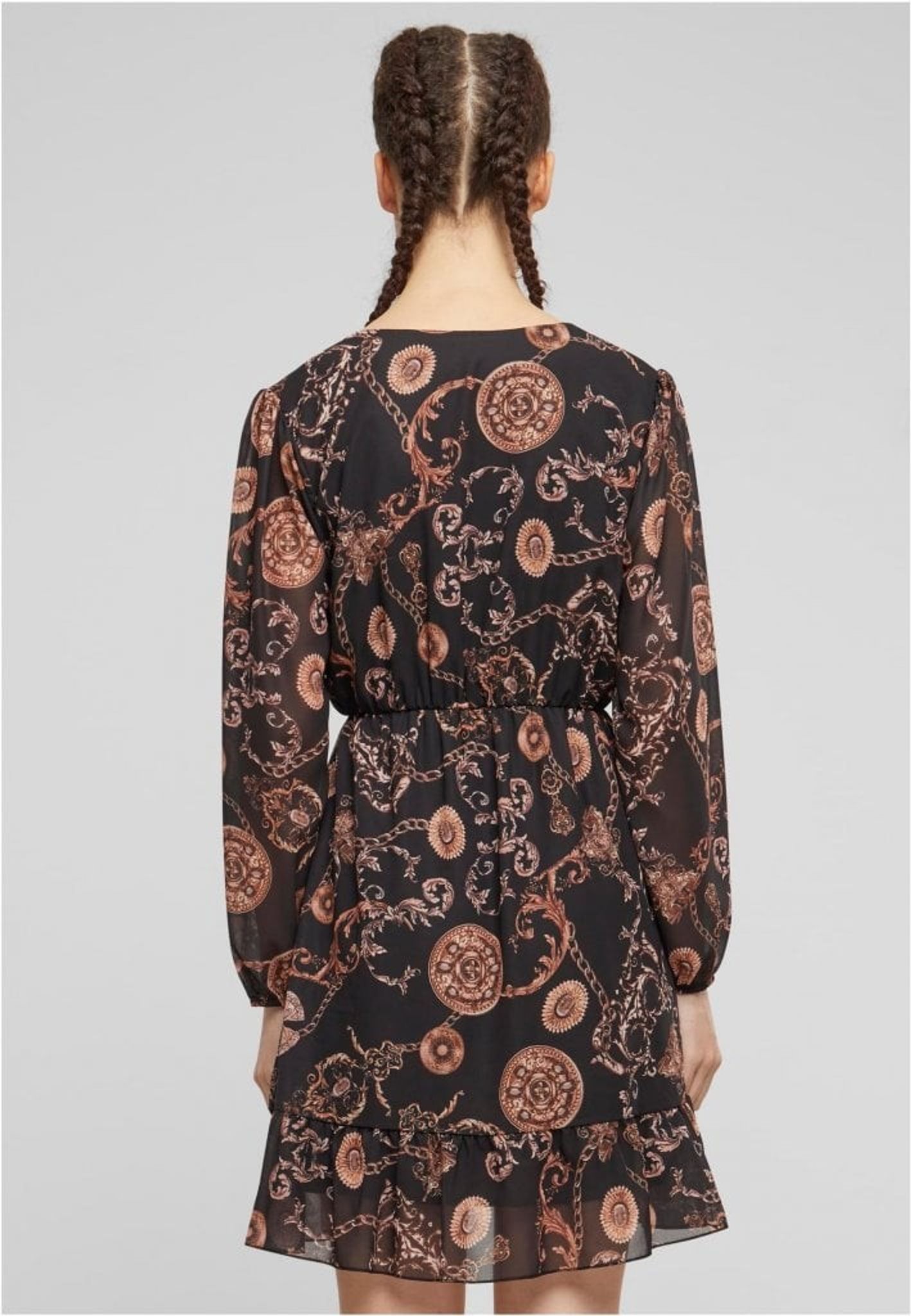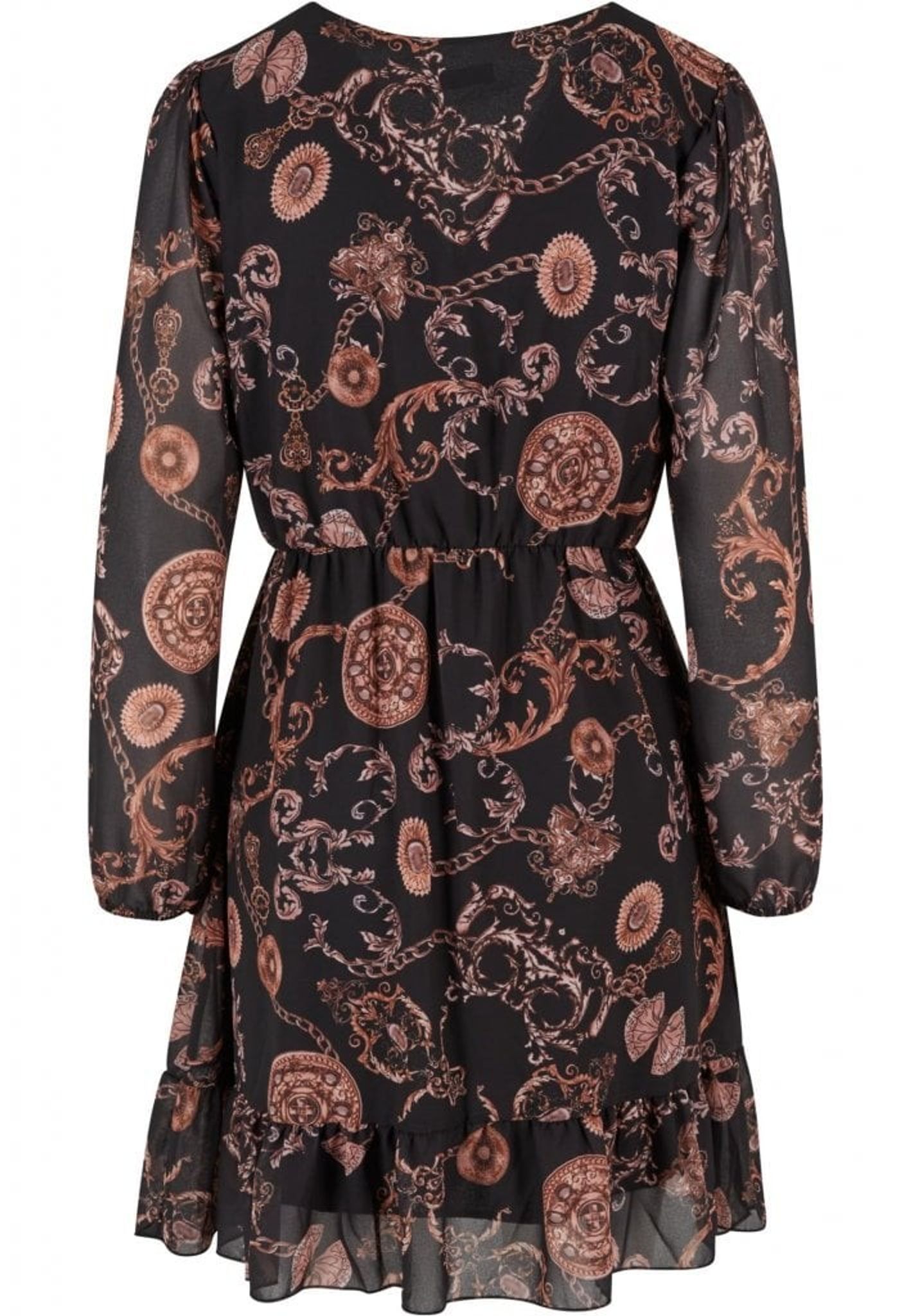 Mönstret på klänningen är ett genomgående ornamenttryck i en varm färgpalett som domineras av bruna och beiga nyanser på en mörk botten. Detta skapar en vintage känsla och gör klänningen till en iögonfallande. Mönstret är detaljerat och visar upp en blandning av botaniska och kanske även paisley-inspirerade former, vilket ger klänningen en bohemisk touch.