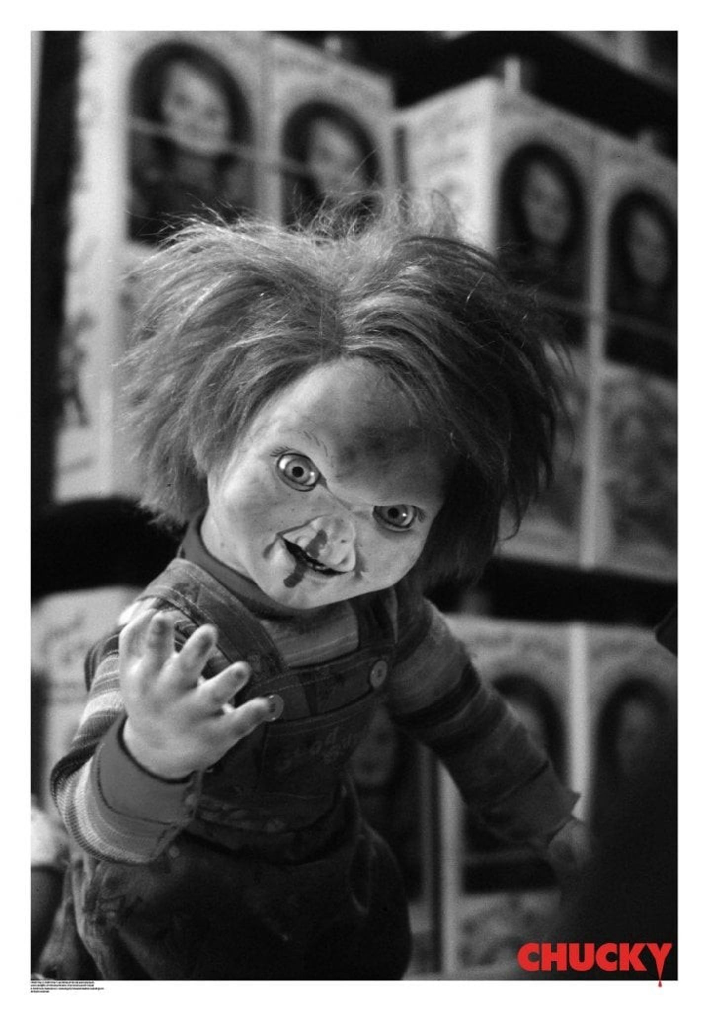 Älskar du skräckfilm? Då har vi den perfekta postern för dig! Vår Chucky BW Photo Poster är en must-have för alla fans av den ikoniska mördardockan.