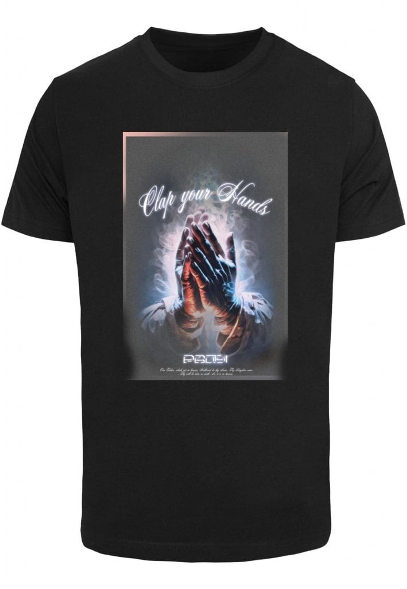 En svart t-shirt från Mister tee med trycket Calp you hands fram på bröstet.