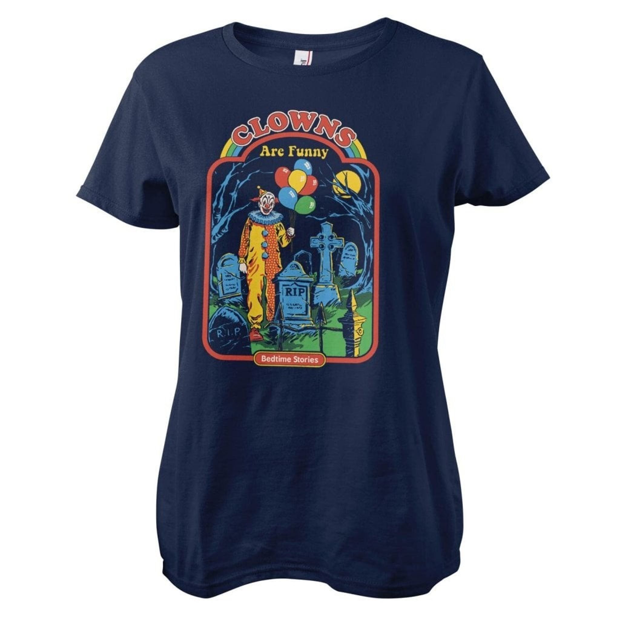 Motivet på T-shirten visar en clown i full kostym och smink, stående på en kyrkogård bland gravstenar med texten "R.I.P." på dem. Över bilden står texten "CLOWNS Are Funny" och under bilden finns texten "Bedtime Stories". Det humoristiska i trycket kan vara kontrasten mellan clowner, som vanligtvis associeras med glädje och skratt, och den dystra miljön på en kyrkogård som vanligtvis förknippas med sorg och rädsla. Det kan vara en ironisk kommentar till att vissa människor faktiskt är rädda för clowner, och det faktum att clowner här placeras i en kontext som traditionellt sett inte är rolig kan vara en lekfull vändning på förväntningarna.