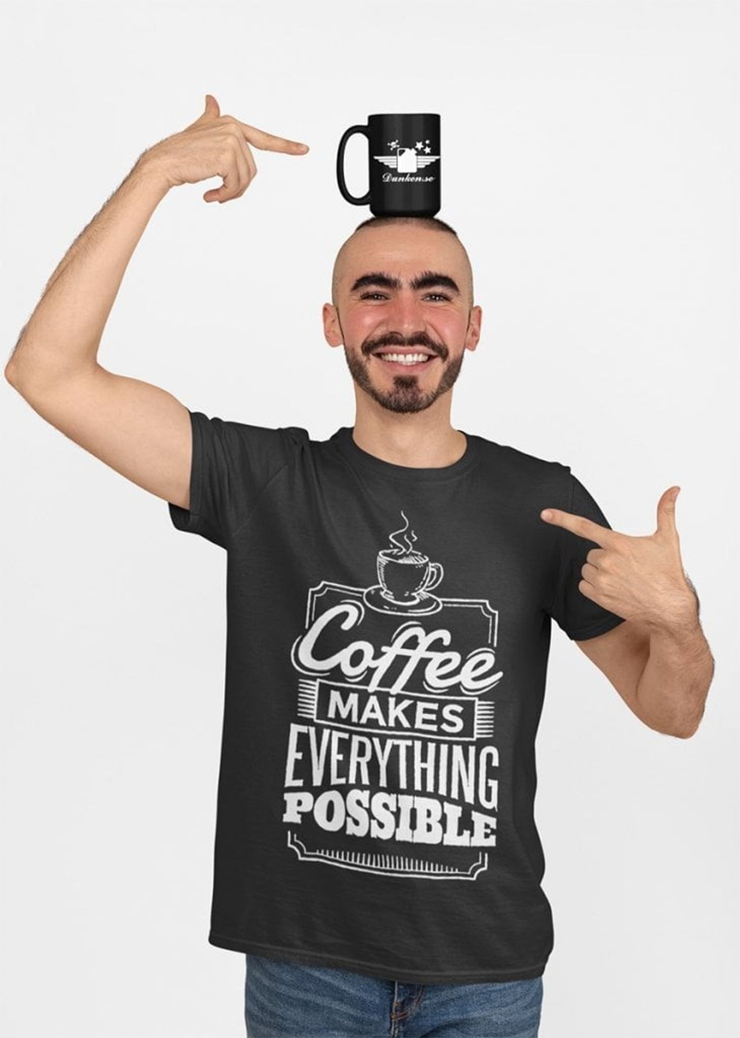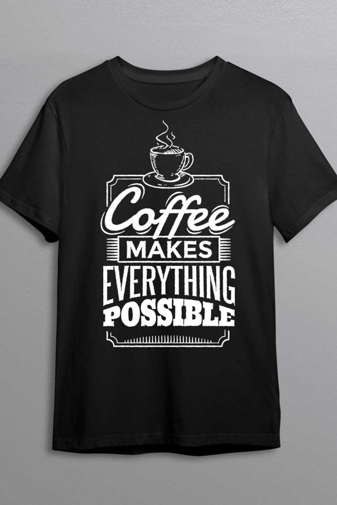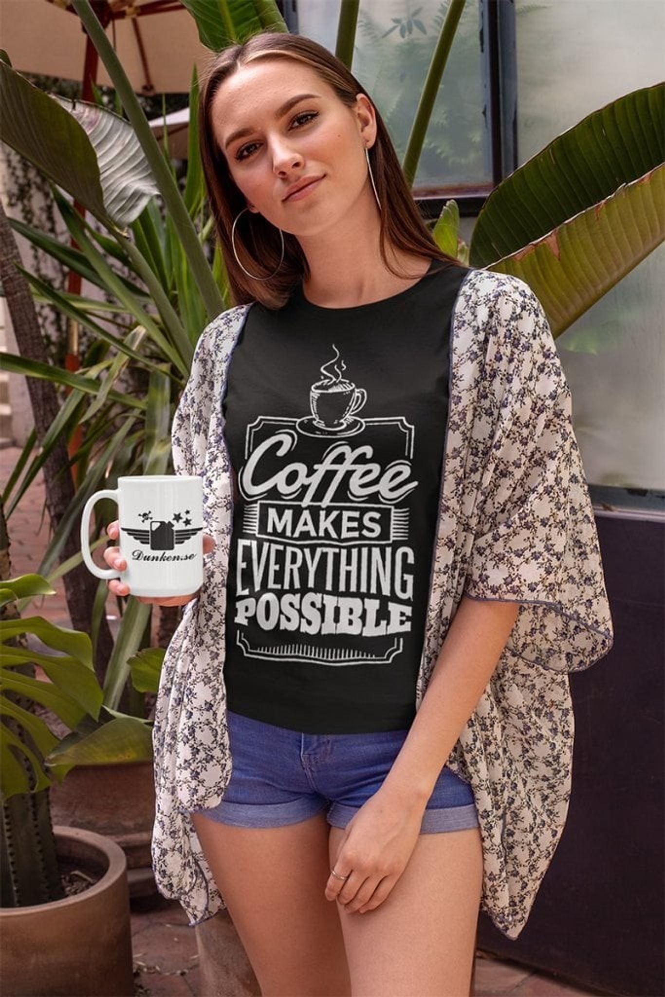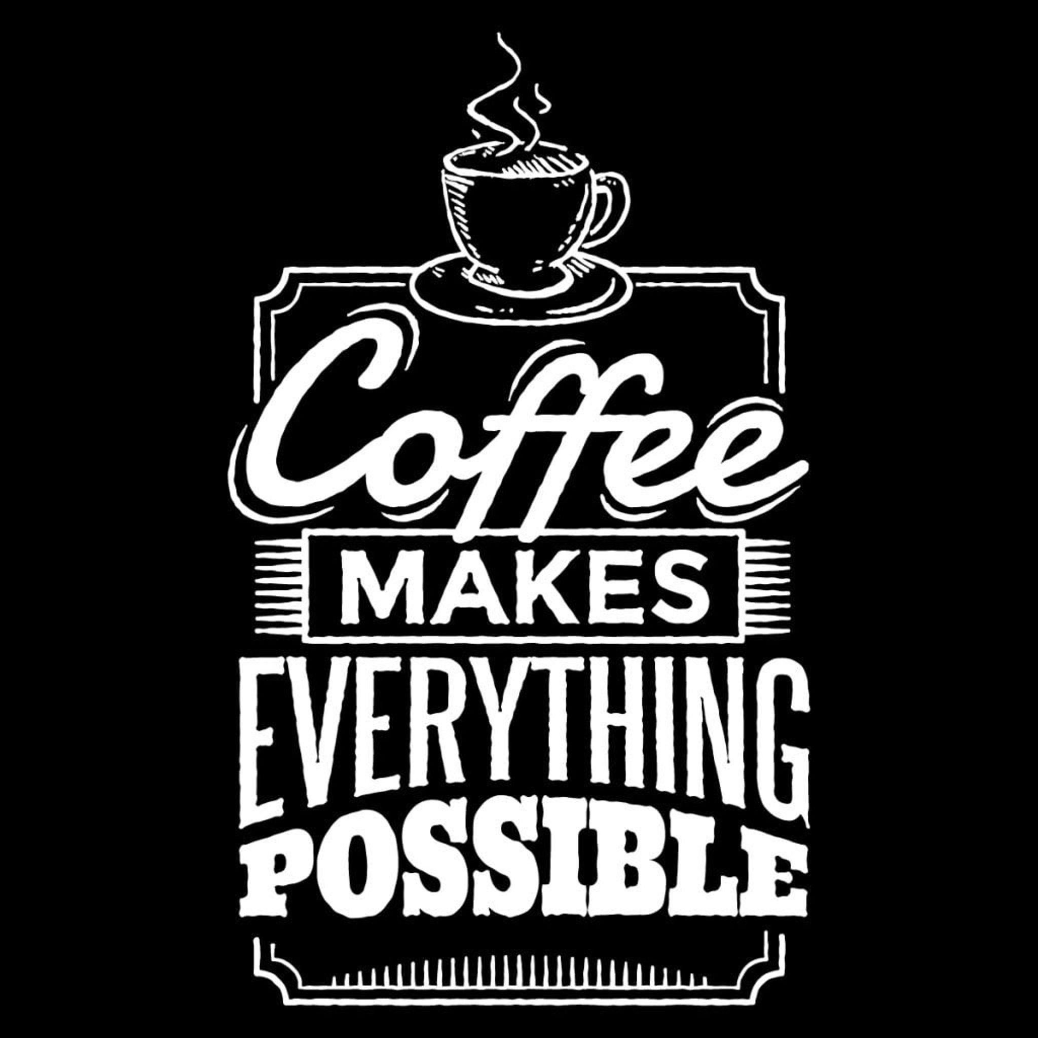 Denna svarta T-shirt är en koffeinboost för garderoben och det perfekta valet för kaffeentusiaster vars morgonbrygd är grunden för dagens alla bedrifter. Med det peppande budskapet "Coffee Makes EVERYTHING Possible" är denna T-shirt en påminnelse till den magiska bönans förmåga att förvandla det omöjliga till möjligt, en kopp i taget.