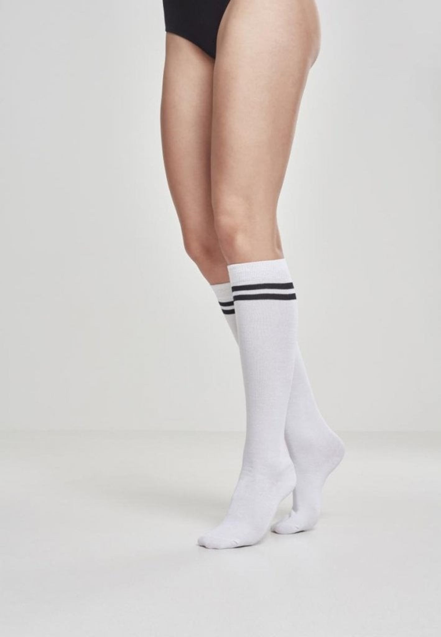 De dam college strumpor från Urban Classics imponerar med sitt varma tyg och de två kontrasterande randarna på knät. De fungerar också bra som ett komplement till hotpants, till exempel.