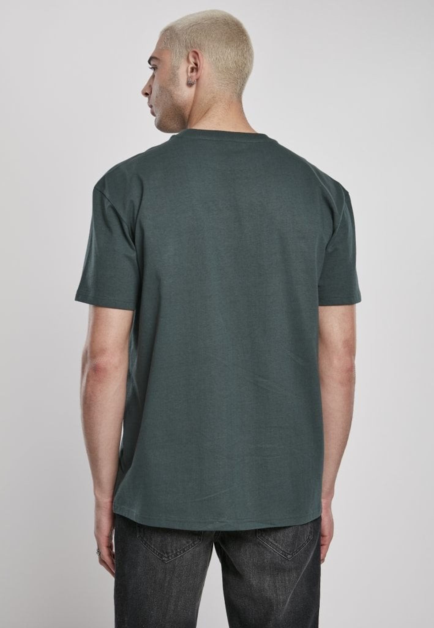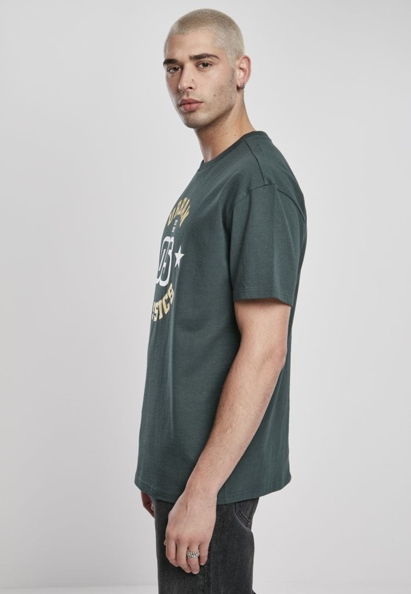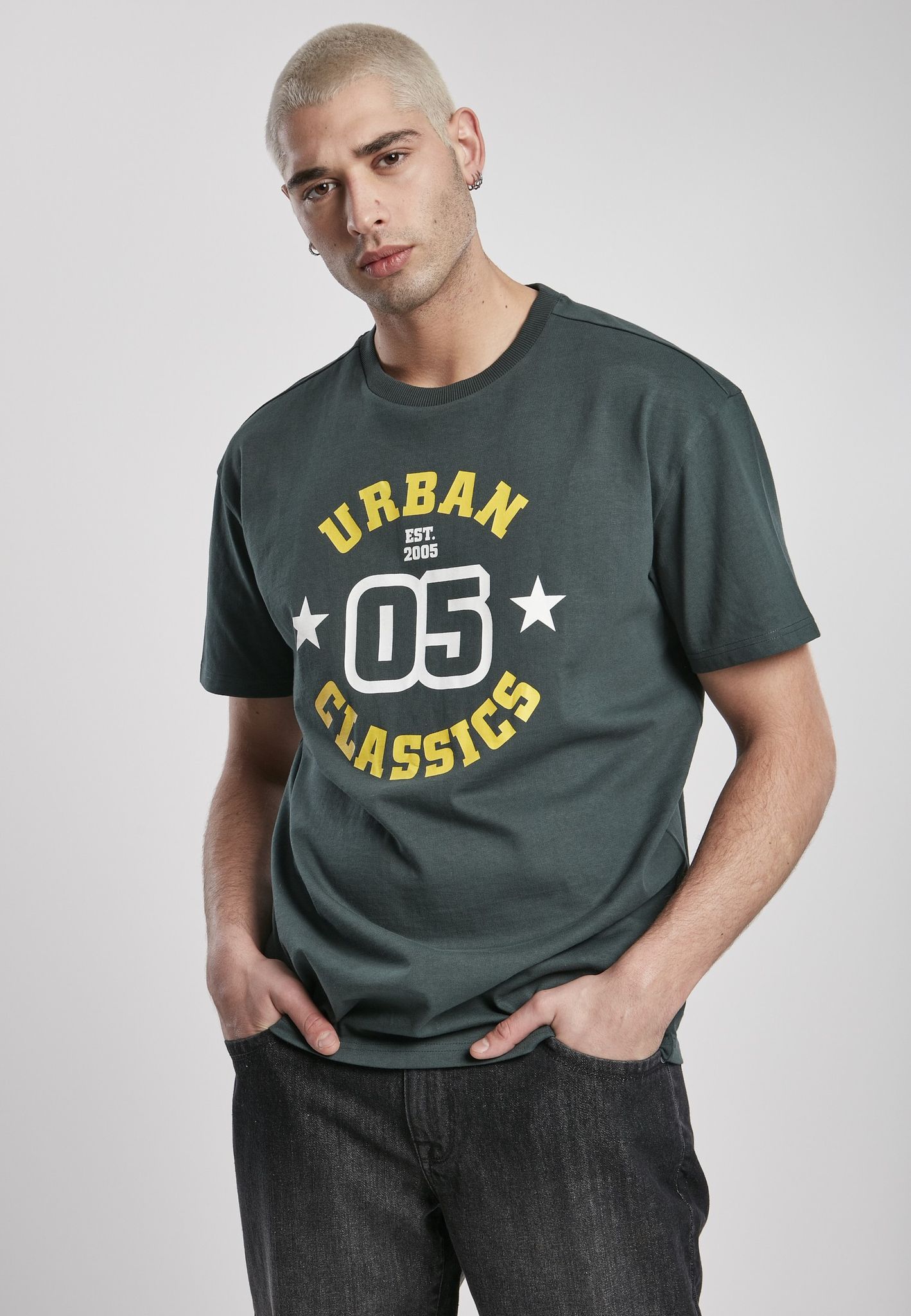 En flaskgrön T-shirt från Urban Classics med ett motiv som får inspiration från amerikanska college-kläder.