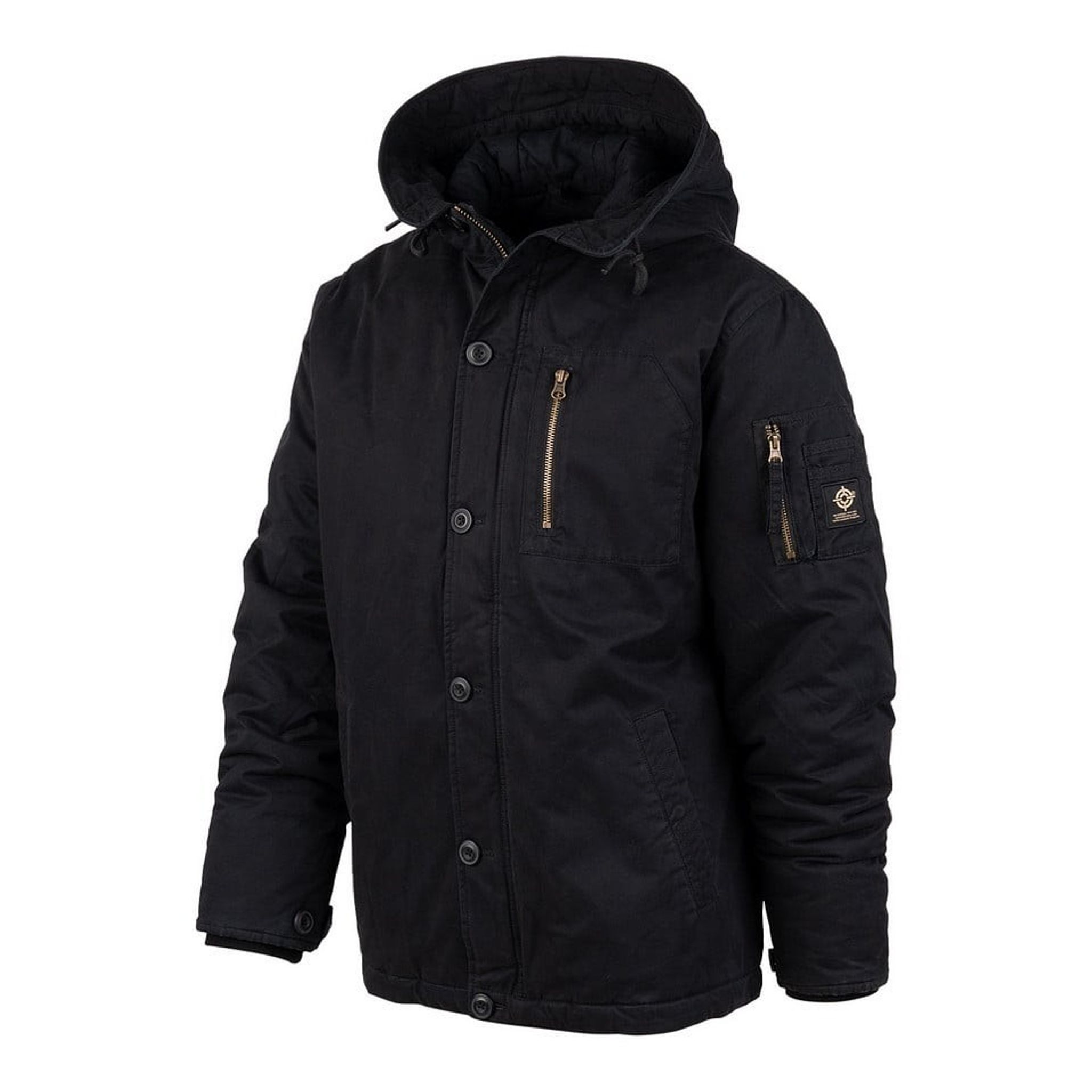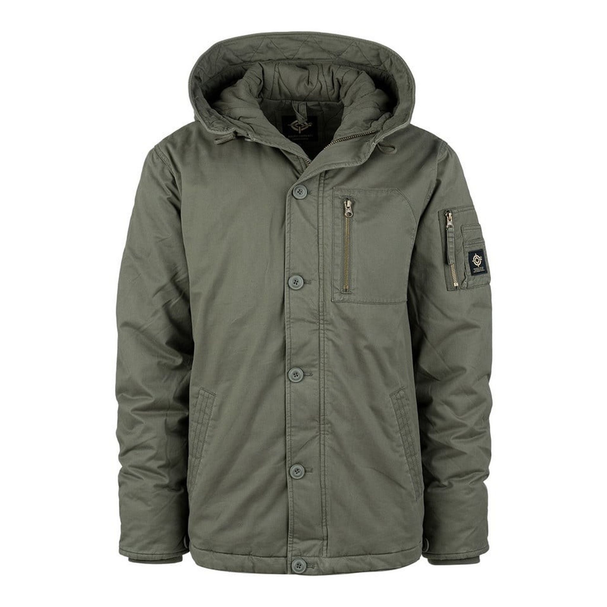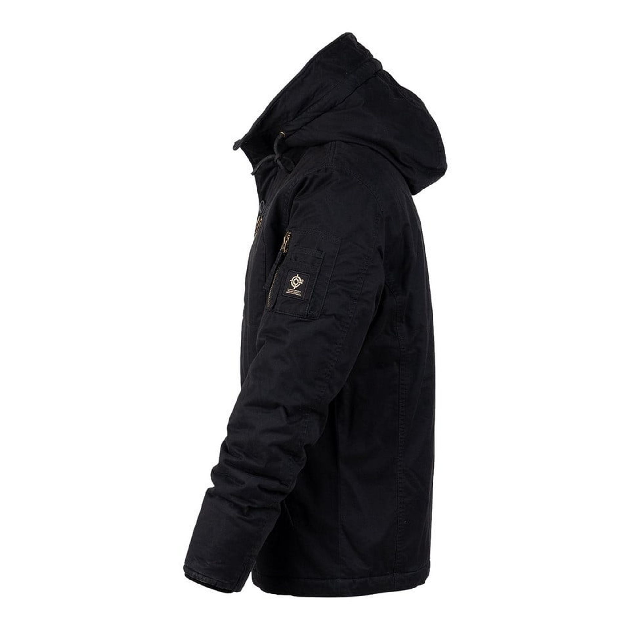 Funktioner inkluderar en tvättad bomulllook, borstad look på SAB®-dragkedjor, två handfickor med fleecefoder och tryckknappsstängning, en bomberficka på vänster ärm med plats för pennor, en innerficka med dragkedja, samt en bröstficka med dragkedja. Huvan är fodrad och justerbar, och insidan har ett mönstrat foder.