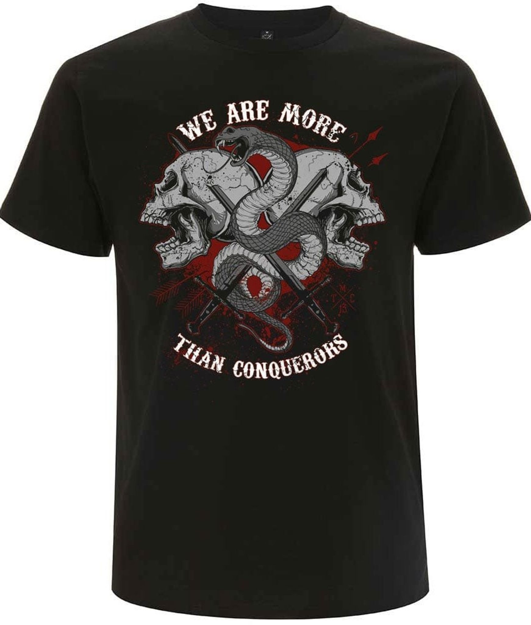 En läcker t-shirt med texten: We are more than conquerors och prydd med det snygga döskalletrycket som har en orm slingrandes emellan.