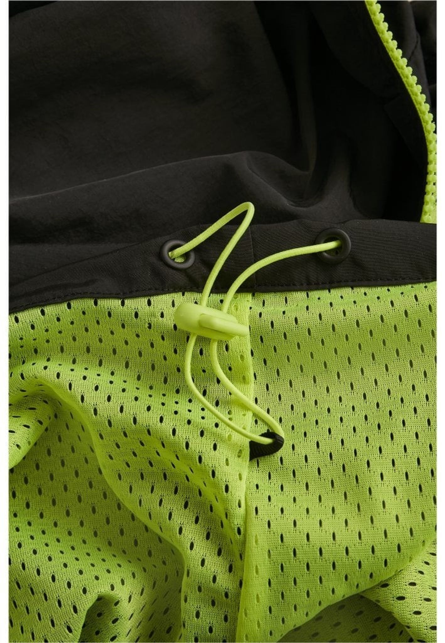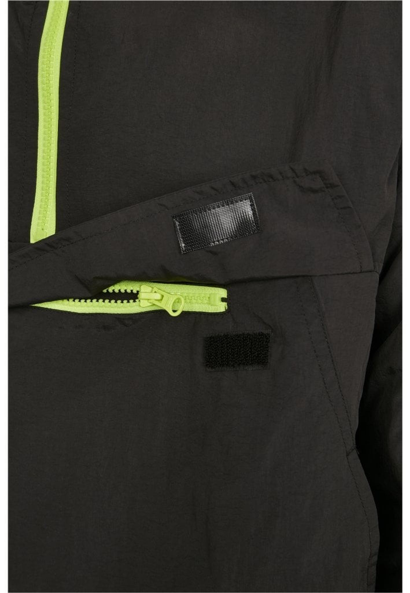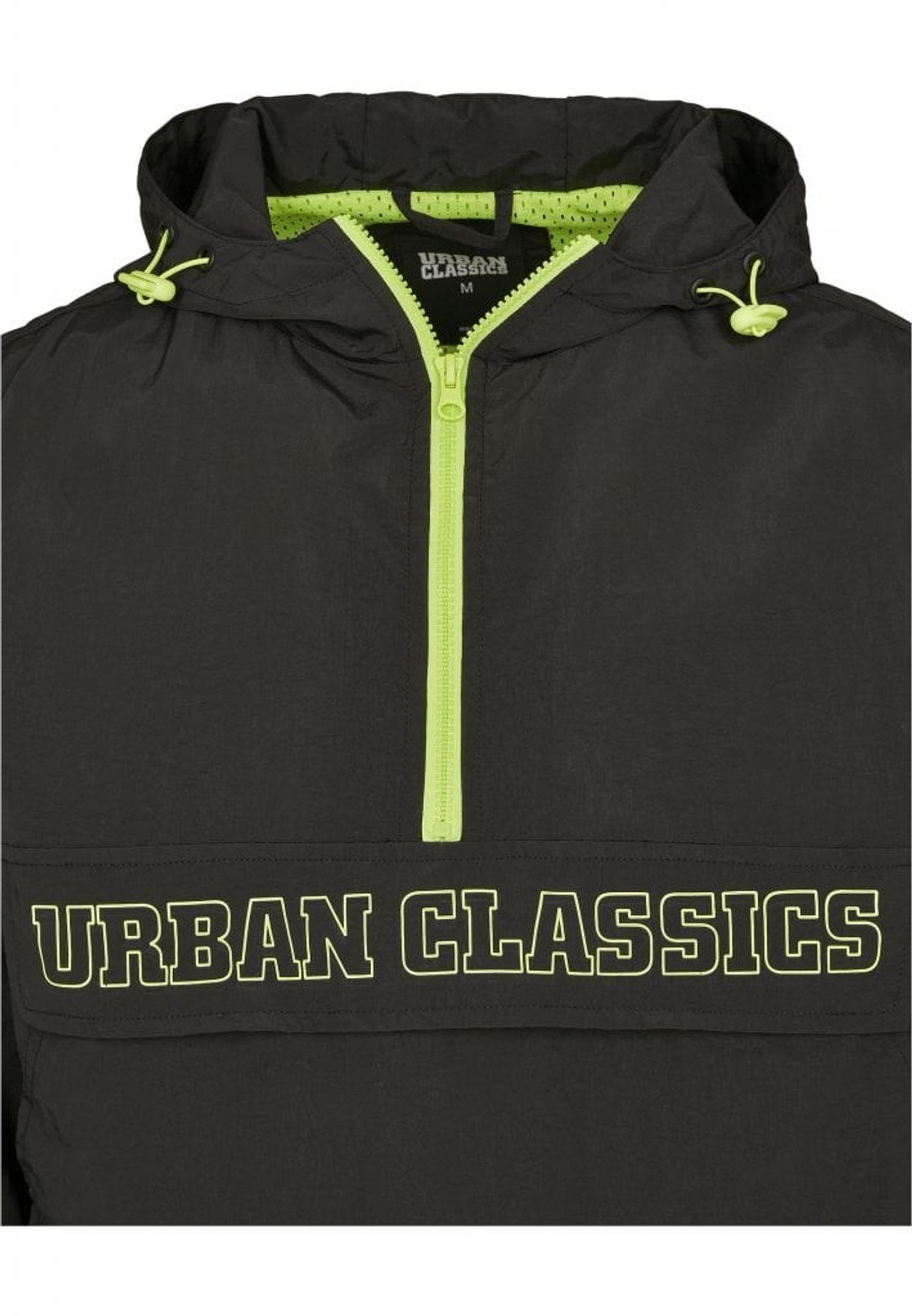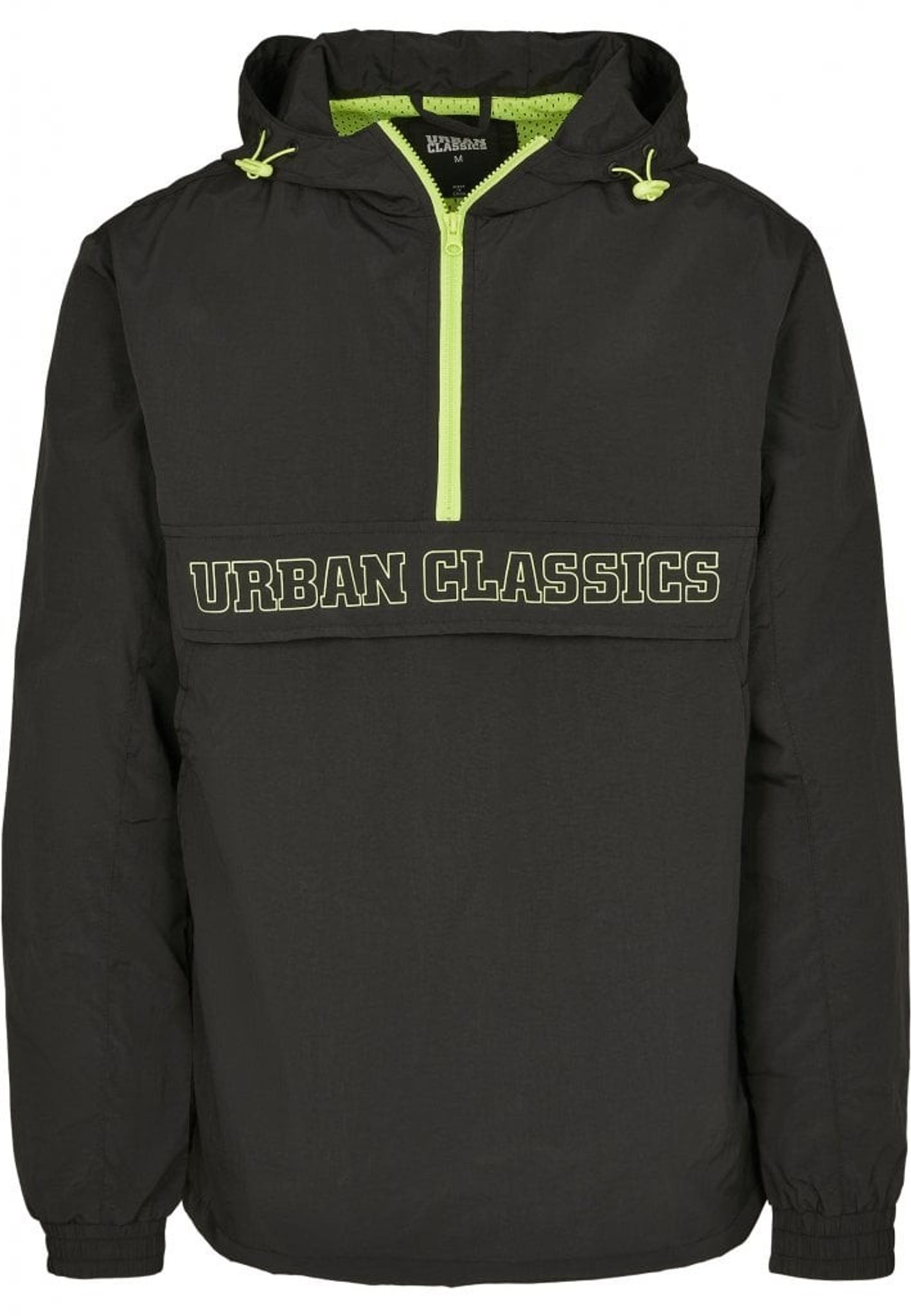 Svart pullover jacka med dragkedja, dragsko och logga över magen i electriclime-färg.