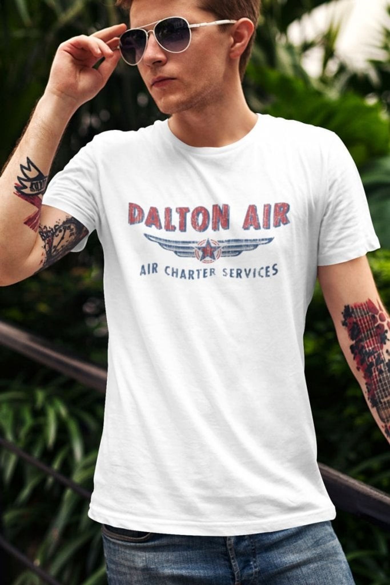 Med motivet "DALTON AIR Air Charter Services" får du chansen att känna dig som en äkta flygkapten. Den robusta typografin och de patriotiska färgerna ger en känsla av äventyr och professionalism som är svår att motstå. Så dra på dig denna T-shirt och känn vinden i håret, för himlen är inte längre gränsen!
