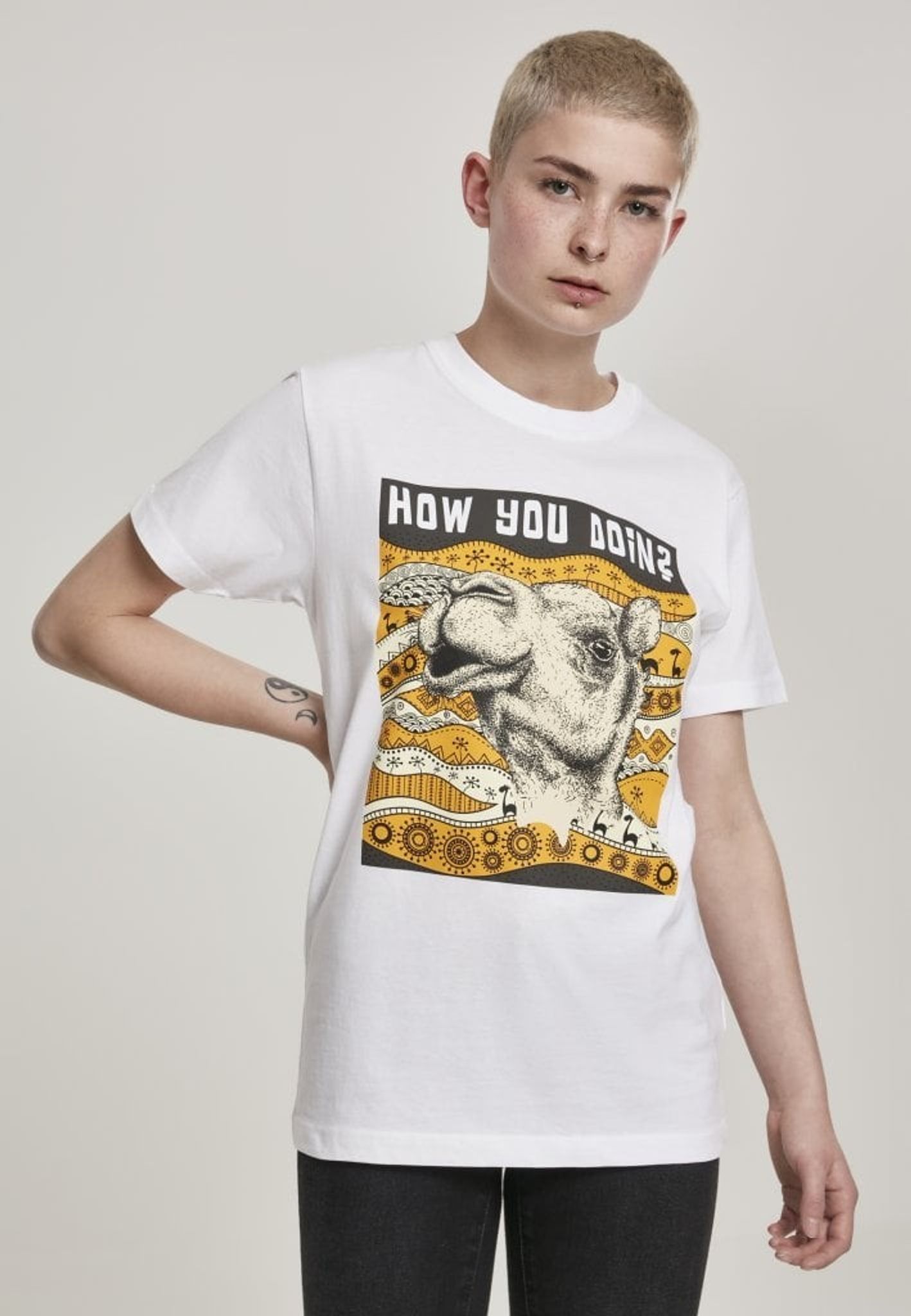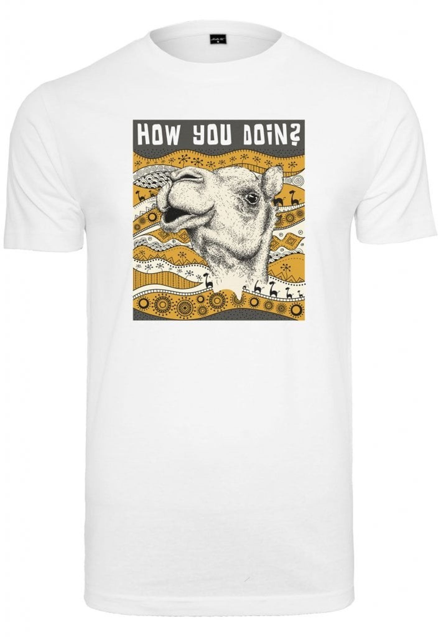 En vit t-shirt med tryck fram på bröstet med frågan HOW YOU DOIN?.