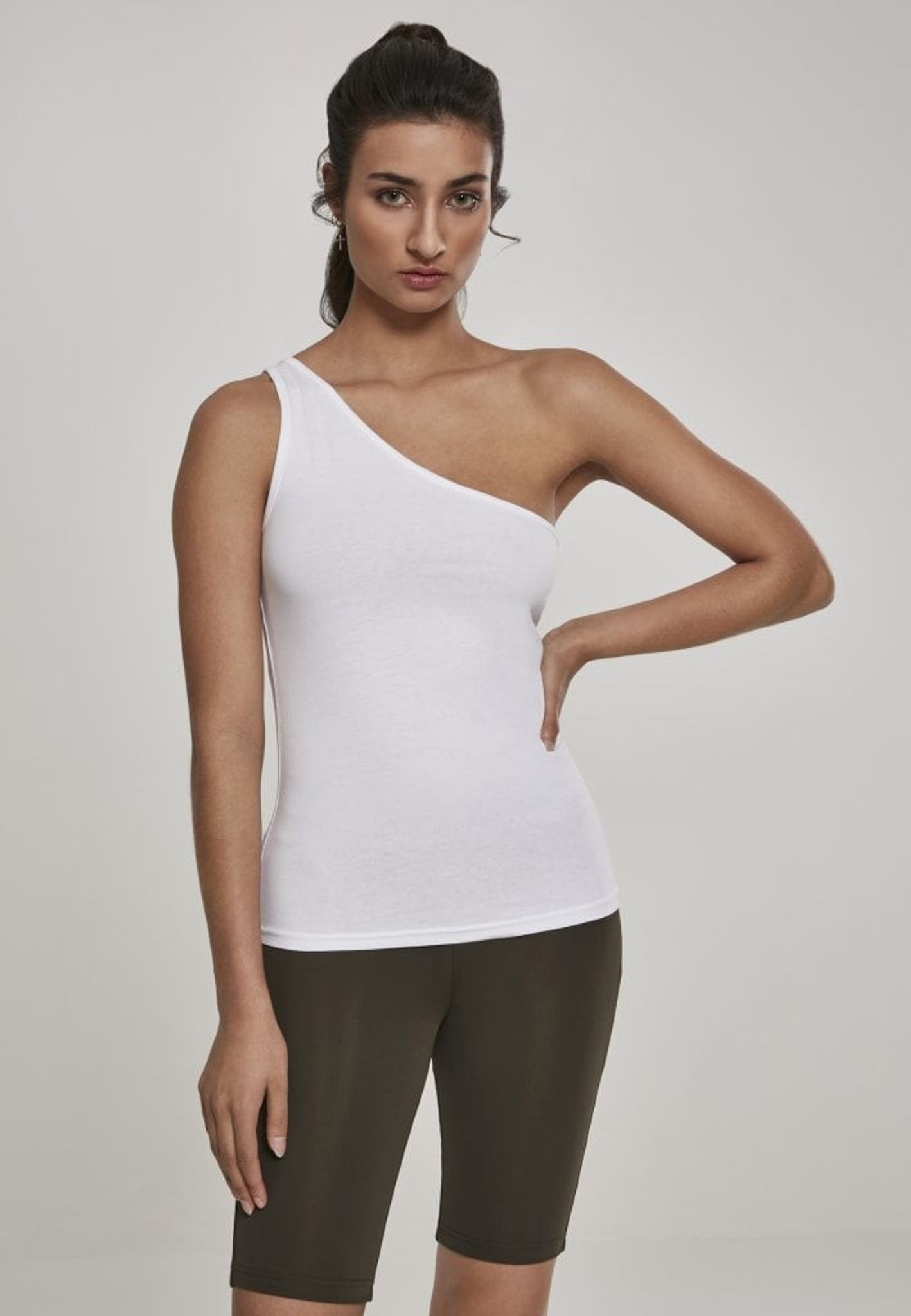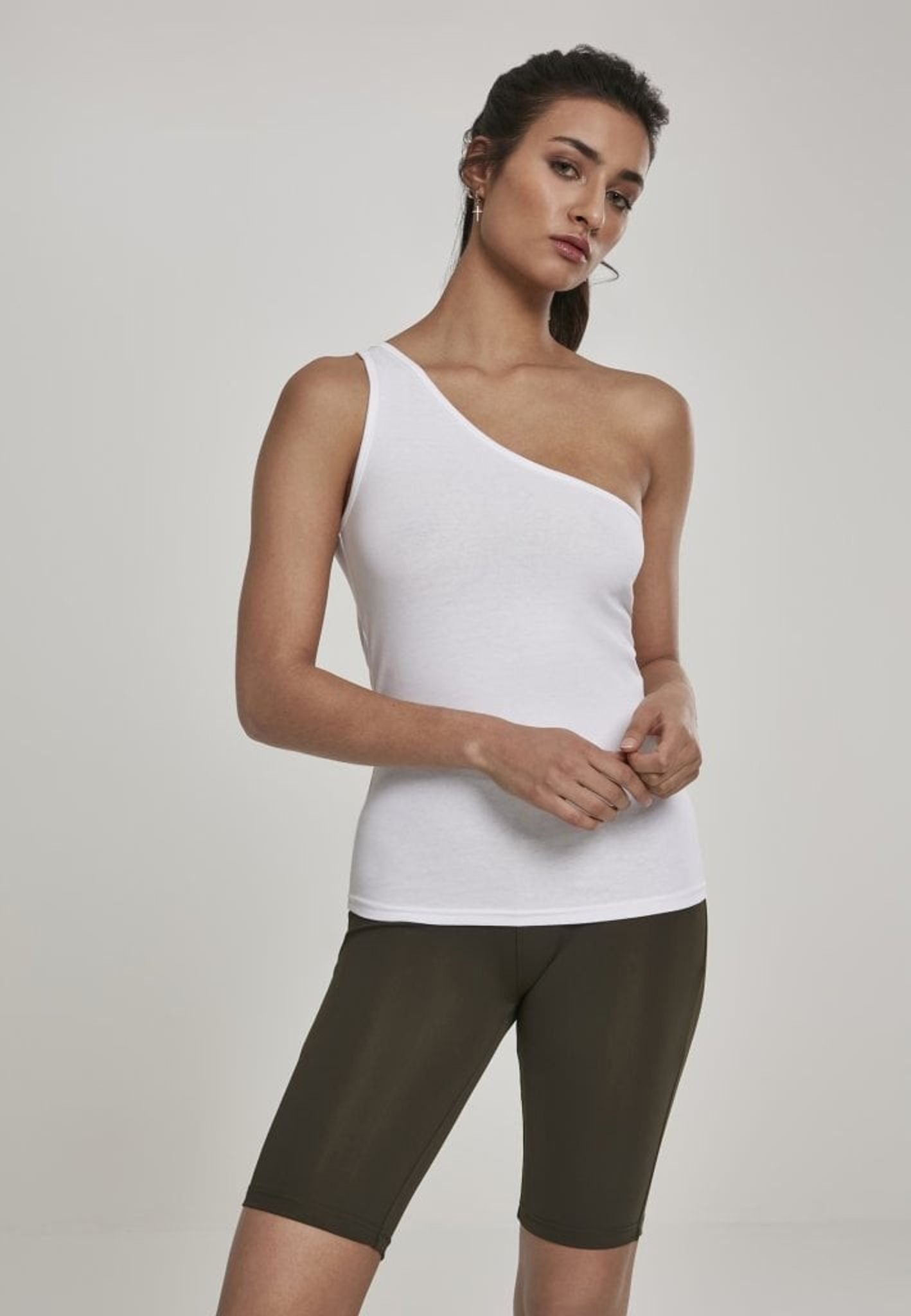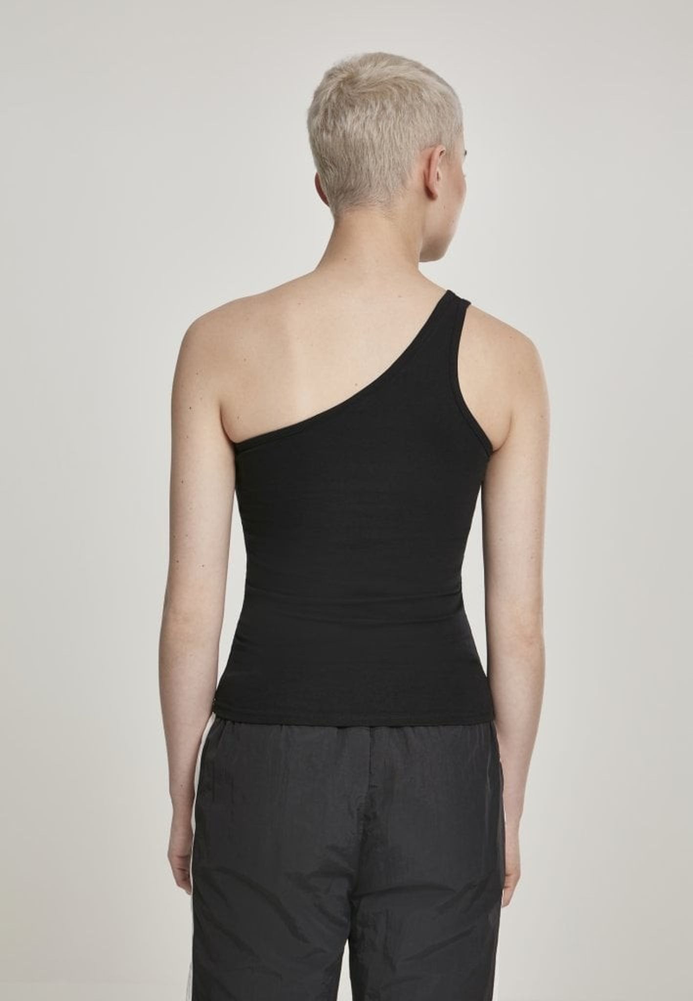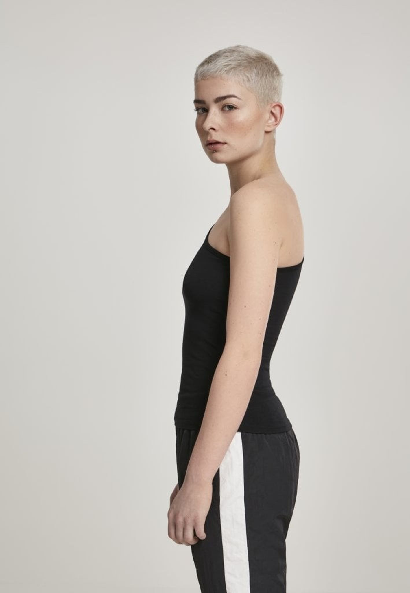 Ett linne som har ett brett axelband med en sned skärning över bröstet. Linnet är tillverkat i följsam stretchtrikå och är lätt figursydd.