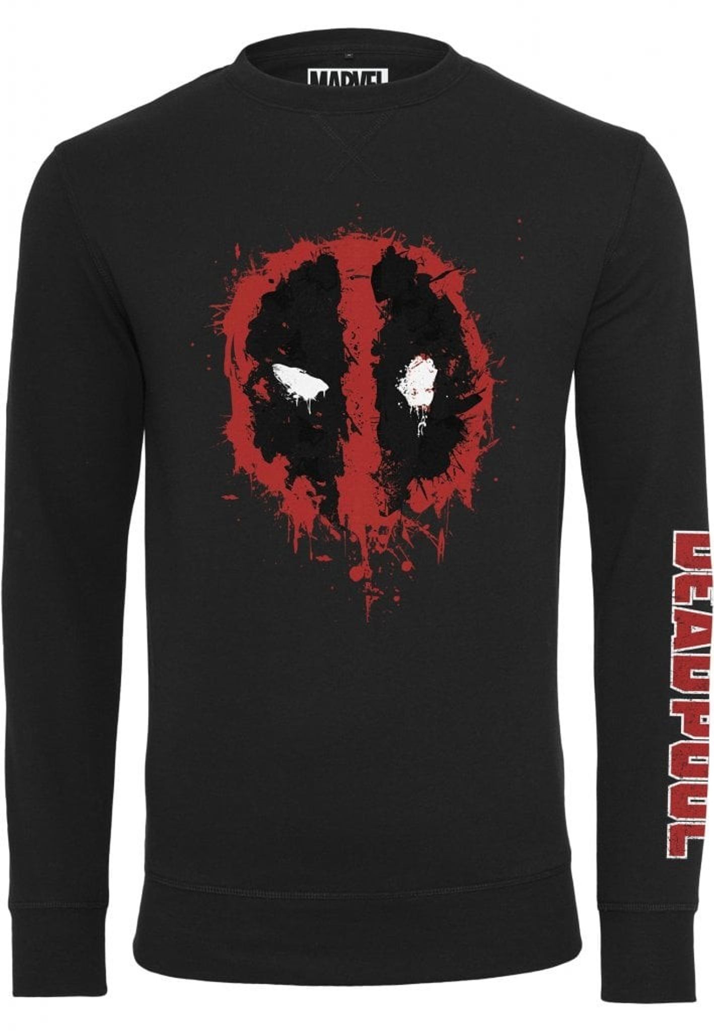 Här syns den humoristiska superhjälten i ett splatter på bröstet av en svart sweatshirt. På armen hittar du Deadpools logga.