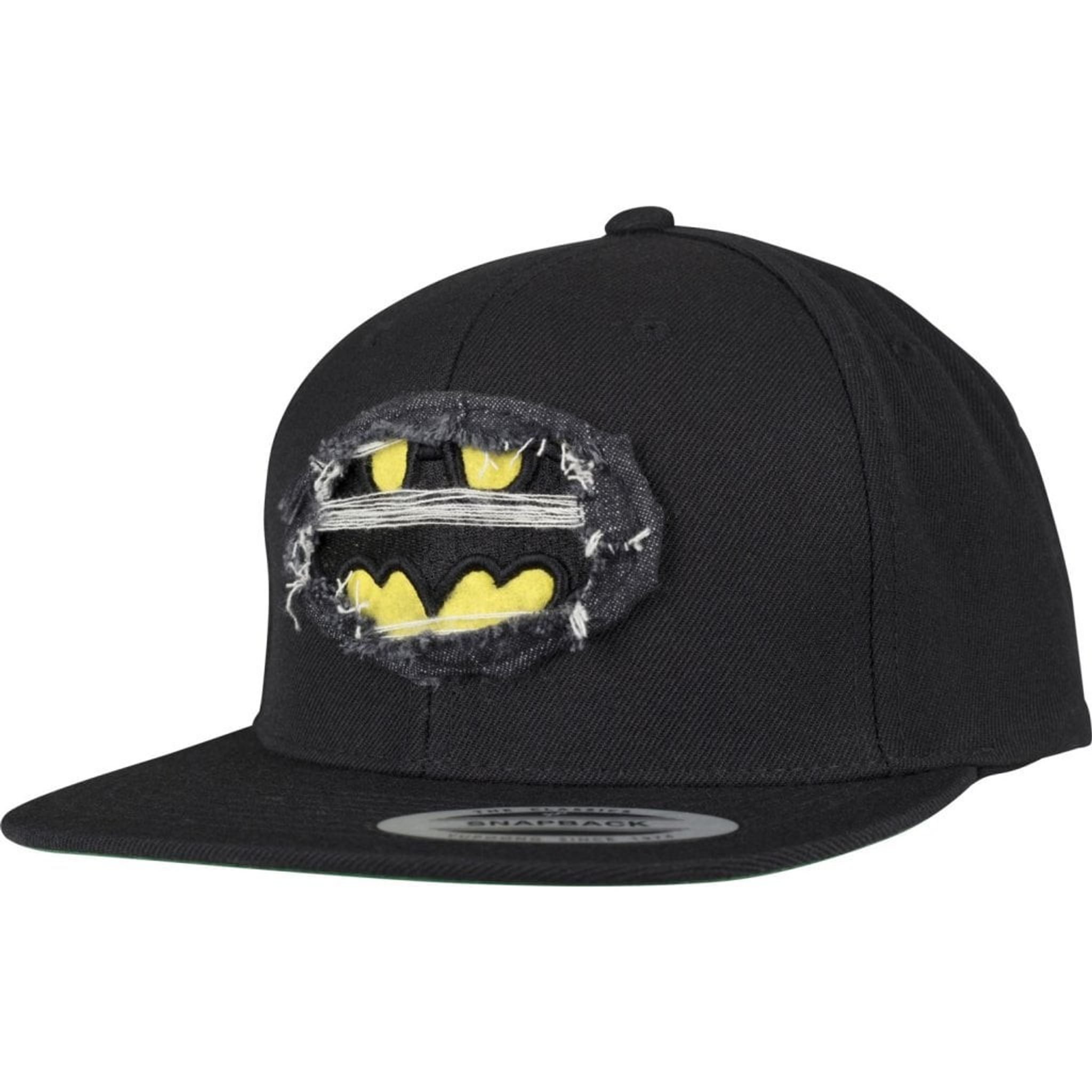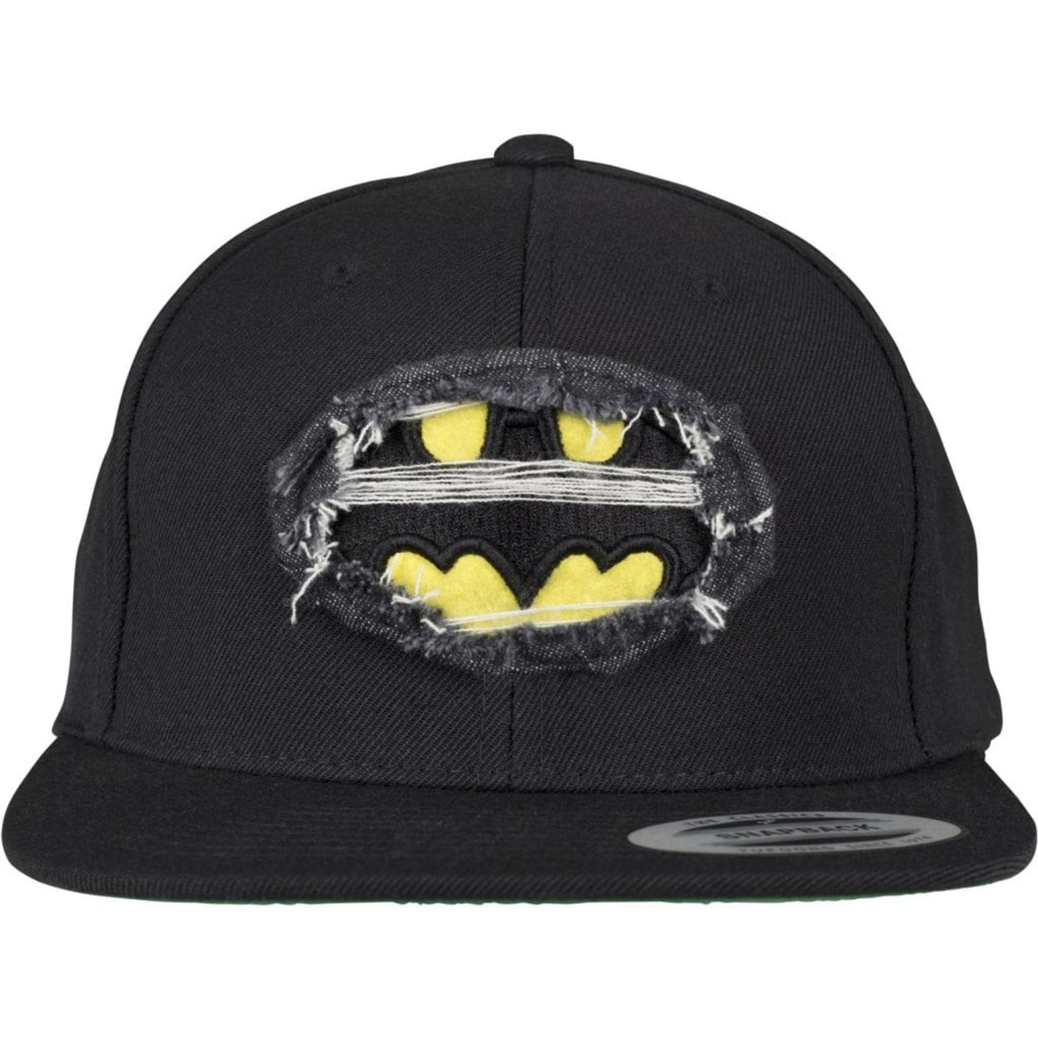 En riktigt snygg snapback keps med en broderad Batman-logga. Loggan har sedan blivit inringad av slitna trådar som ger hela loggan en fräck sliten look.