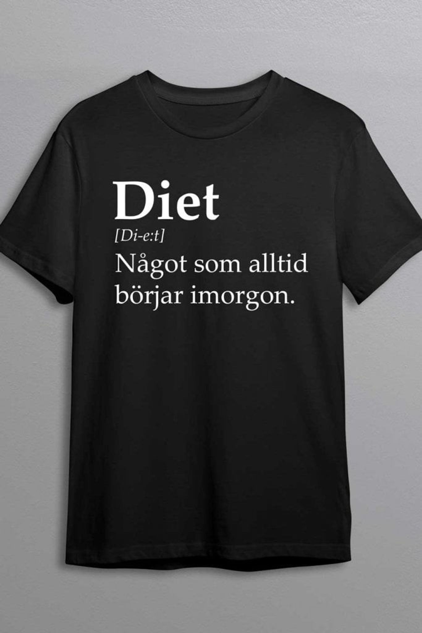 Denna svarta T-shirt är designad för att få fram ett leende med sitt ärliga och humoristiska budskap. På framsidan står det skrivet med självsäker stil: "Diet [Di-et] Något som alltid börjar imorgon." Det är en humoristisk nick till den eviga optimismen och det ständiga uppskjutandet som så många av oss är skyldiga till när det gäller kost och träning.
