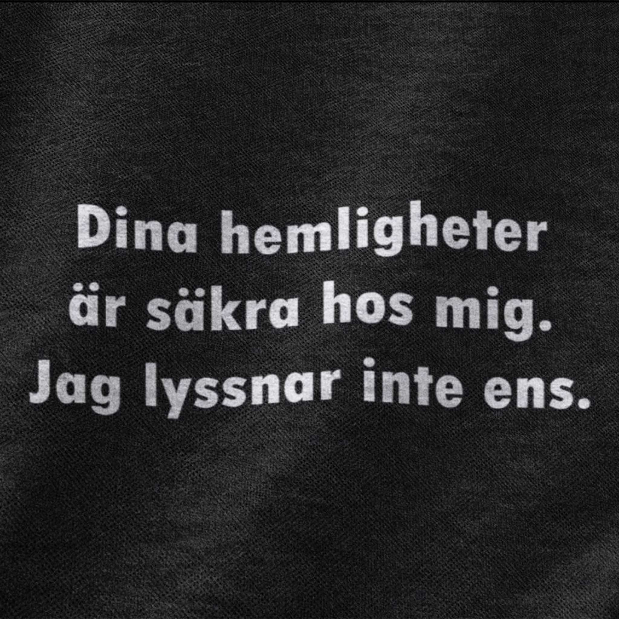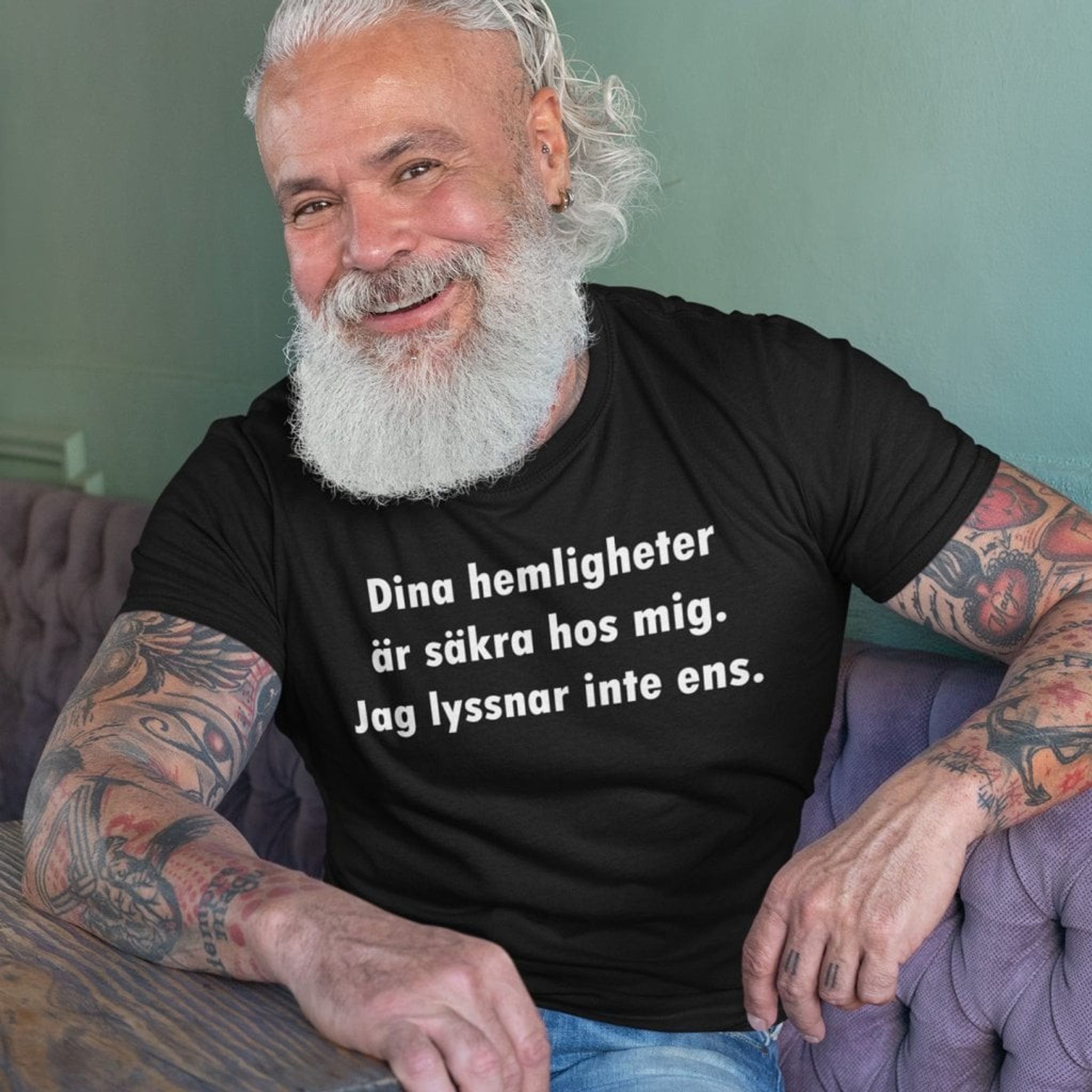 Denna svarta T-shirt är en riktig ice-breaker med sin vassa humor. Med texten "Dina hemligheter är säkra hos mig. Jag lyssnar inte ens." levererar den en skämtsam och självironisk kommentar som garanterat drar till sig skratt och kanske en och annan igenkännande nick.