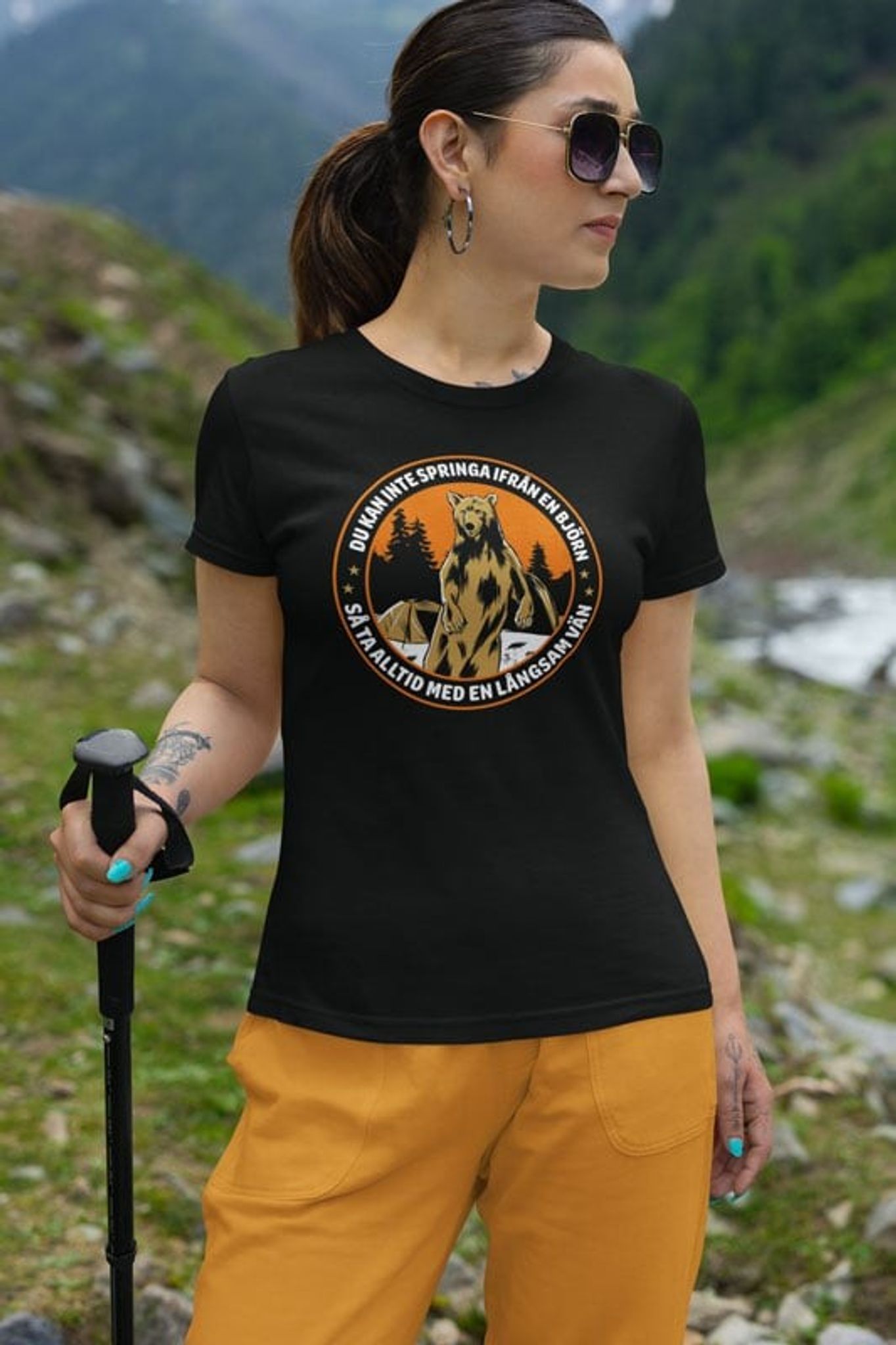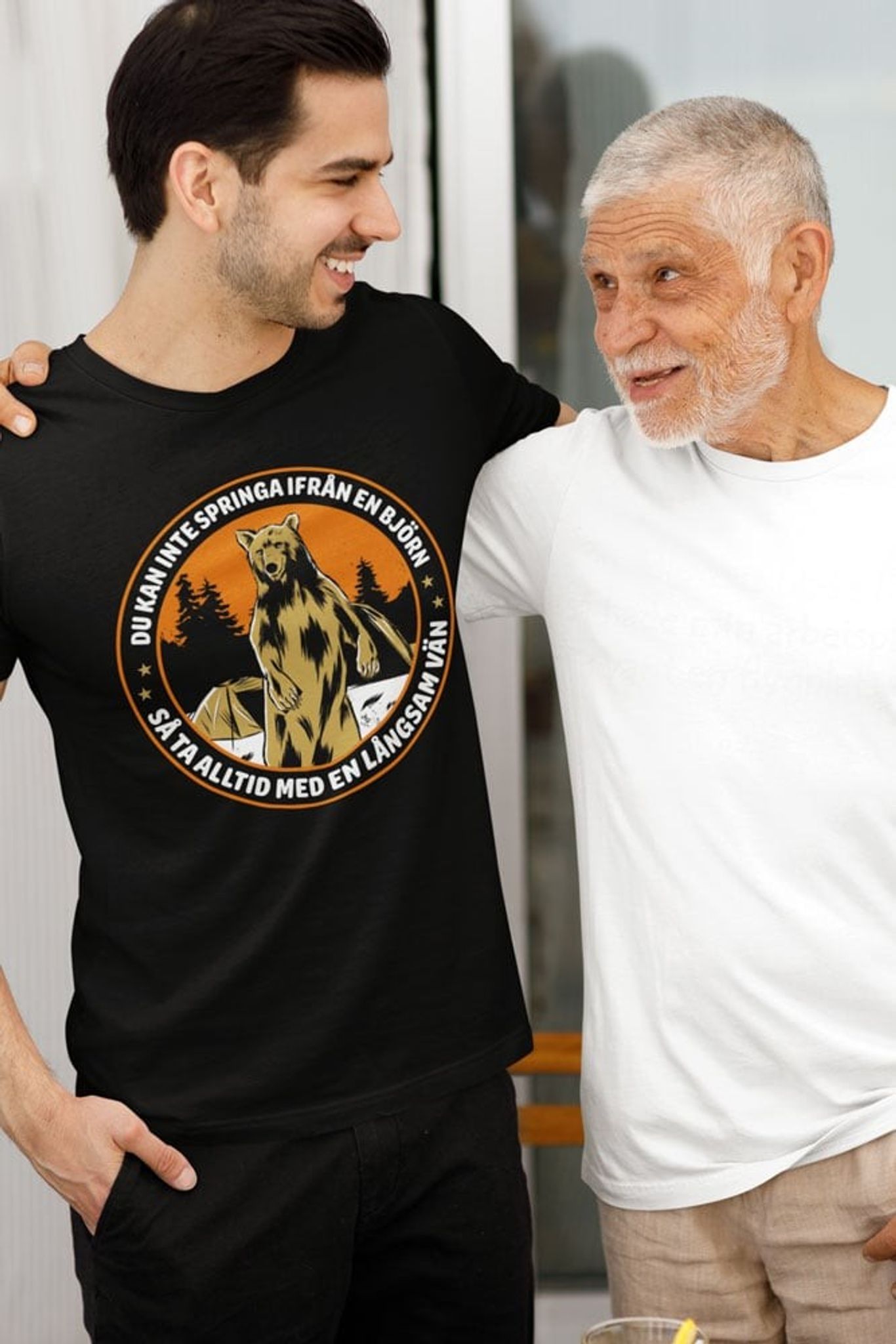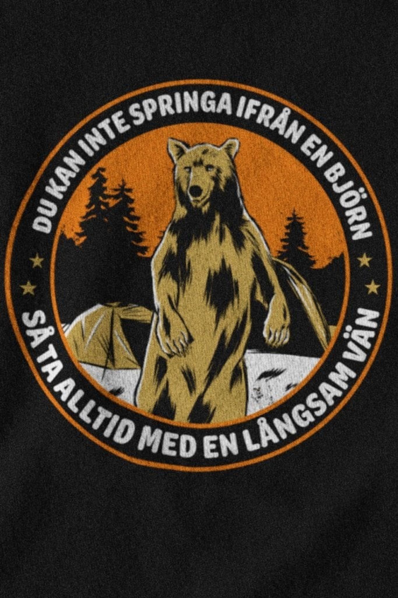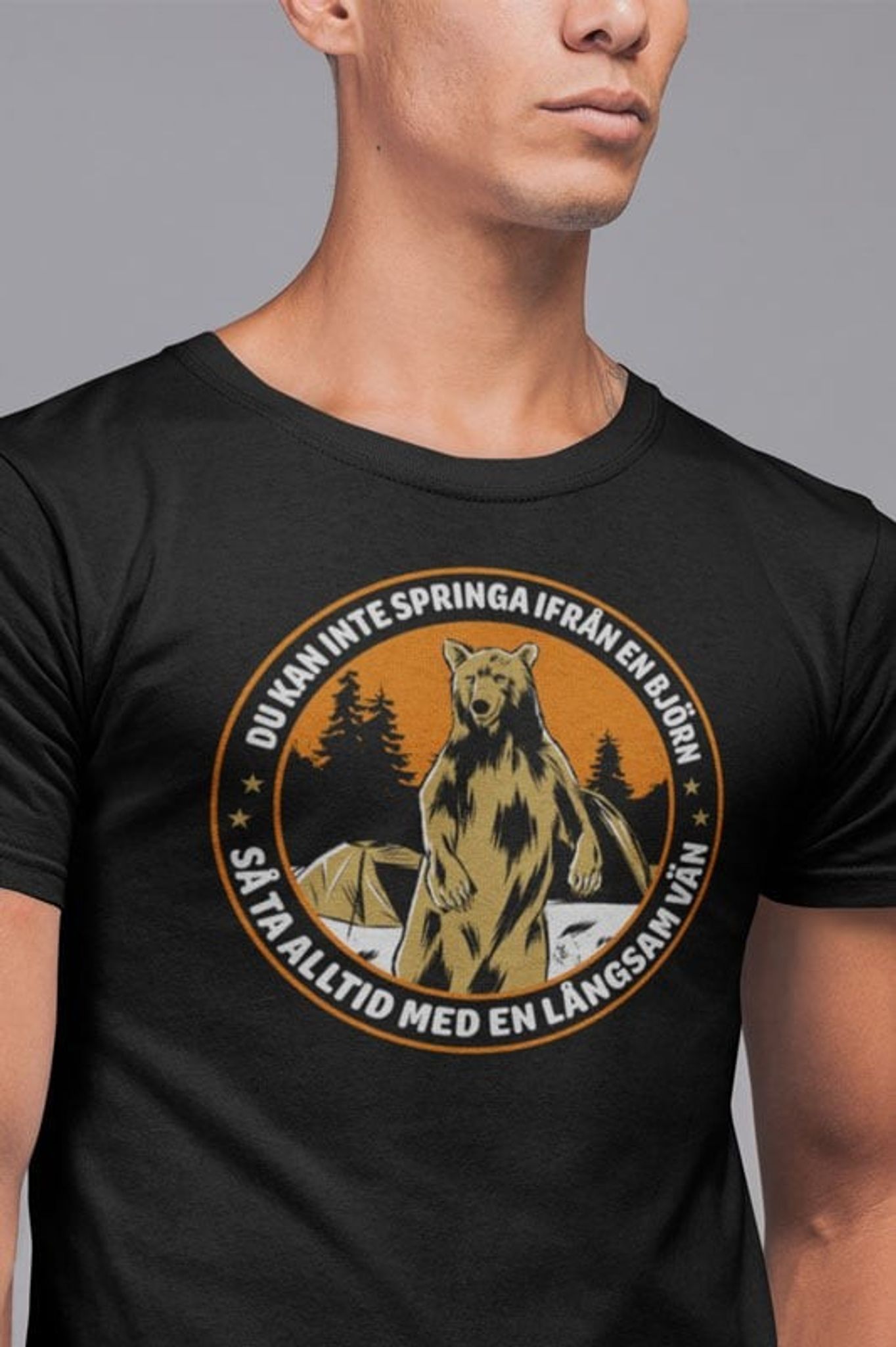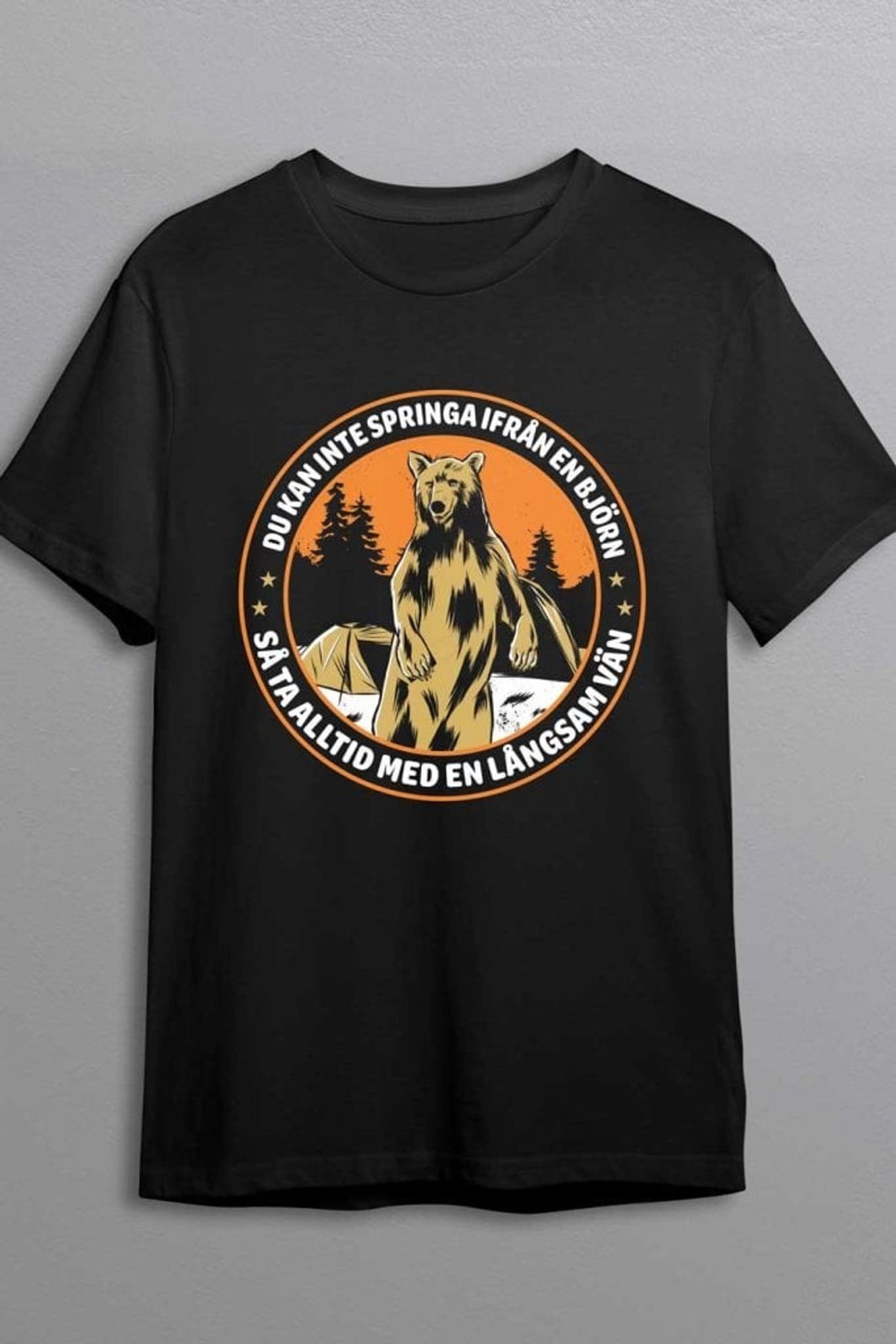 Det är en påminnelse som både roar och varnar. När du är ute i vildmarken är det bra att vara förberedd, och om du inte kan vara snabbast, ja, då är det bästa alternativet att inte vara långsammast! Denna T-shirt gör det klart och tydligt – alltid ha en långsam vän med dig.