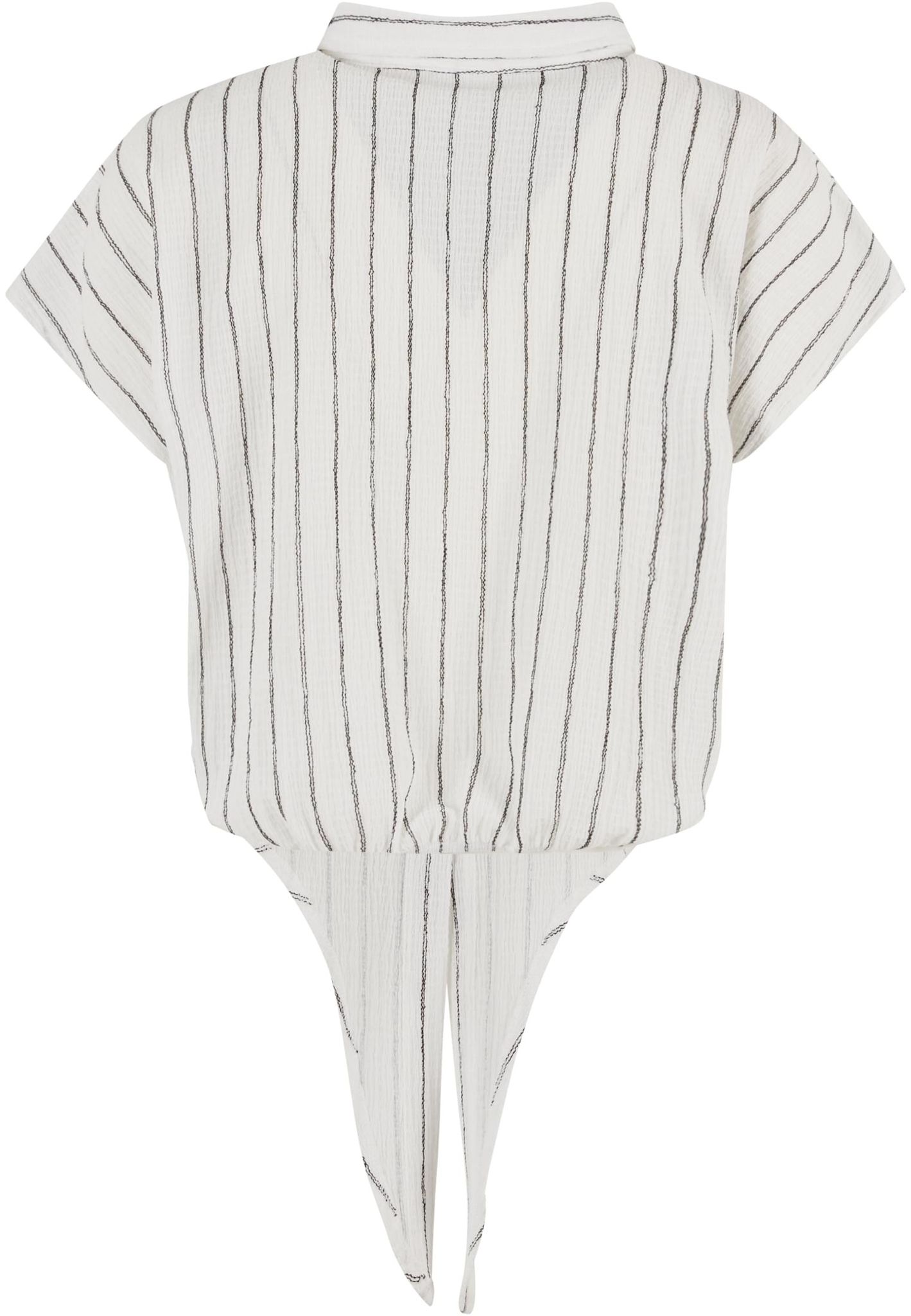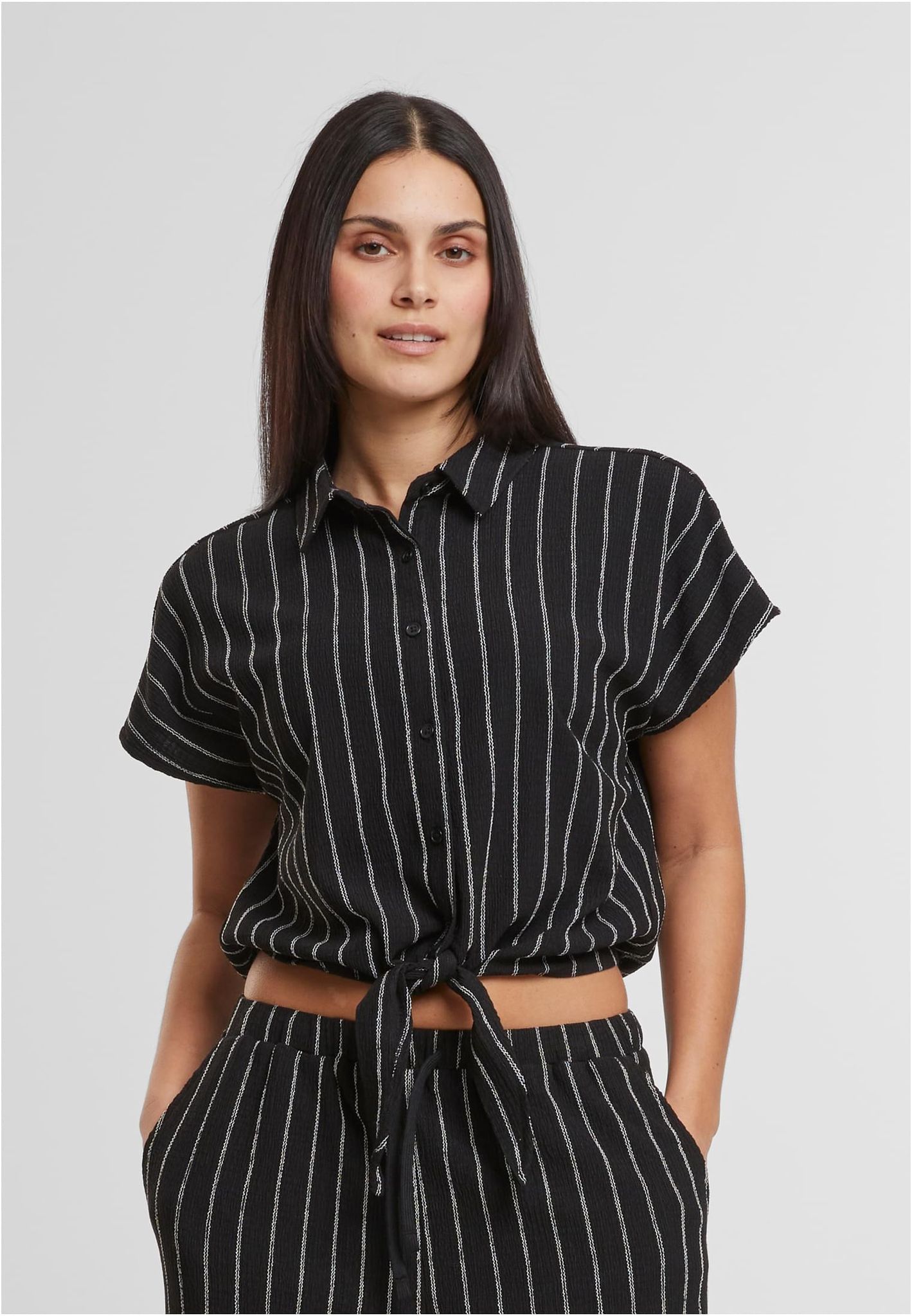 Framknappen tillför en tidlös charm, medan knutdetaljen i nederkant ger en lekfull twist till silhuetten. Blusen är mångsidig och passar både för avslappnade tillfällen och mer uppklädda sammanhang.