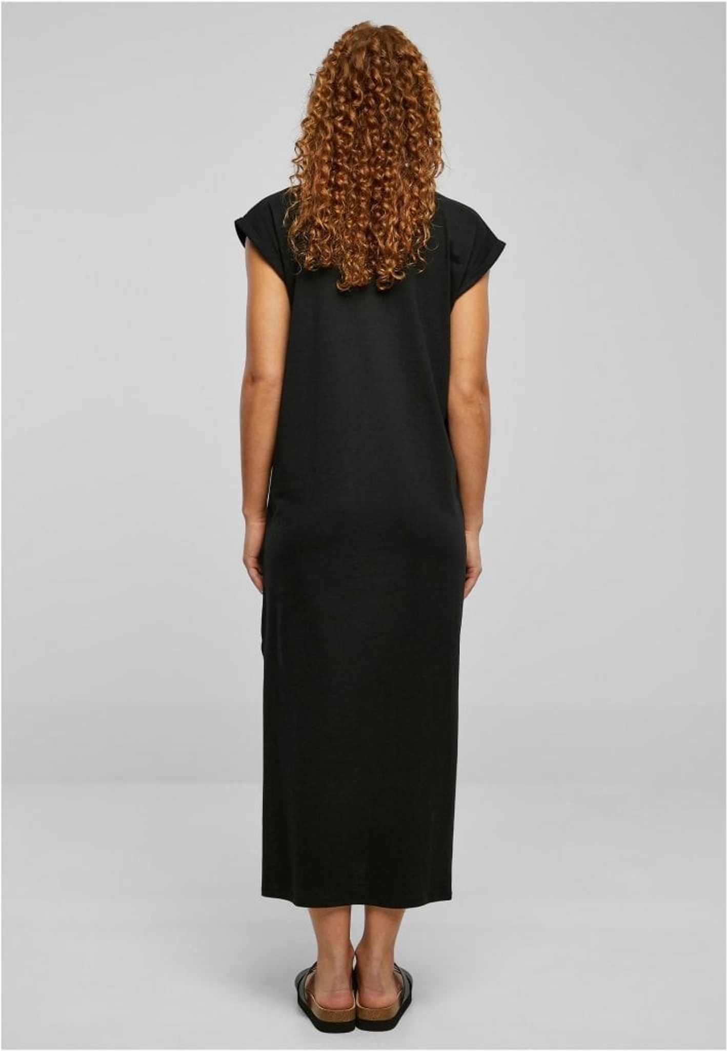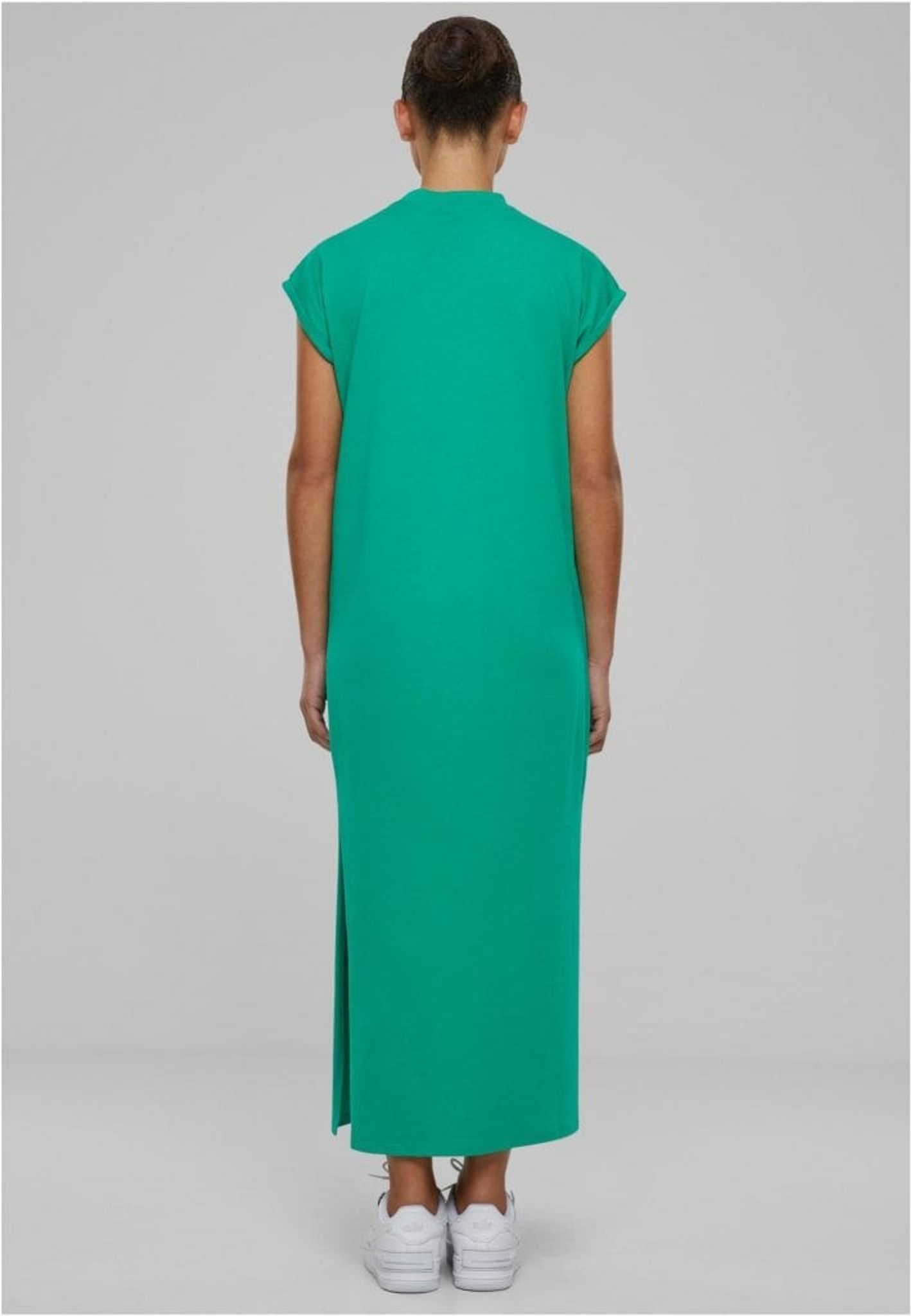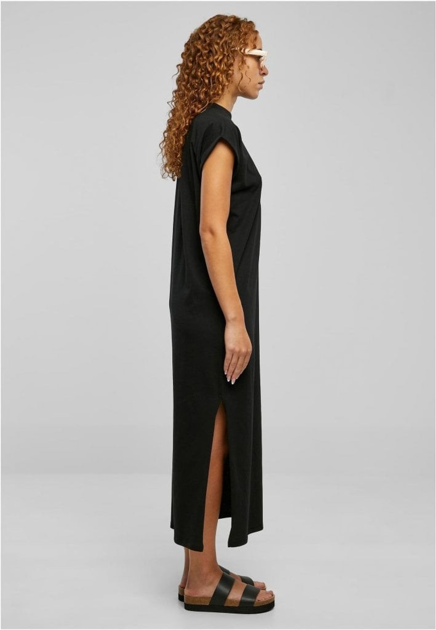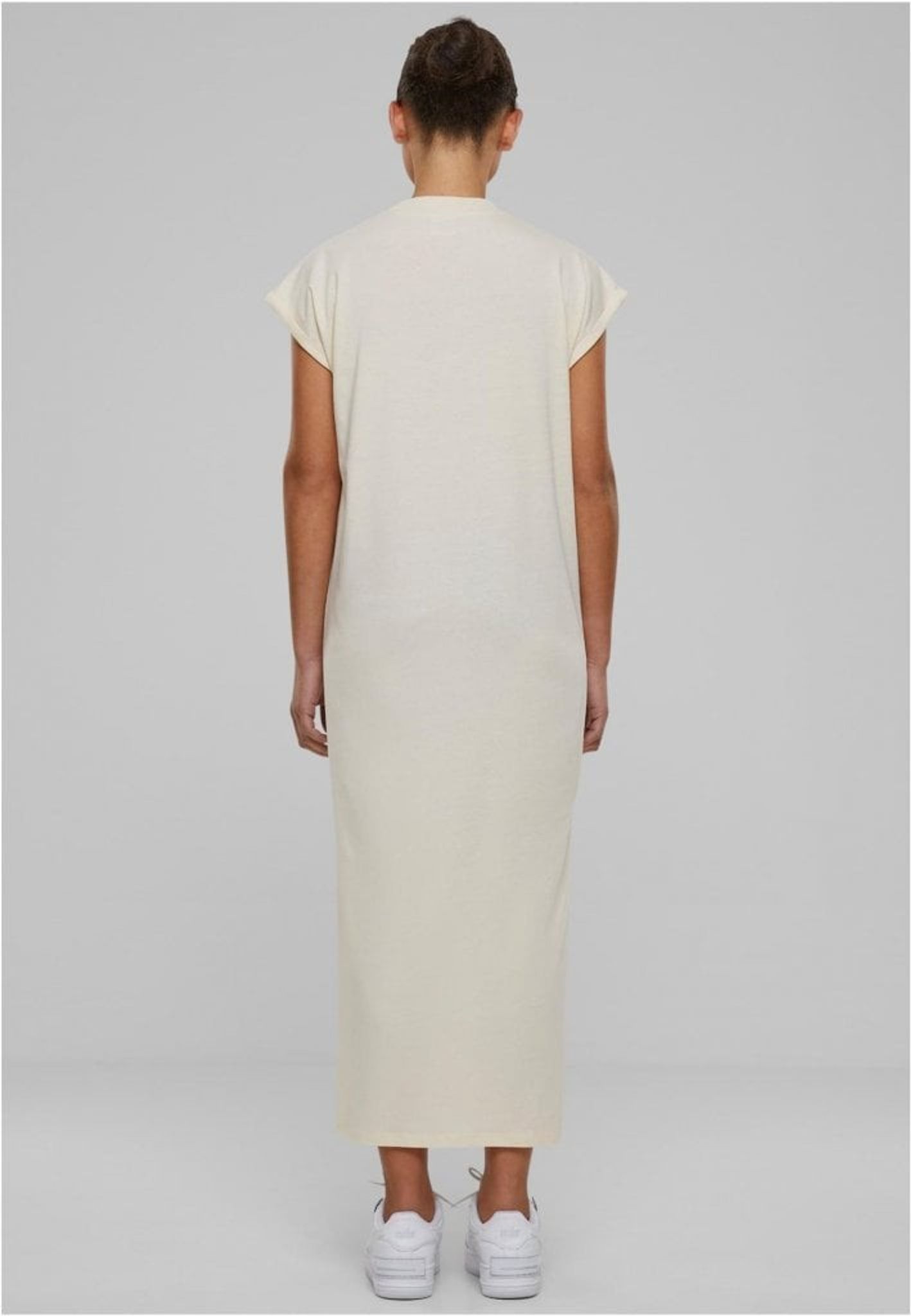 Den enfärgade och långa klänningen presenterar sig själv rakt och utan krusiduller. Den har sneda ärmar och en rak skärning.