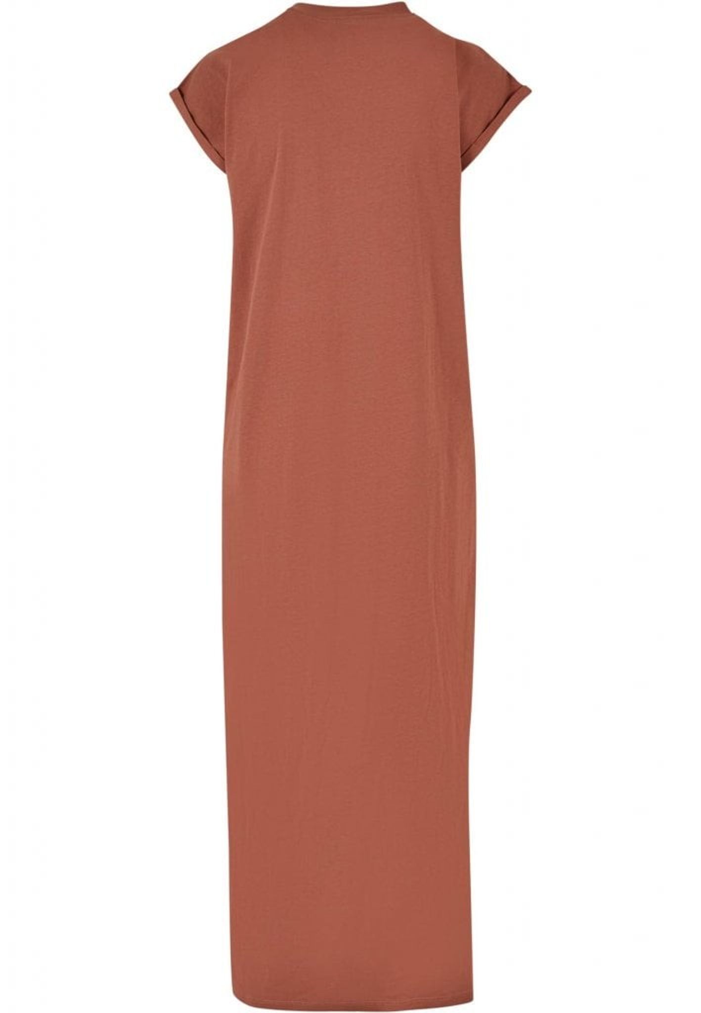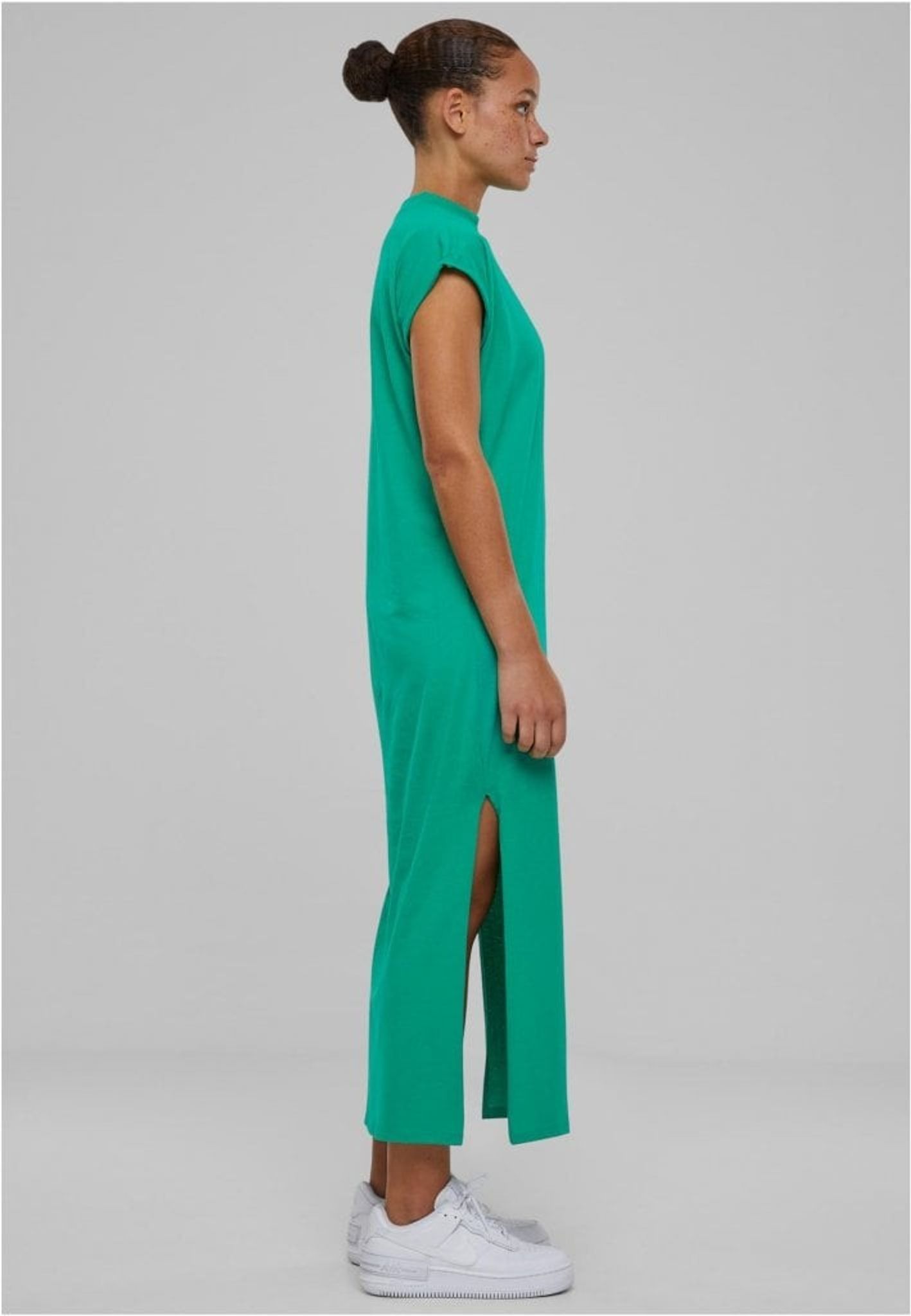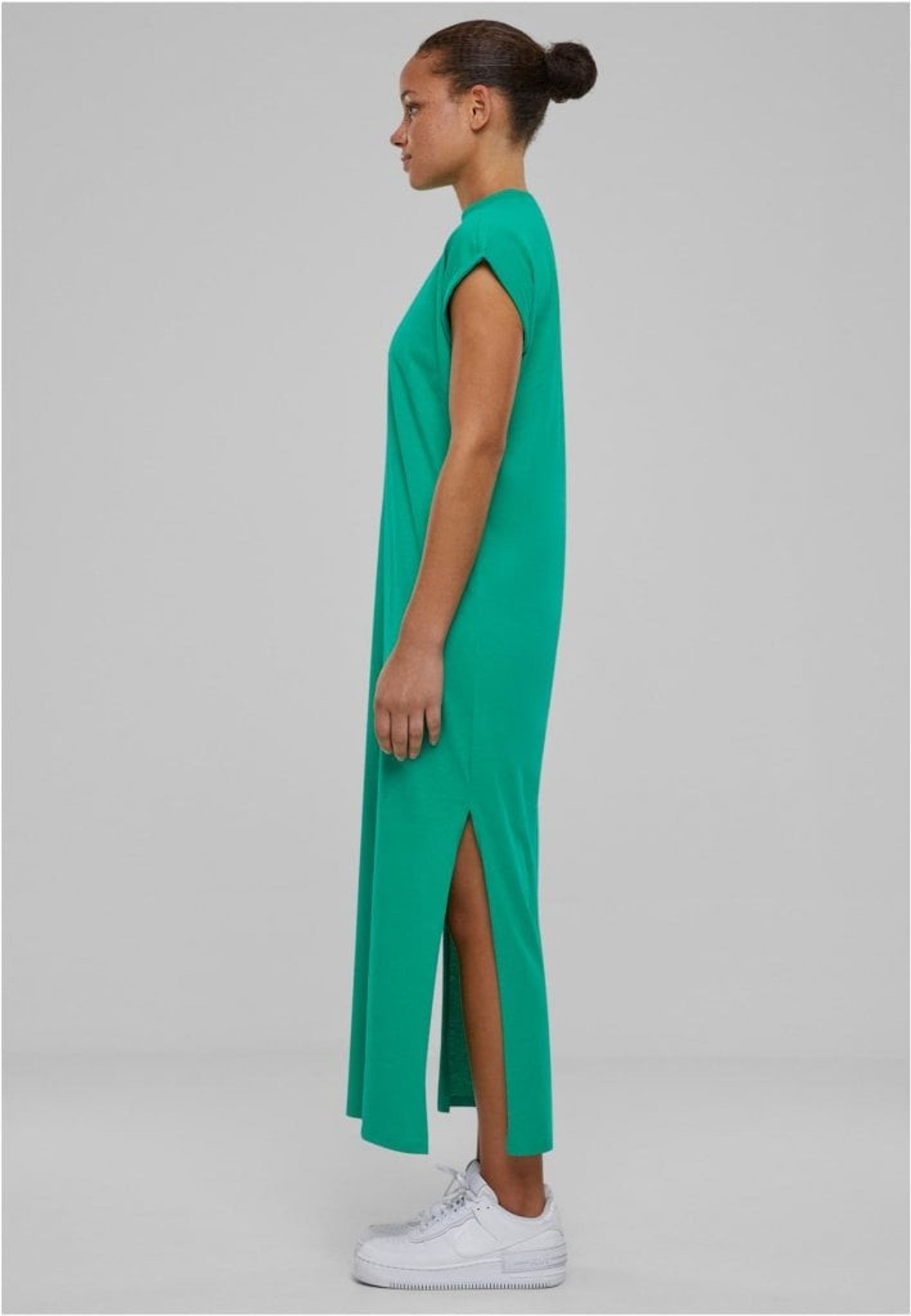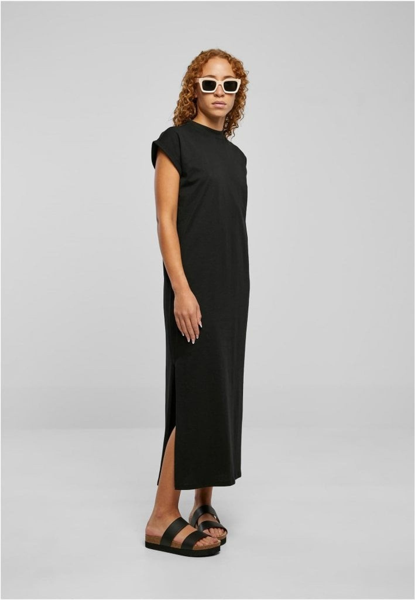 Den enfärgade och långa klänningen presenterar sig själv rakt och utan krusiduller. Den har sneda ärmar och en rak skärning.