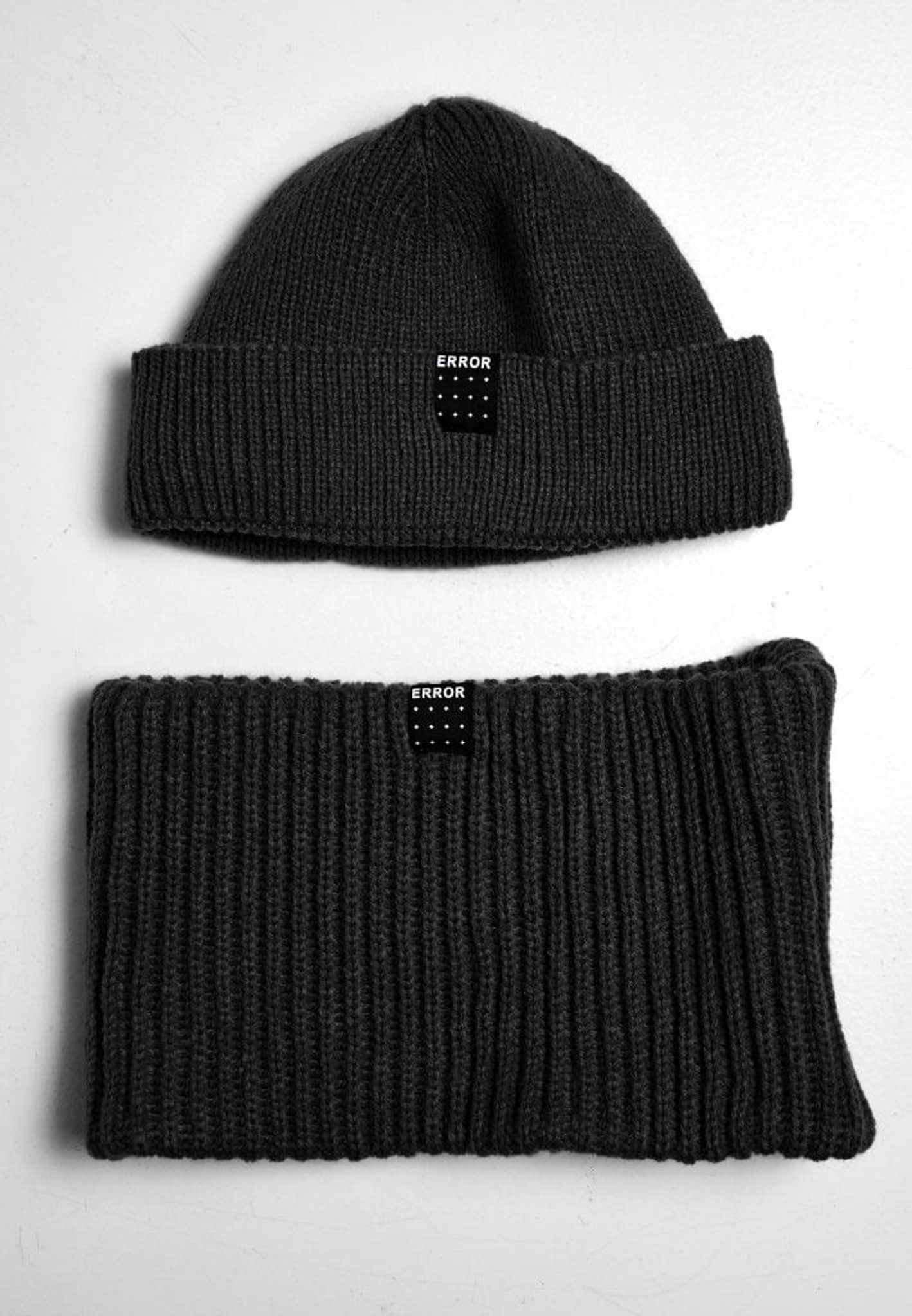 Detta set från Mr Tee innehåller en dockermössa och en riktigt skön, mjuk halsduk. De är smalt ribbstickade och det är matchande dekorativa lappar med texten "ERROR" på båda. Ett följsamt akrylmaterial, "one size fits all", som håller alla varma och nöjda i höst och vinter.