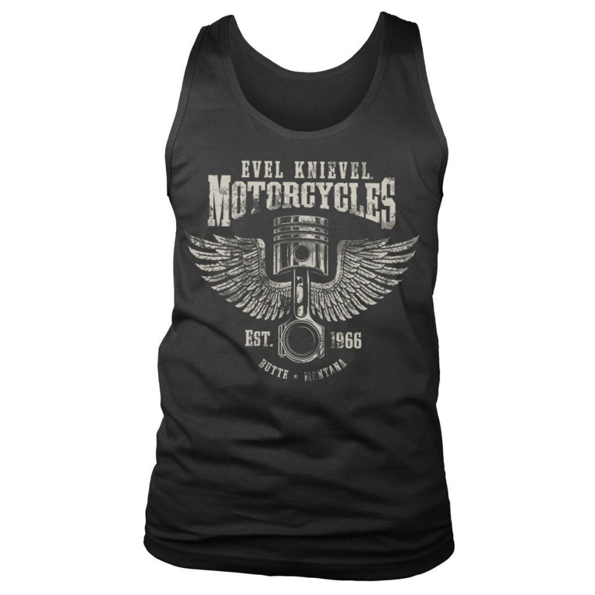 Det har ett stilrent tryck med Evel Knievels motorcykel och namn. Det är ett perfekt val för alla som älskar motorcyklar och vill visa sin stil. Det är ett bekvämt och stilfullt linne som är perfekt för alla tillfällen.