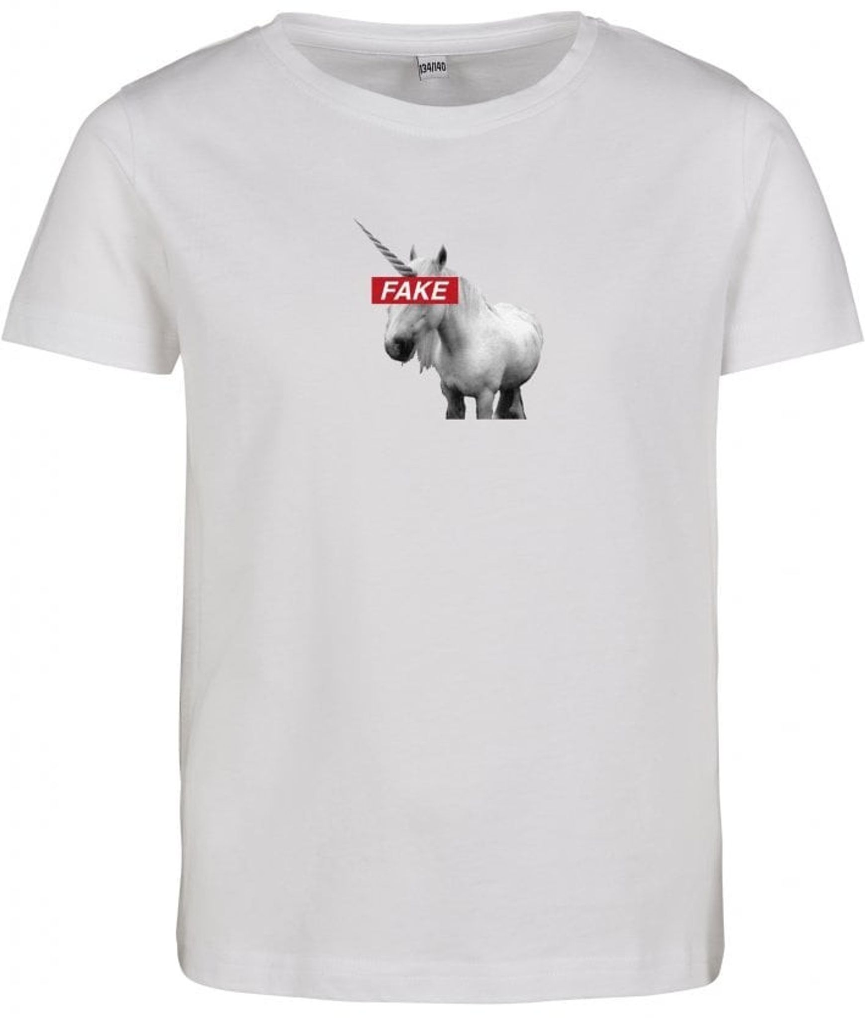 En vit T-shirt med ett tryck på en enhörning. Över ögonen har enhörningen "FAKE" tryckt i en röd box.