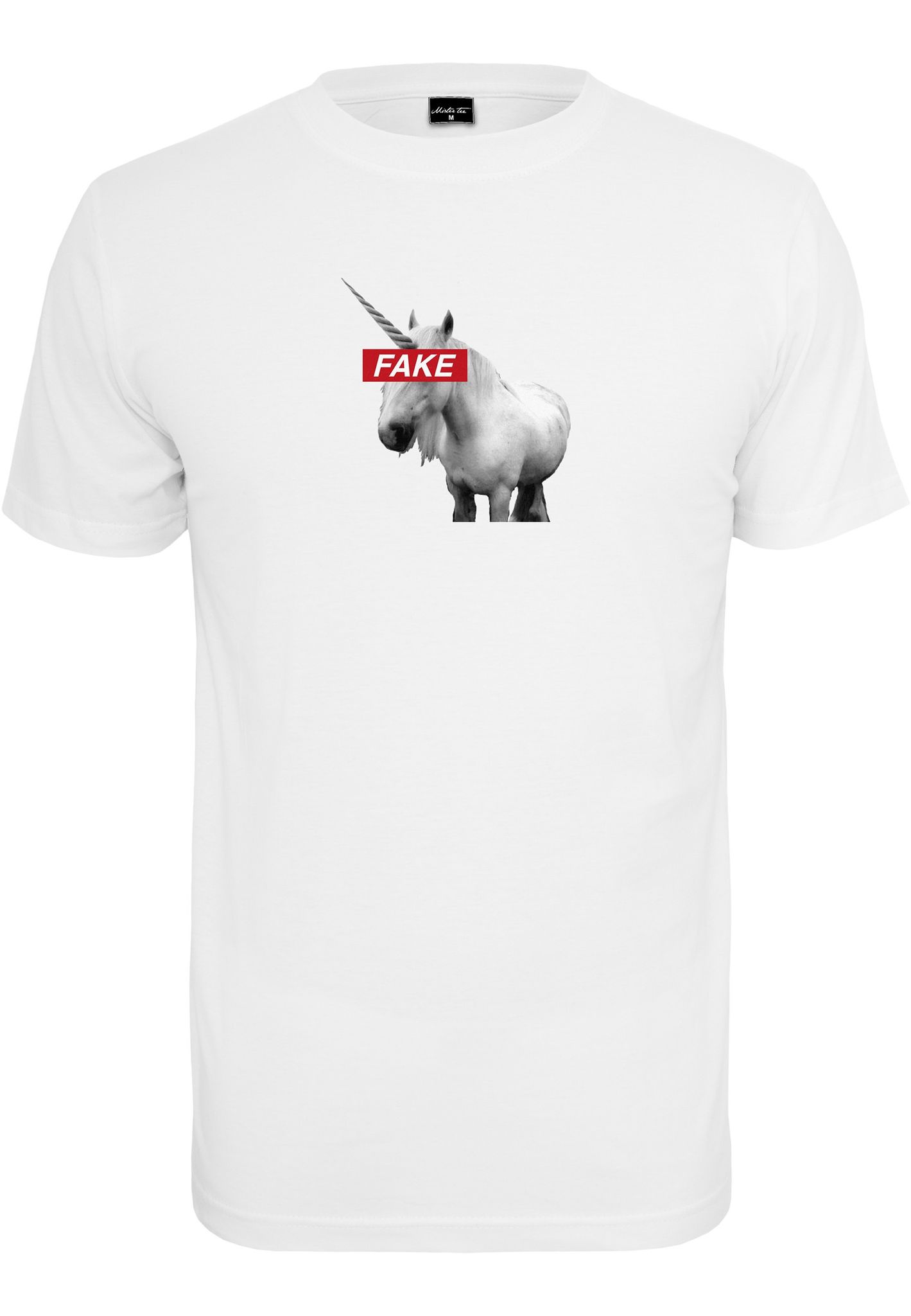 En vit T-shirt med en enhörning vars ögon blivit blurrade med texten "Fake".