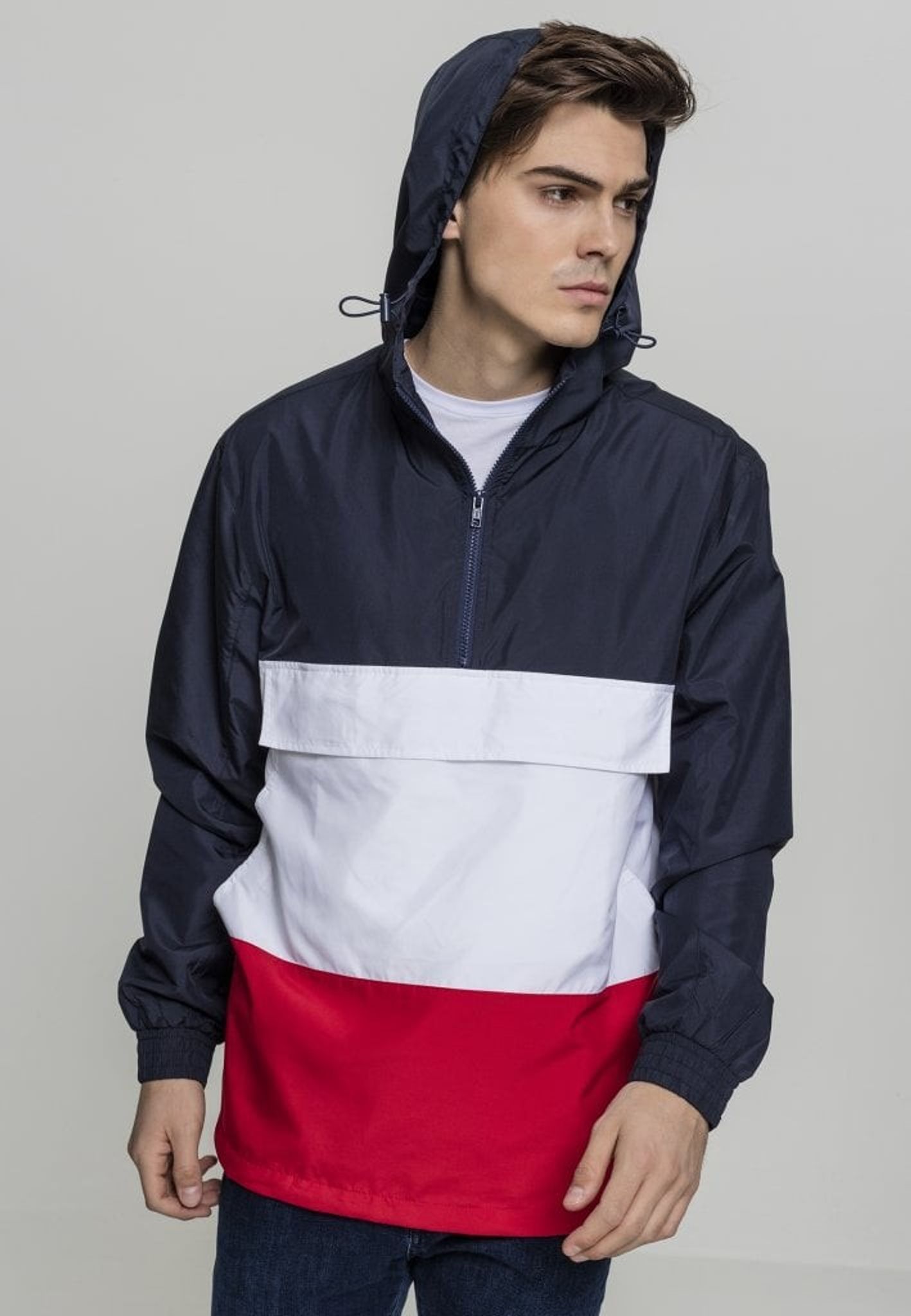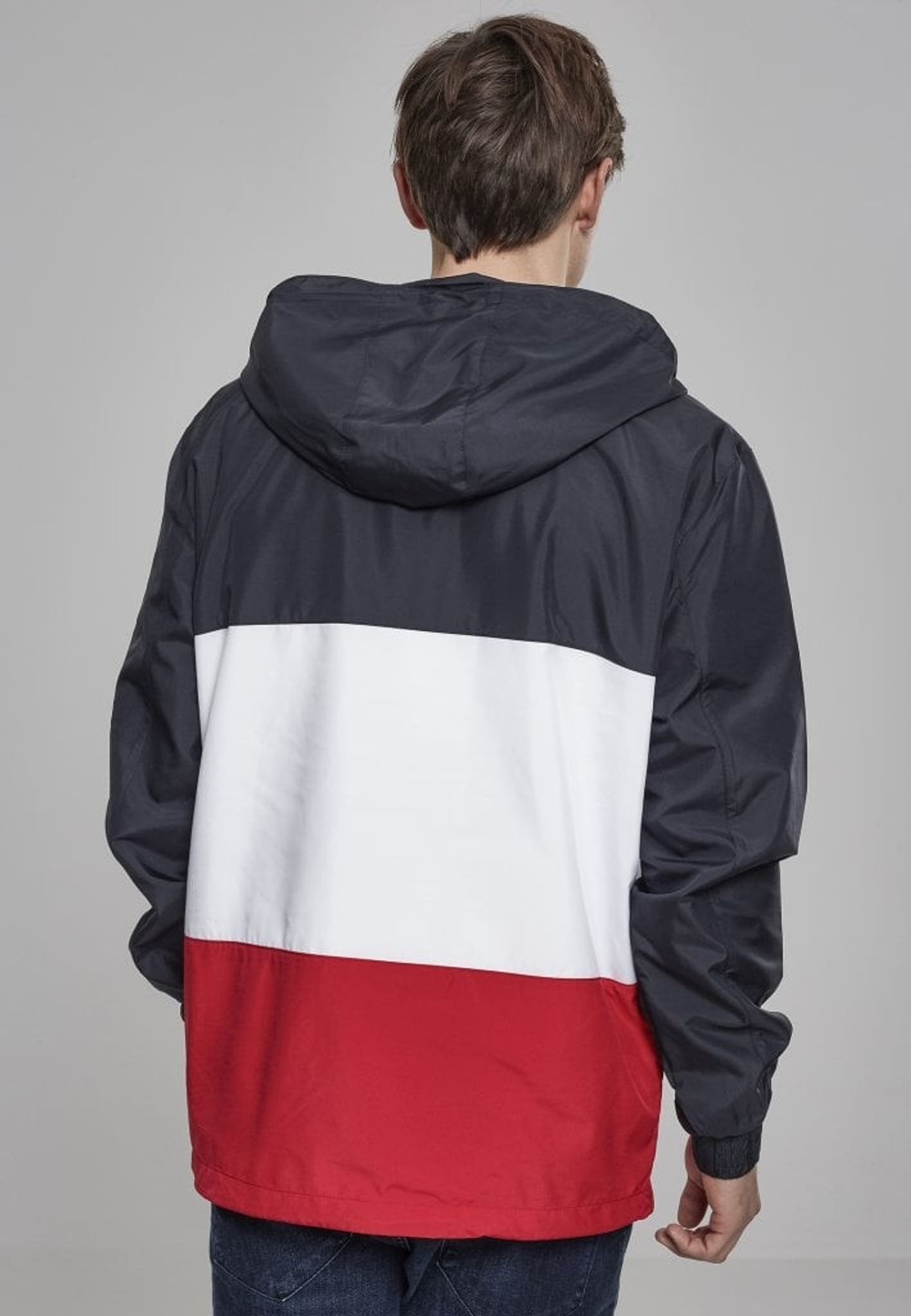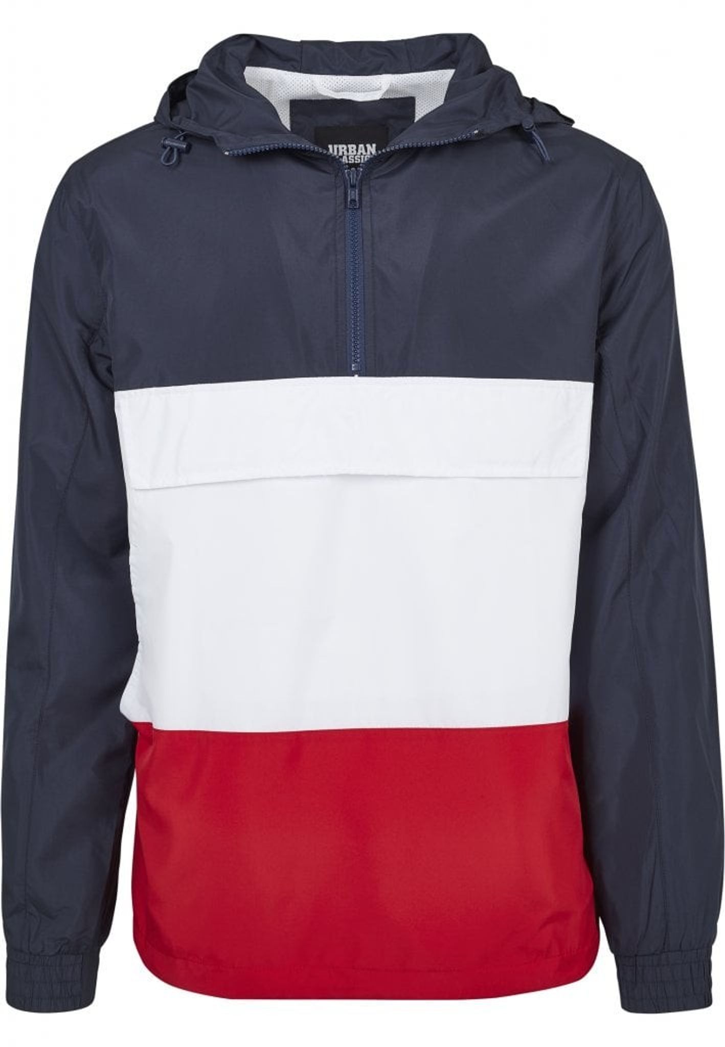 En pullover-jacka med tre färgblock. Blocket går i tre olika färger.