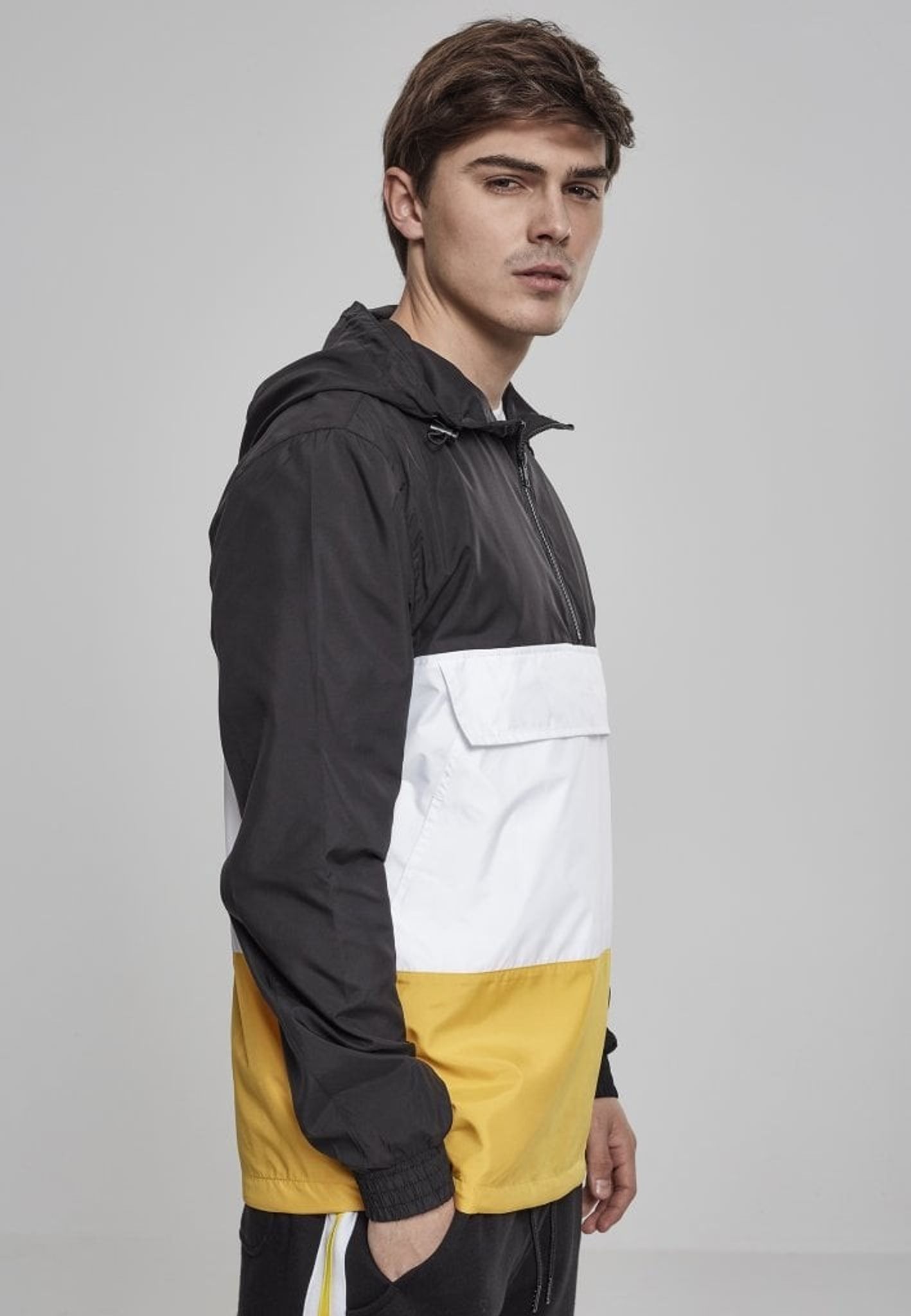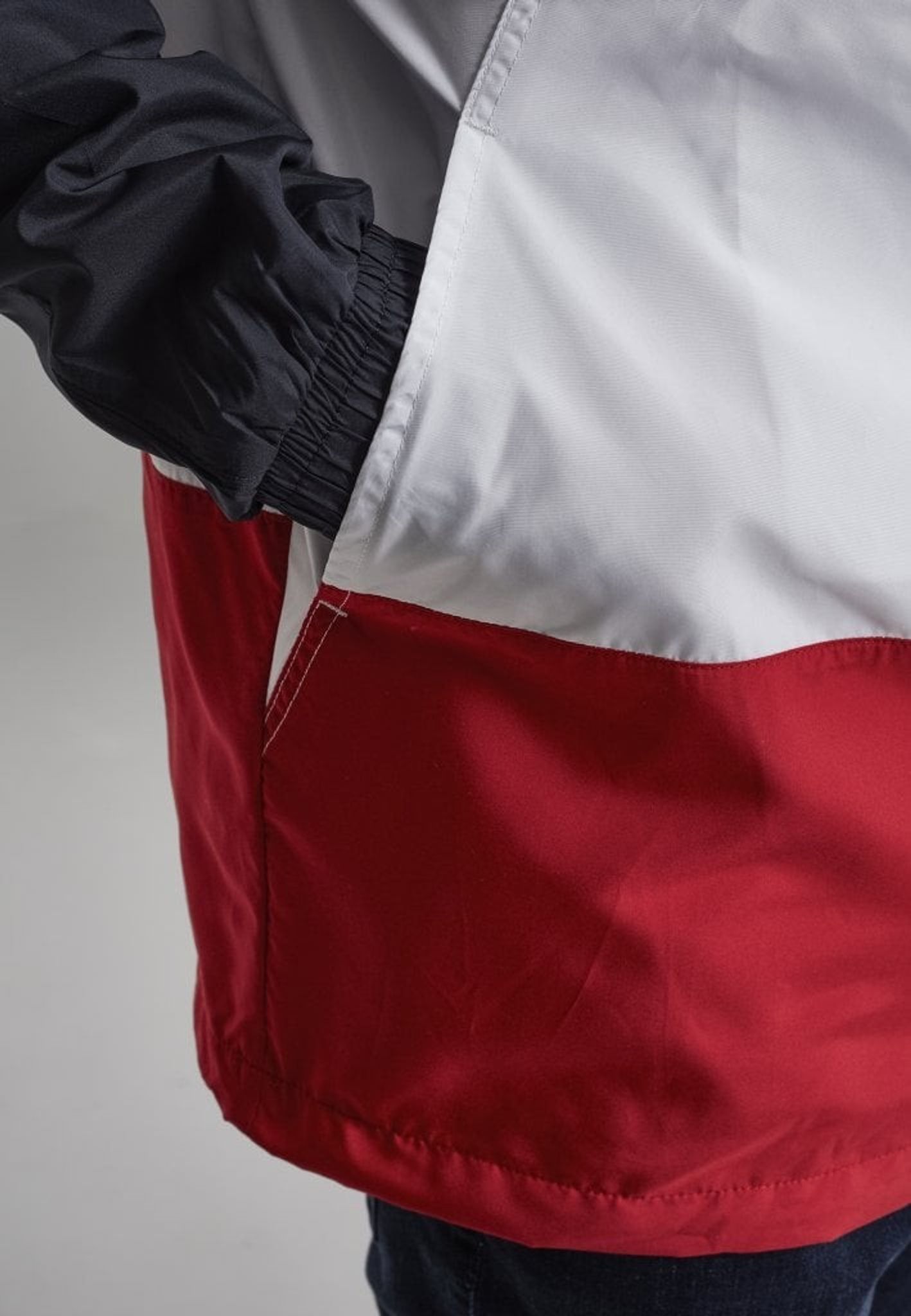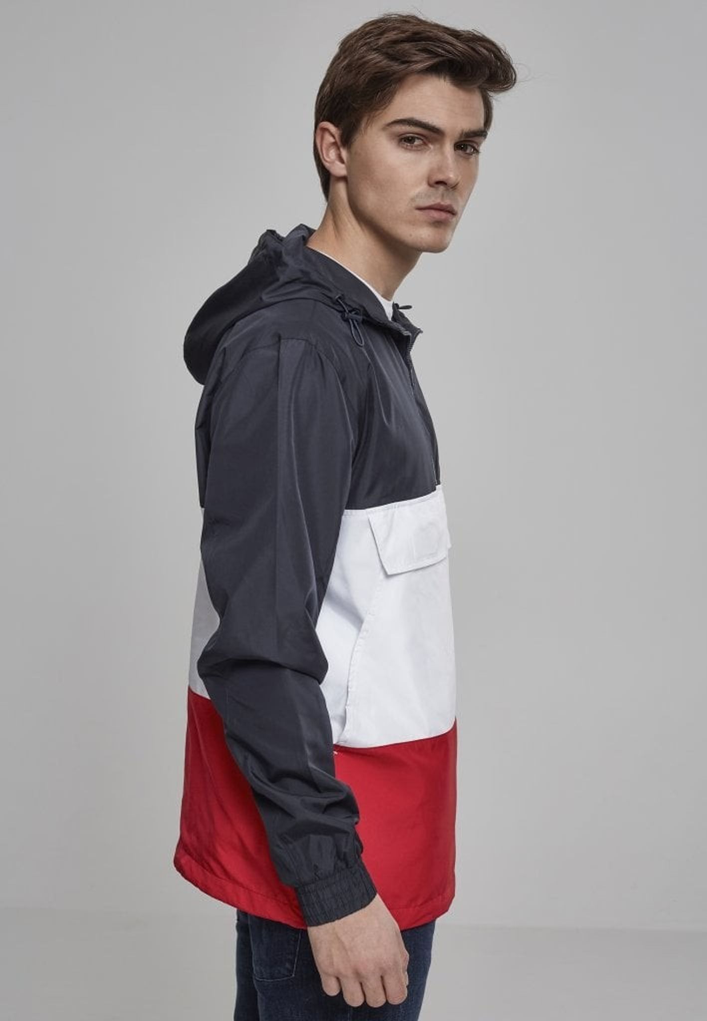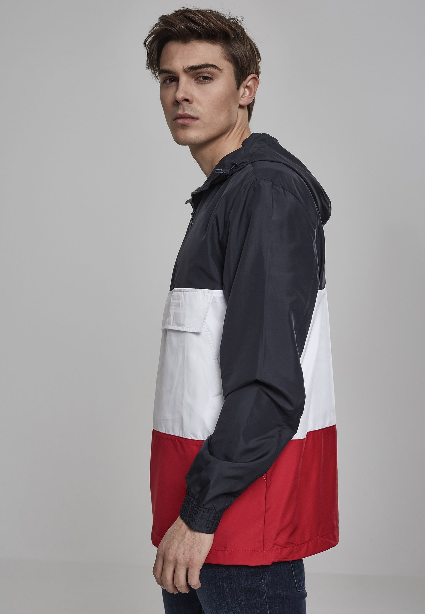 En pullover-jacka med tre färgblock. Blocket går i tre olika färger.
