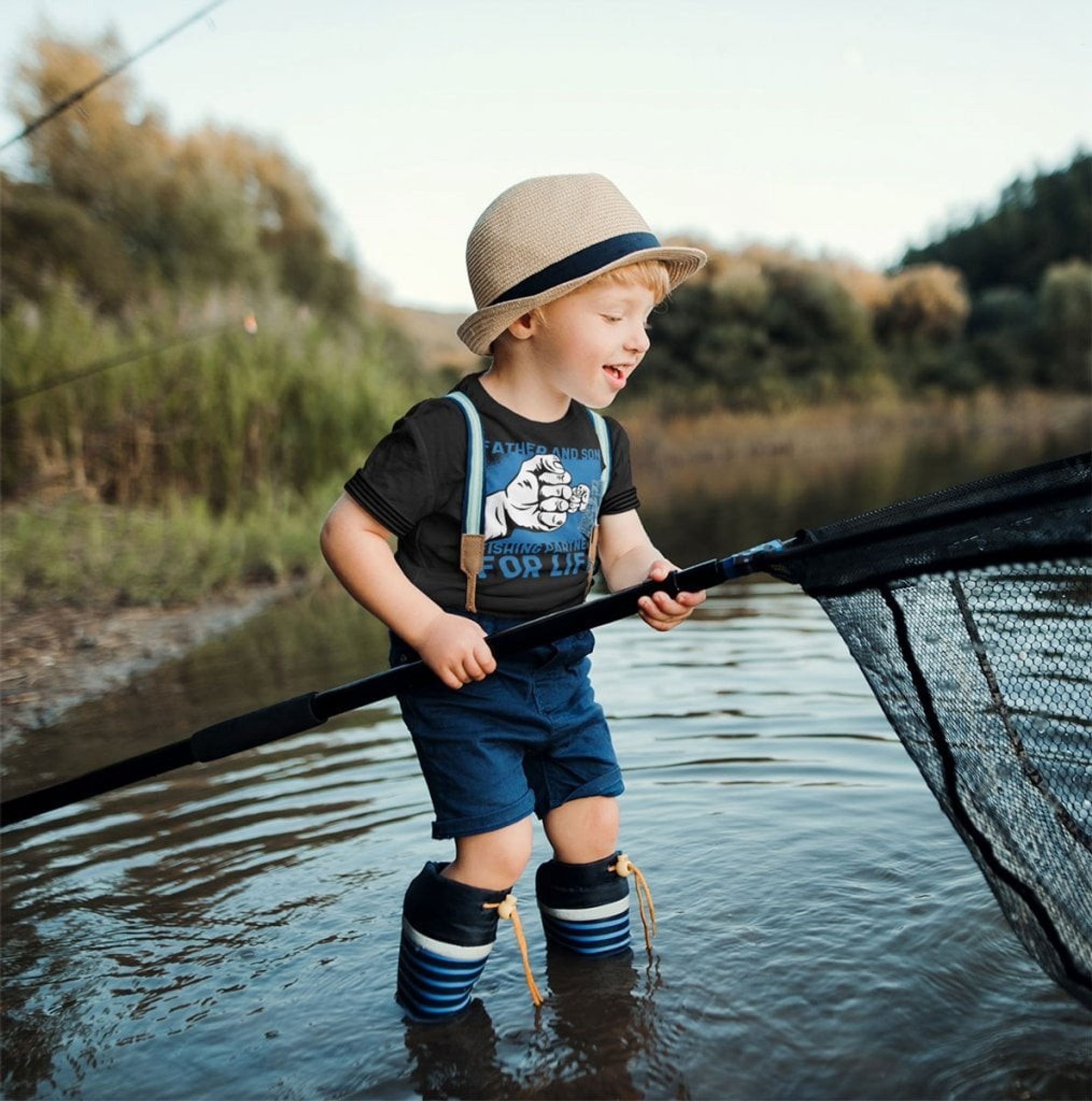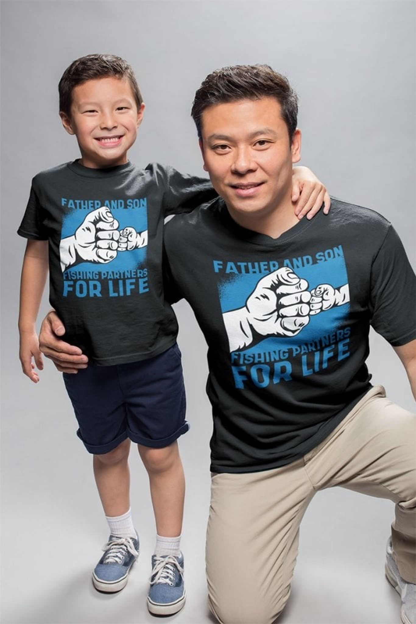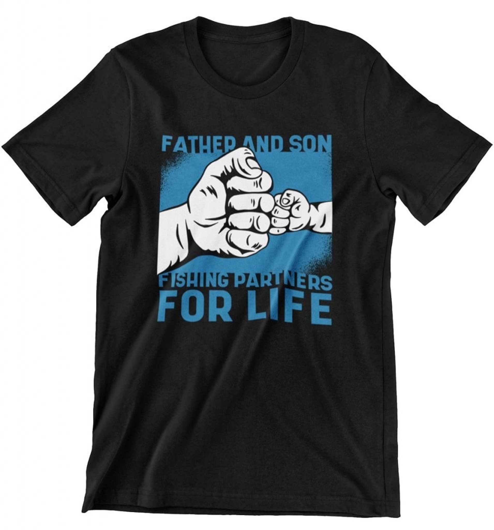 En skön T-shirt för den lille fiskaren med en stor och liten knytnäve som fistbumpar varandra. Detta till texten Father and son. Fishing partners for life.
