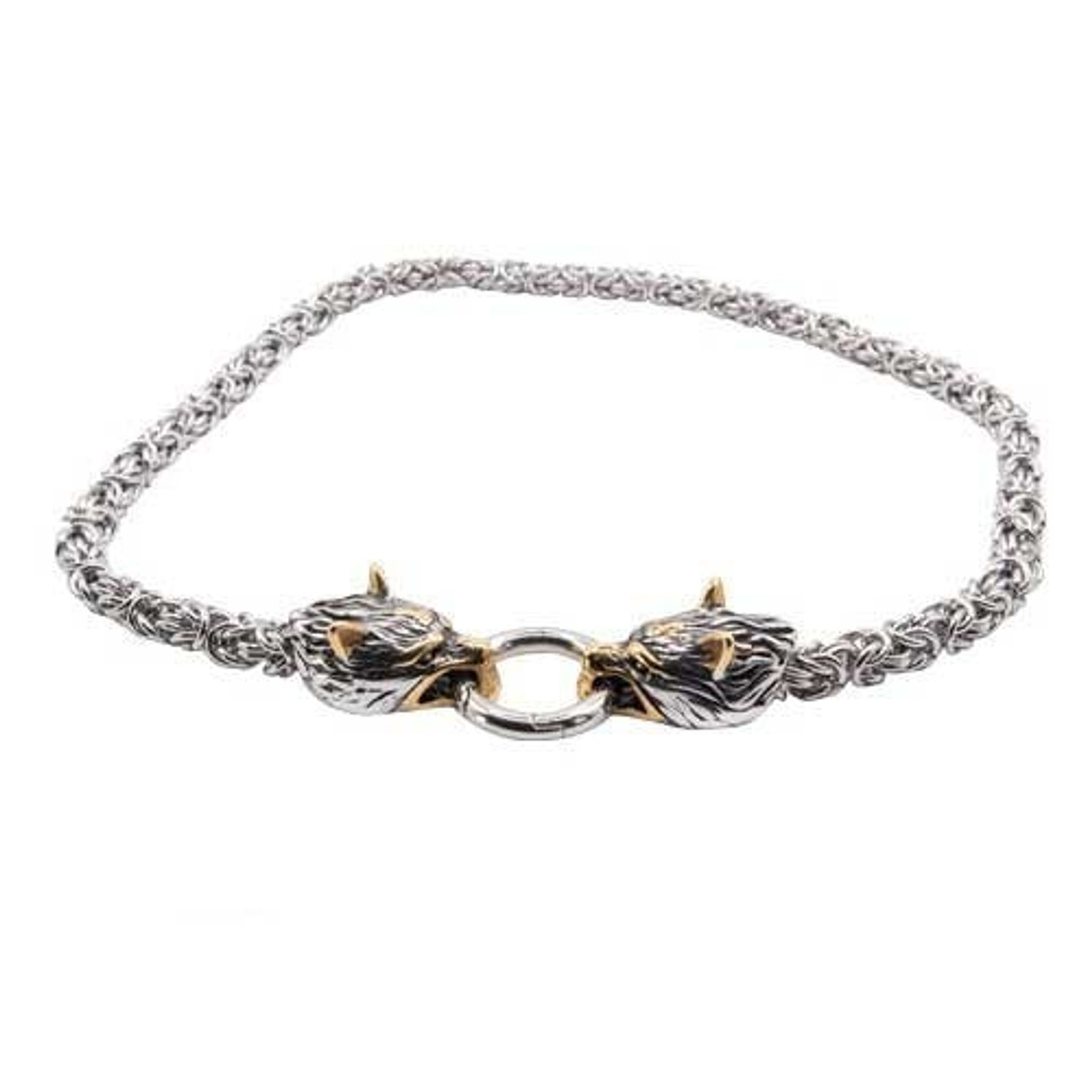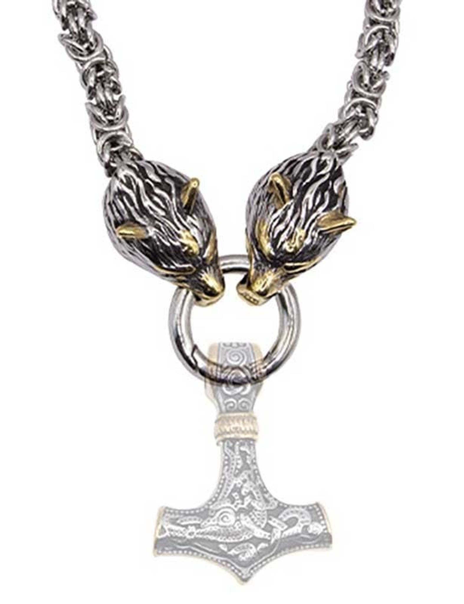 Denna halskedja fångar en stund av mytologisk kraft där två Fenrisulvar, mäktiga varelser från nordisk mytologi, biter om en ring med en råstyrka som tycks kunna utmana själva ödena. De majestätiska vargarna är mästerligt skulpterade i rostfritt stål, med detaljer i guld som lyfter fram deras vilda natur och den oförsonliga skönhet som kännetecknar dessa legendariska varelser.