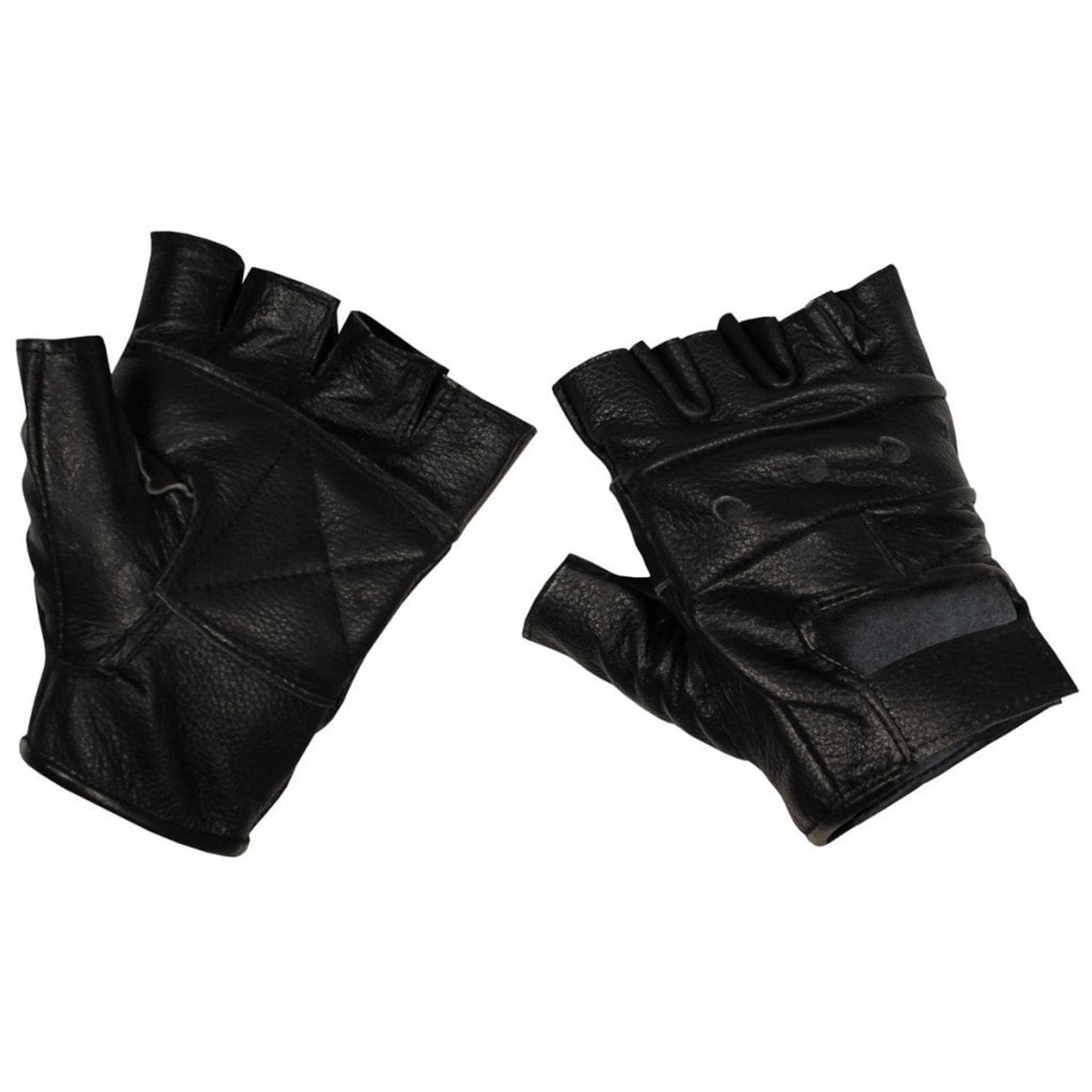 Ett par svarta läderhandskar utan hela fingrar och med extra läder inuti handsken.