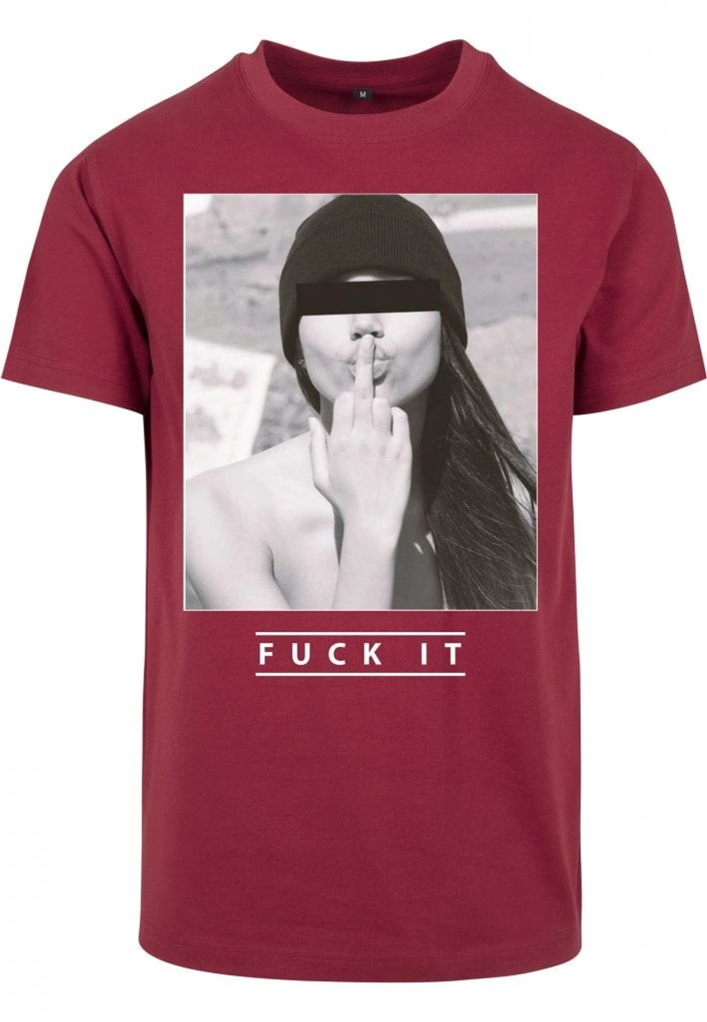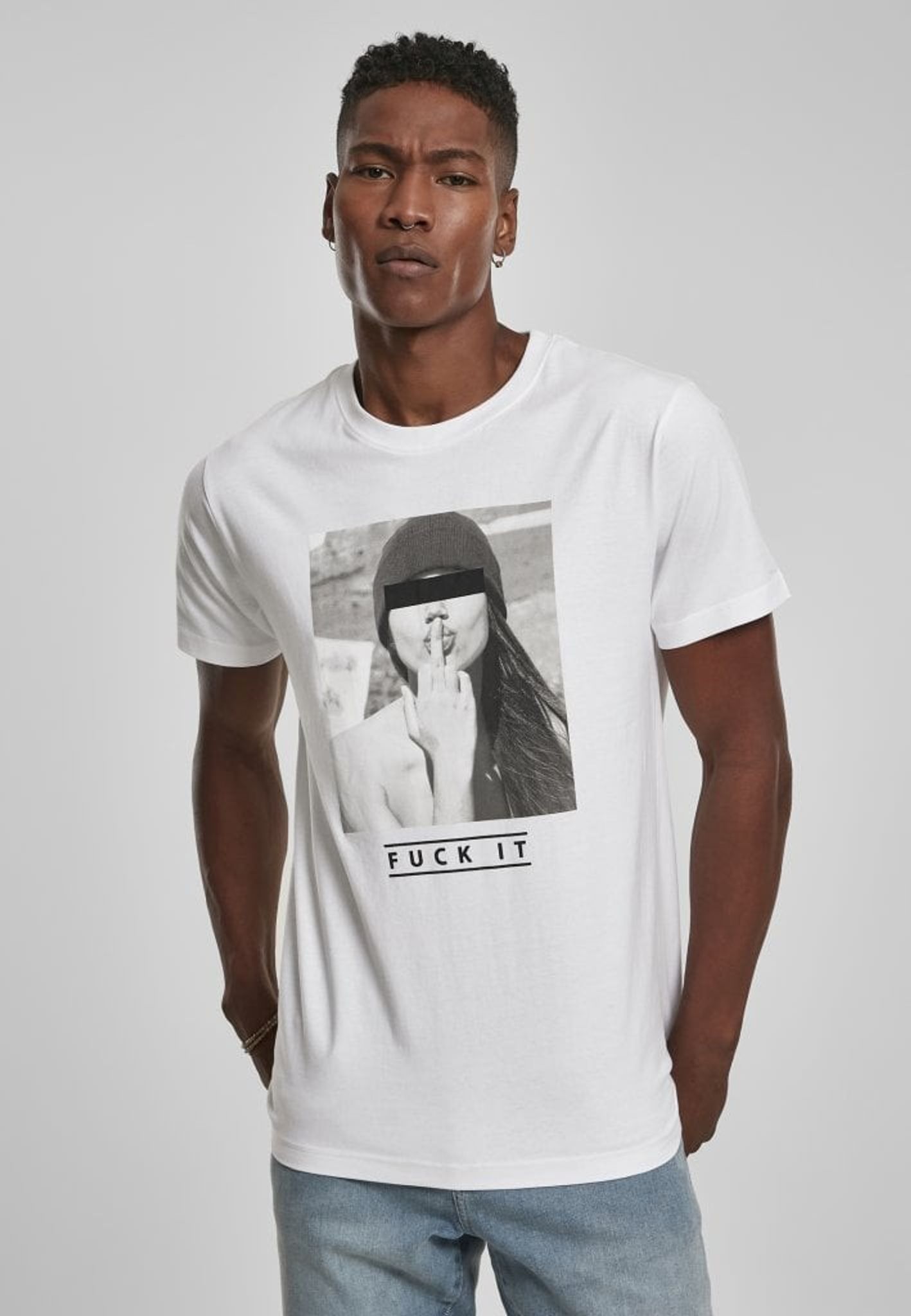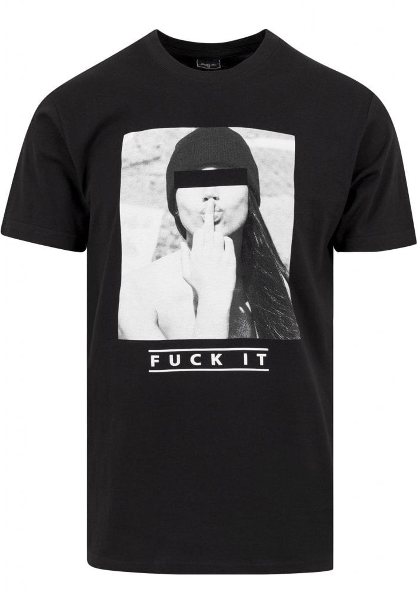 Svartvitt foto på en modell som kysser sitt långfinger. Texten Fuck it står ungefär för känslan att inte bry sig. I färgerna svart och vit finns denna t-shirt upp till storlek 5 XL.