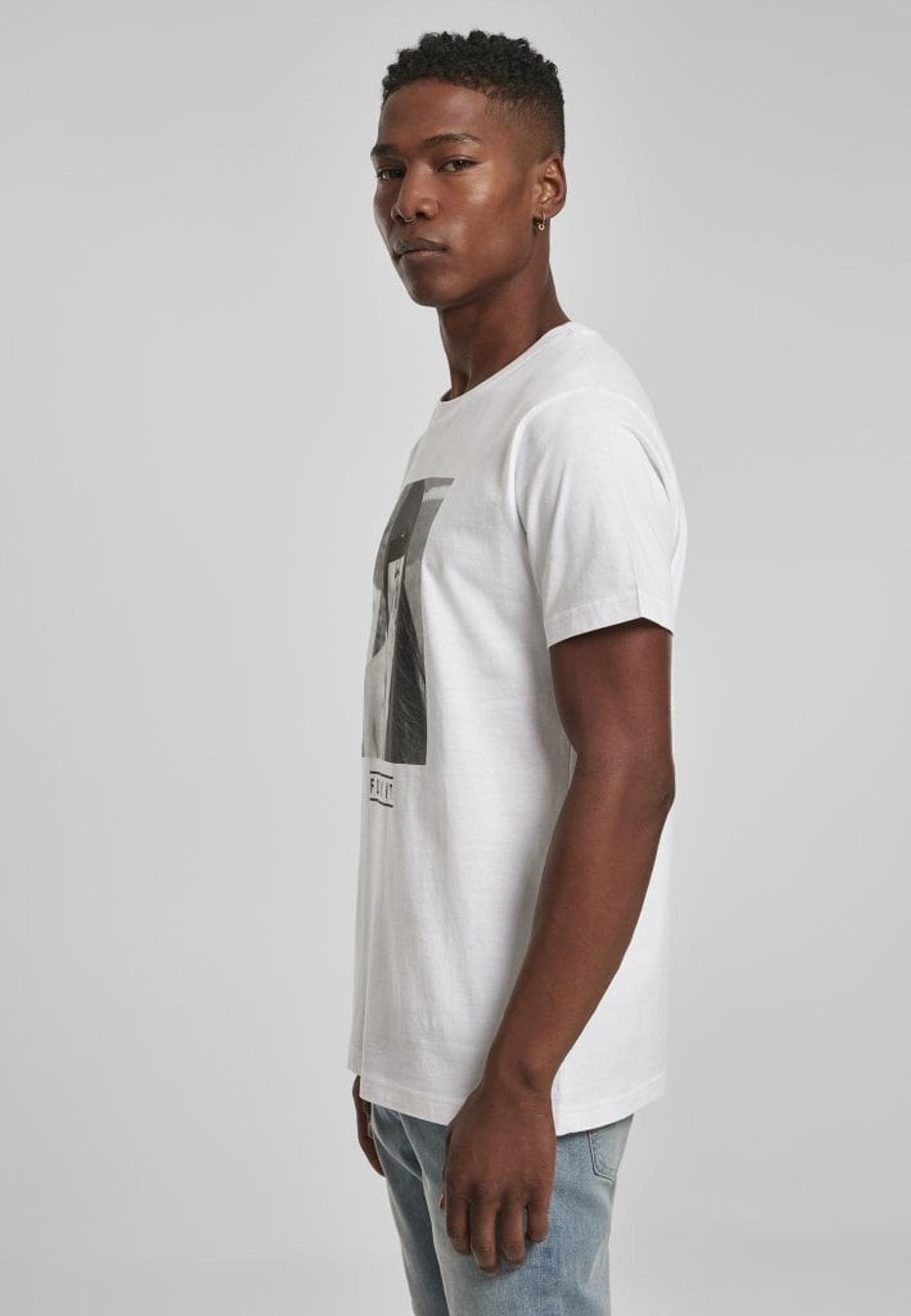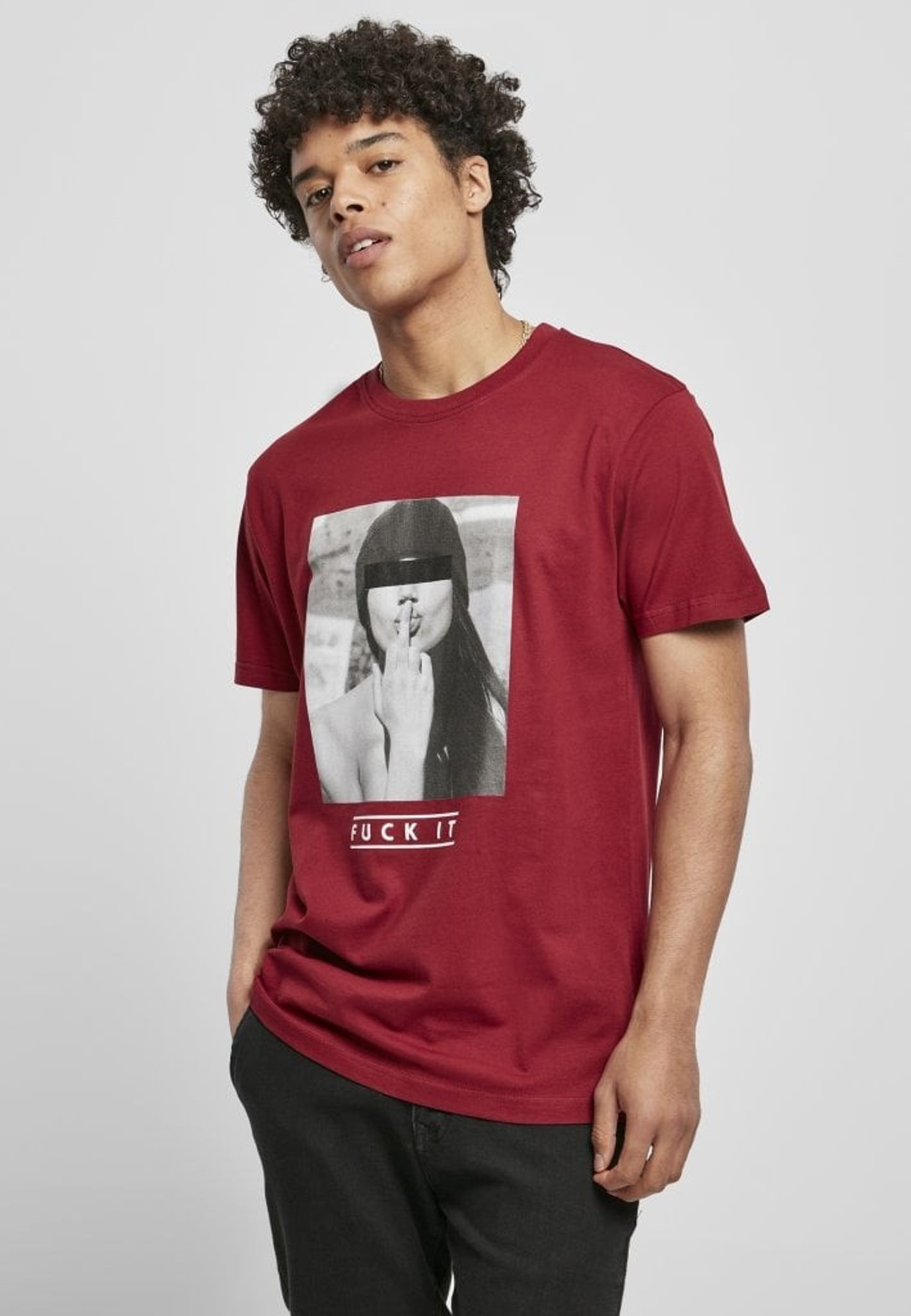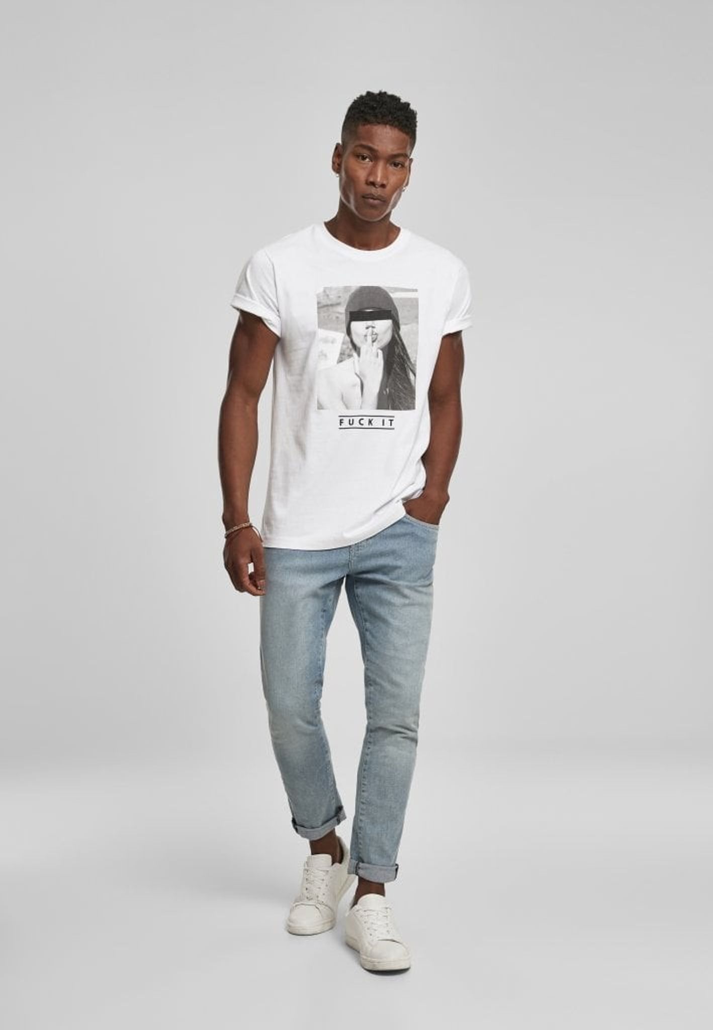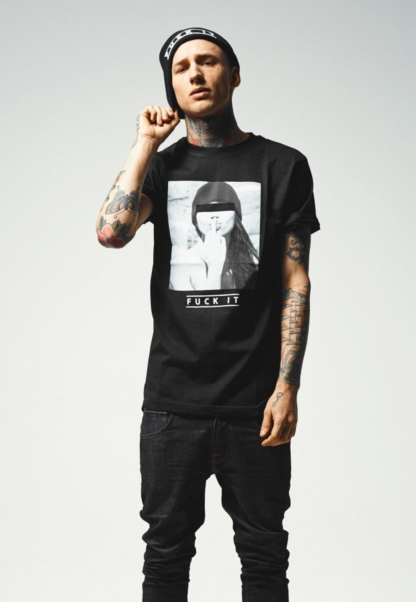 Svartvitt foto på en modell som kysser sitt långfinger. Texten Fuck it står ungefär för känslan att inte bry sig. I färgerna svart och vit finns denna t-shirt upp till storlek 5 XL.