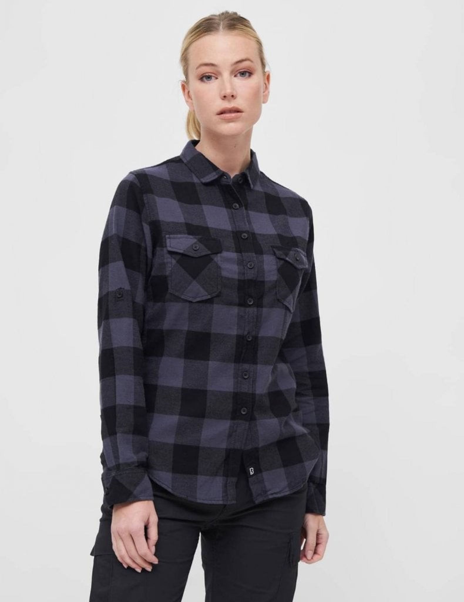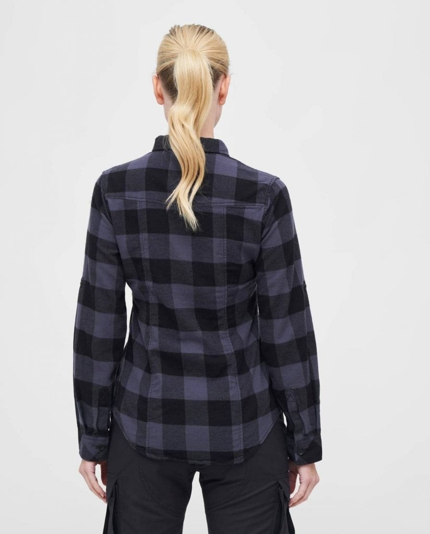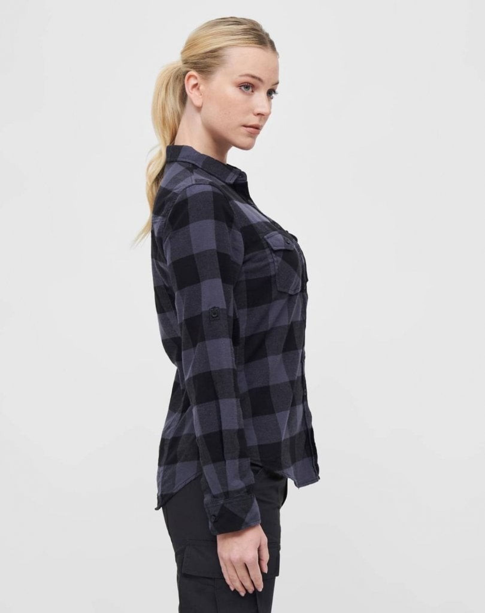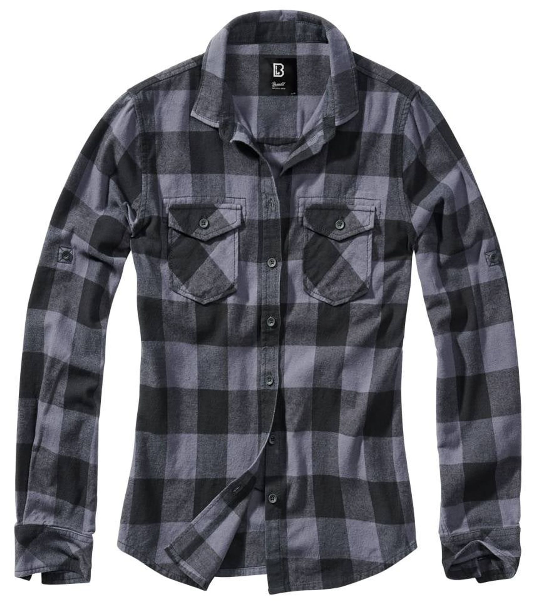 En klassisk flanellskjorta sydd i damstorlekar. Här med ett rutmönster skiftande i grått och svart.