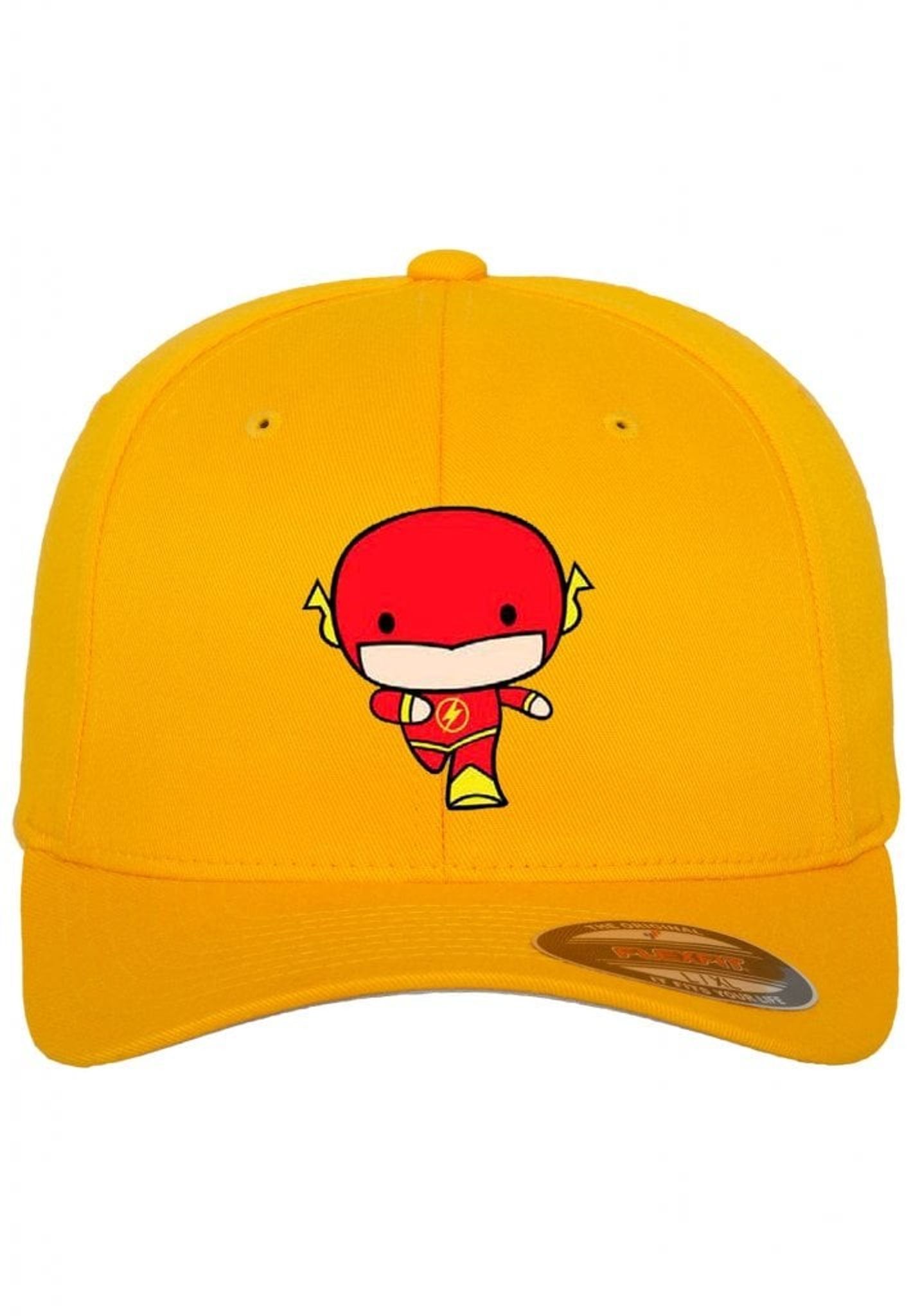En gul FlexFit keps med superhjälten The Flash broderat över fronten.