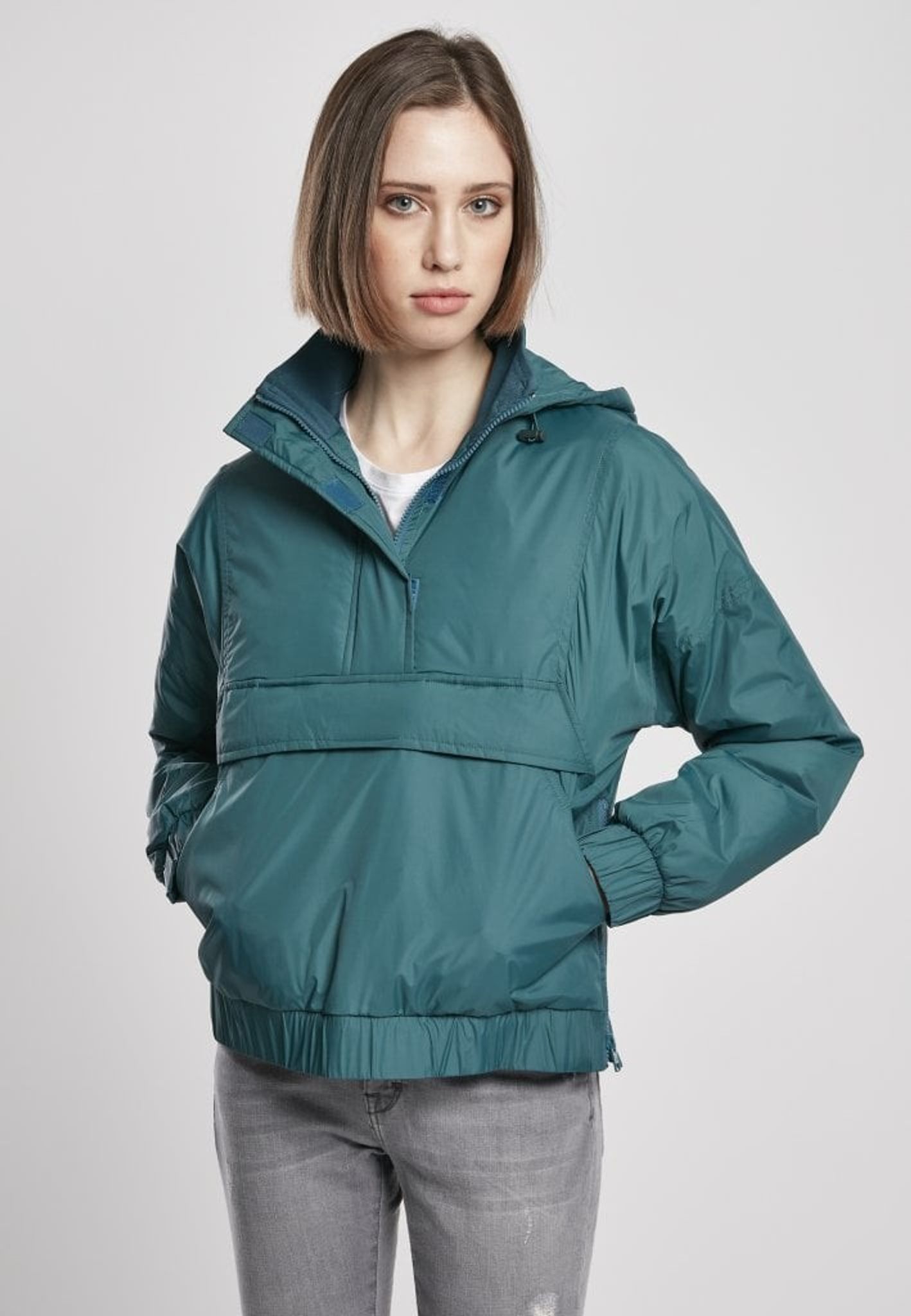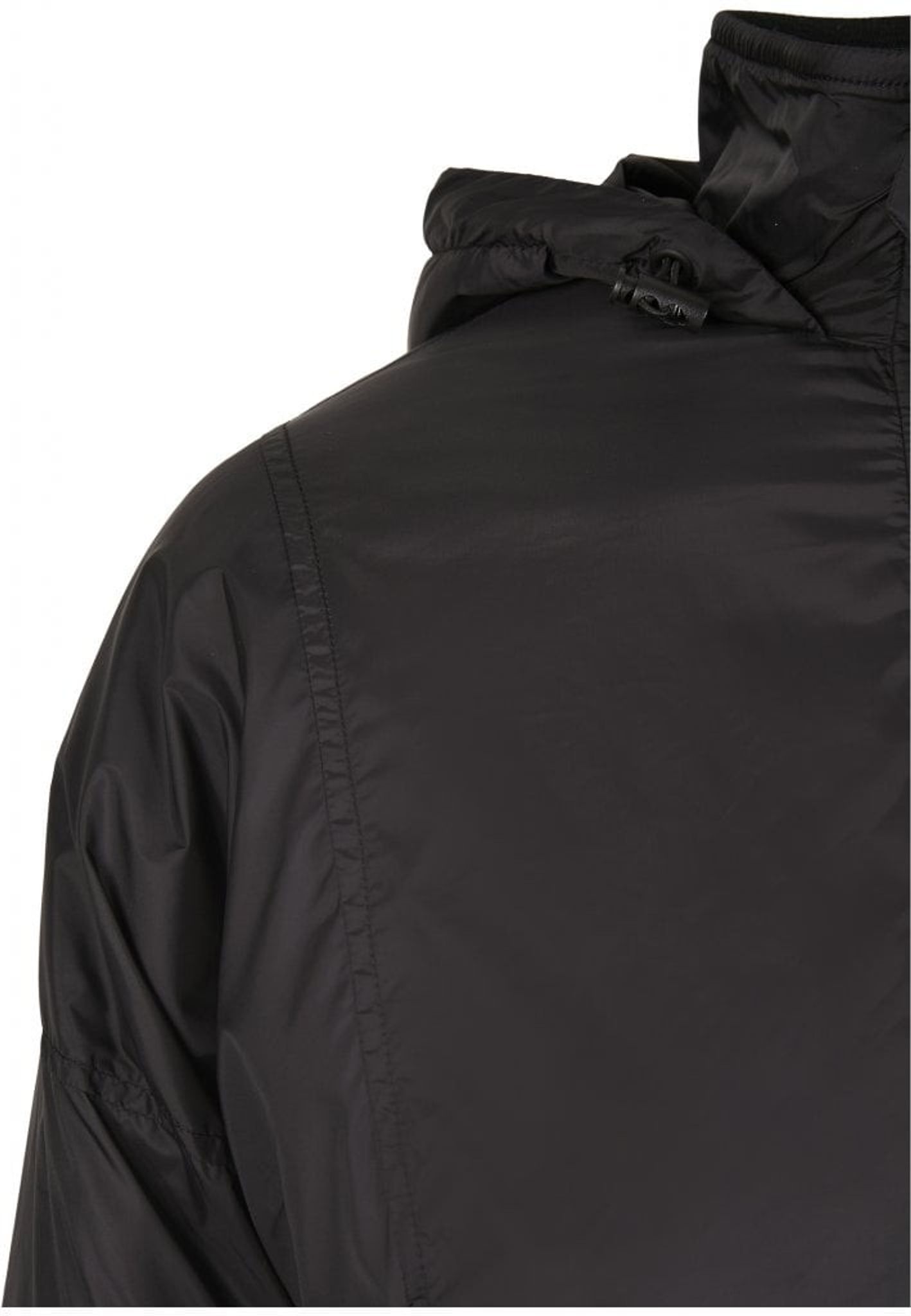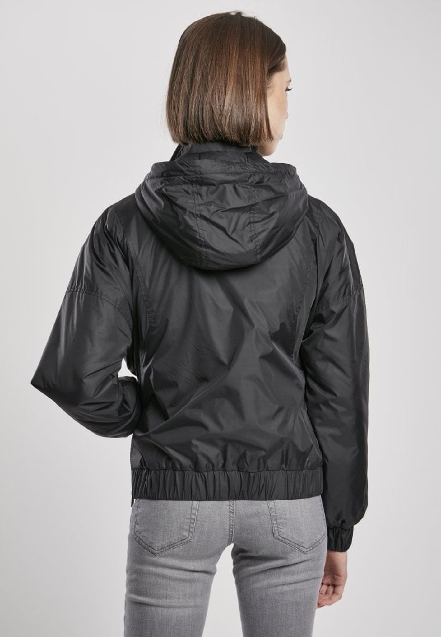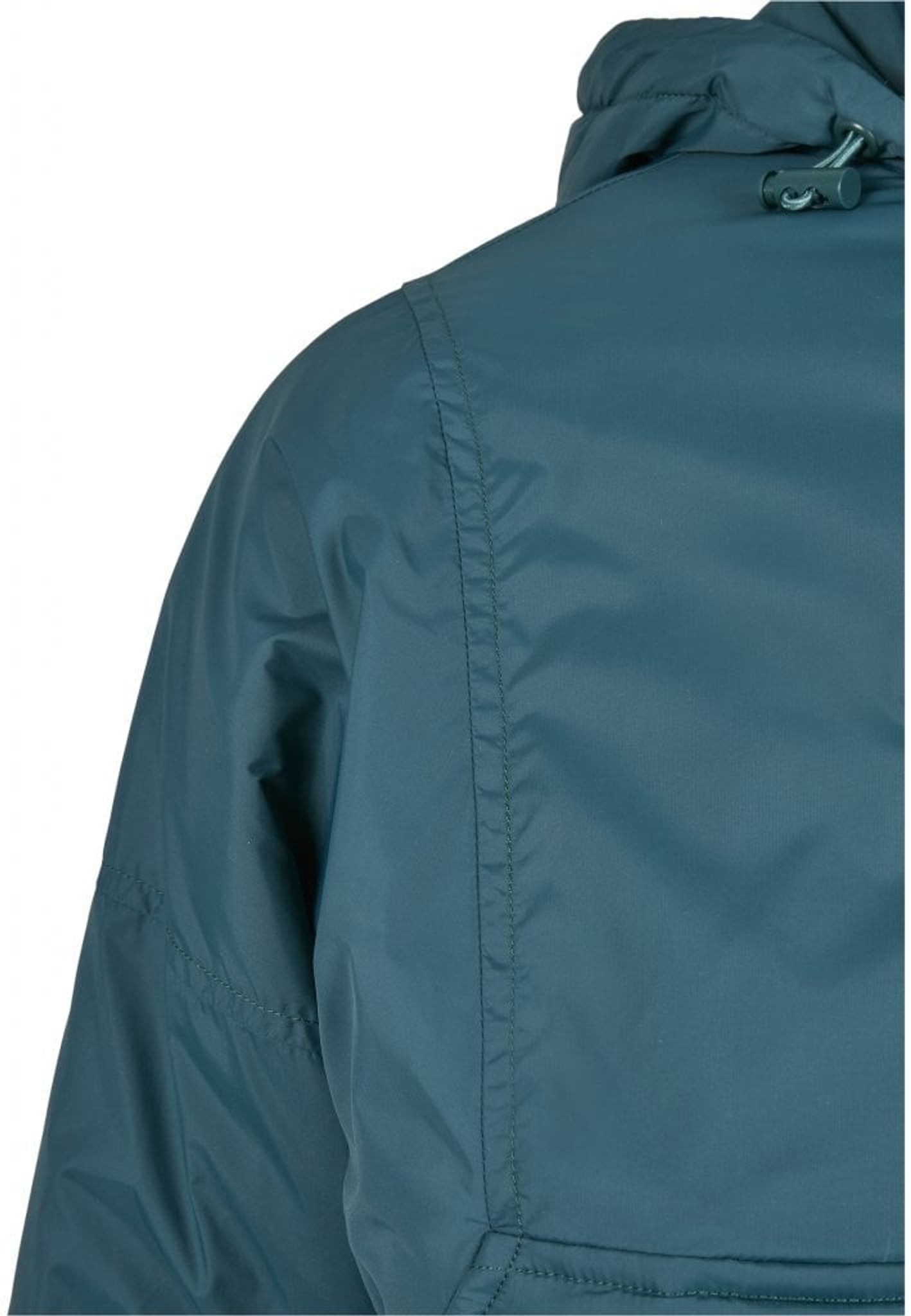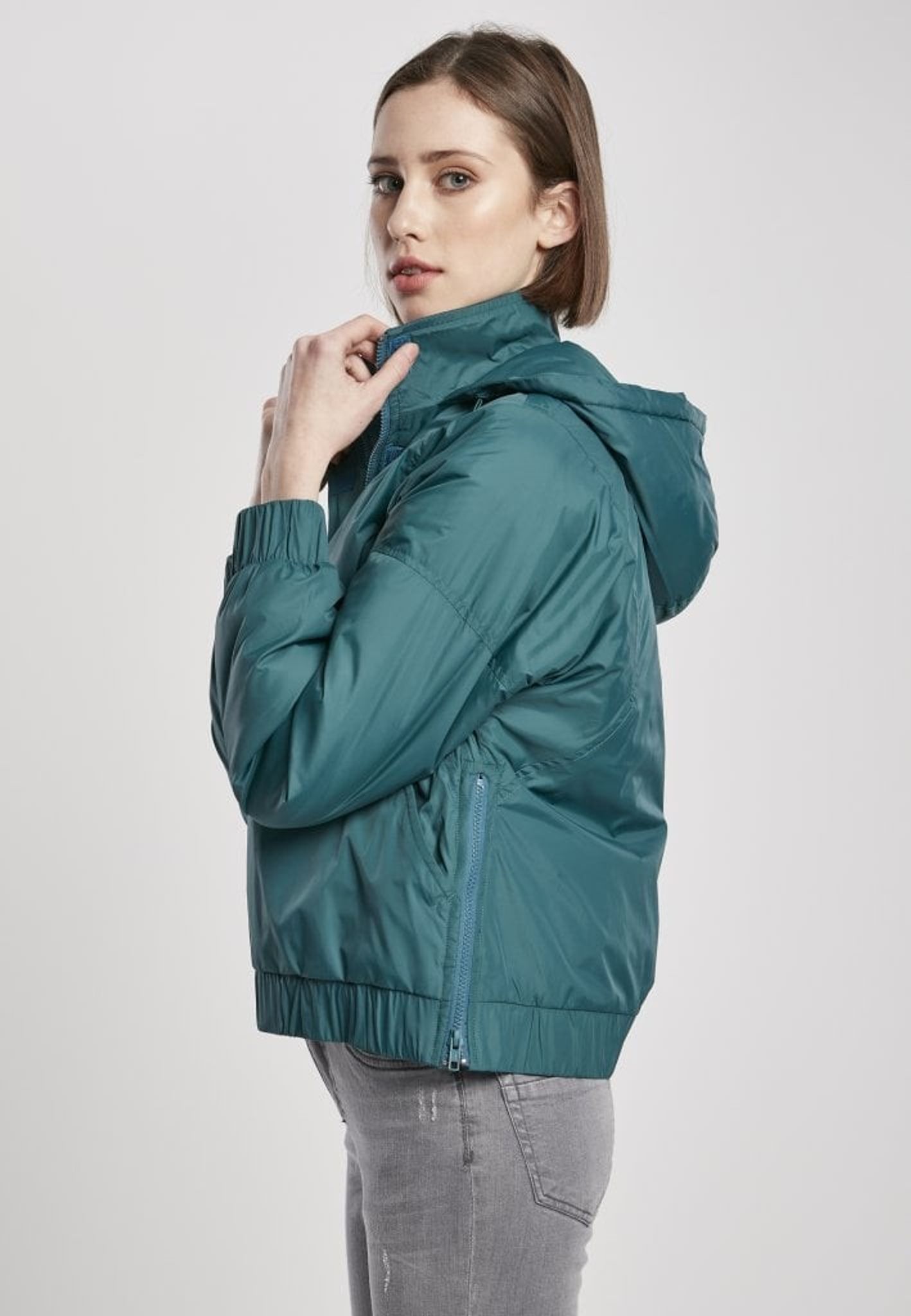 Denna vindjacka är fordrad och har en hög hals med huva.