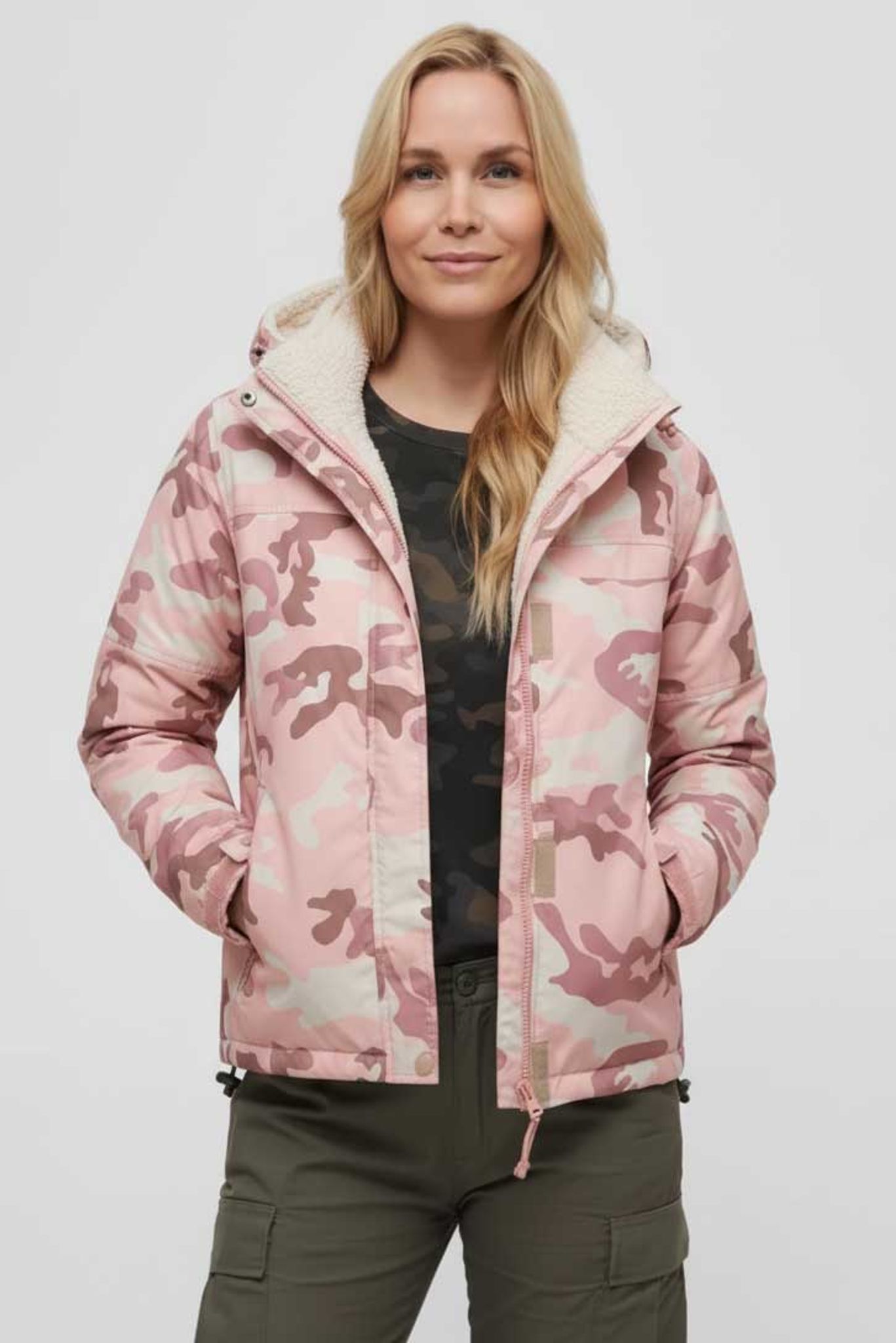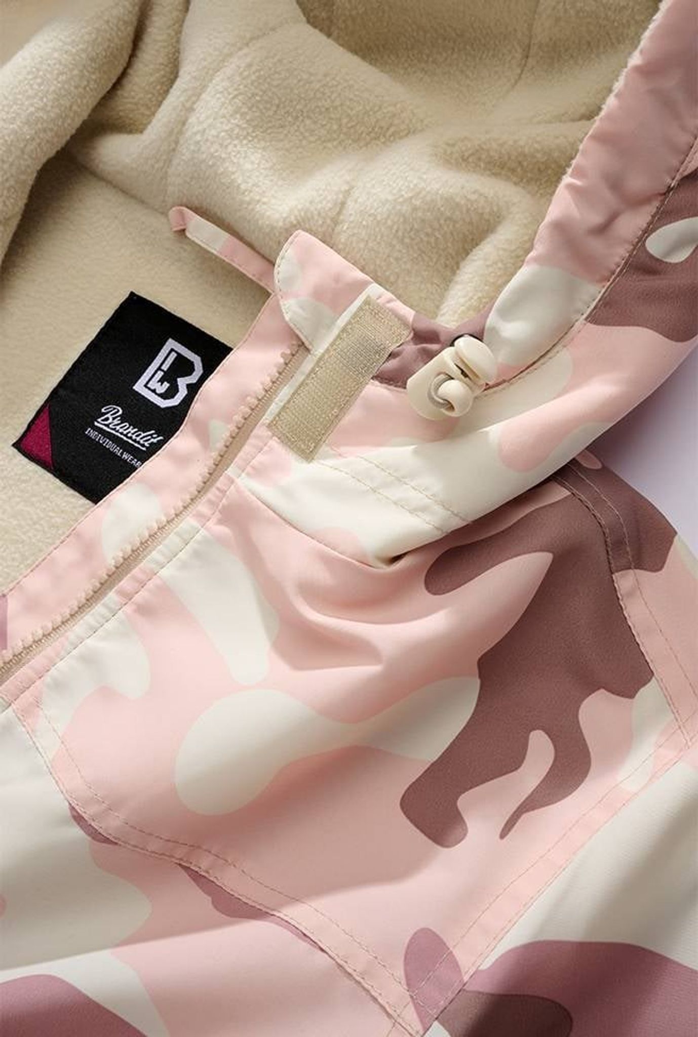 Jackan är mönstrad i Brandits rosa candy camo.