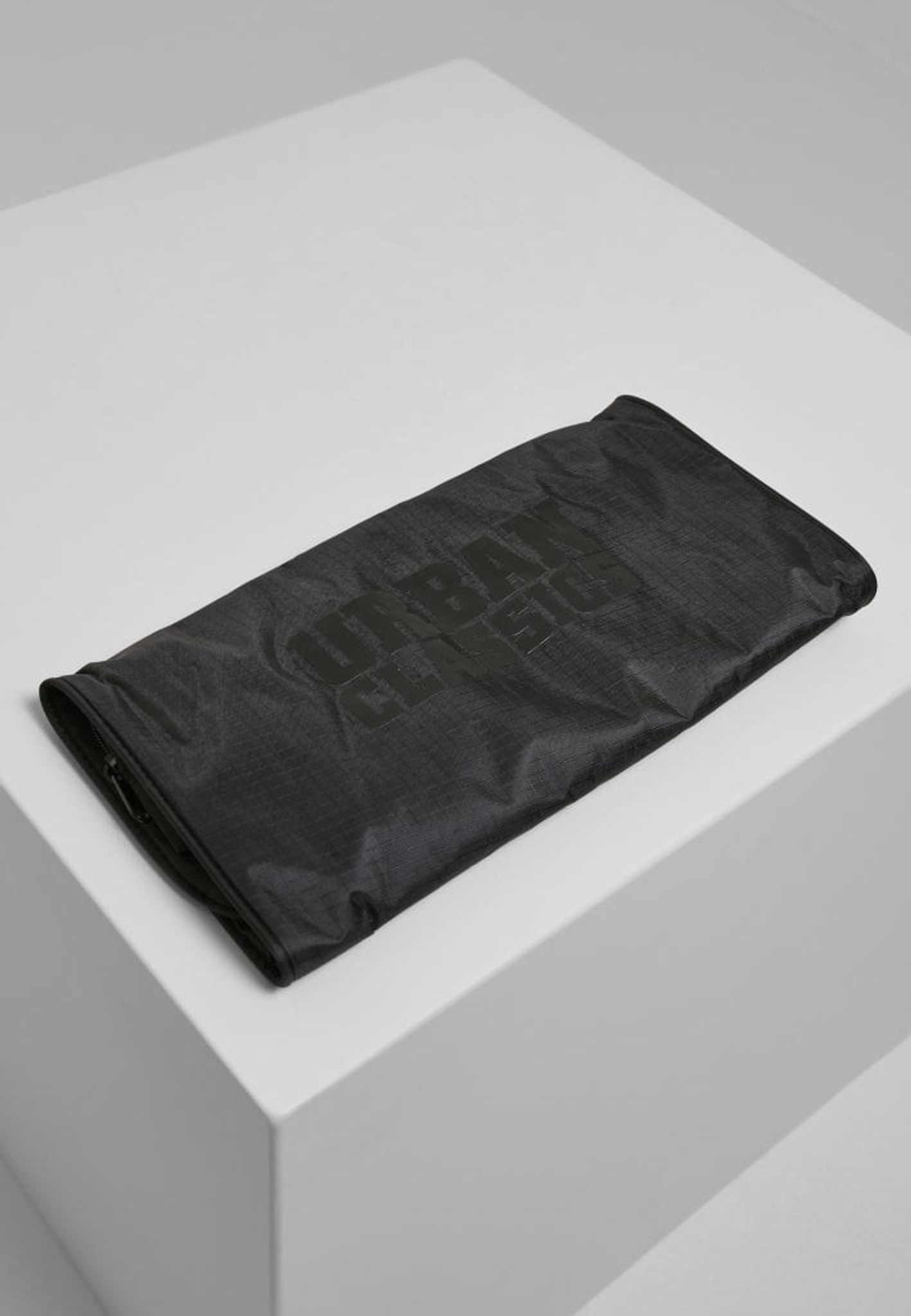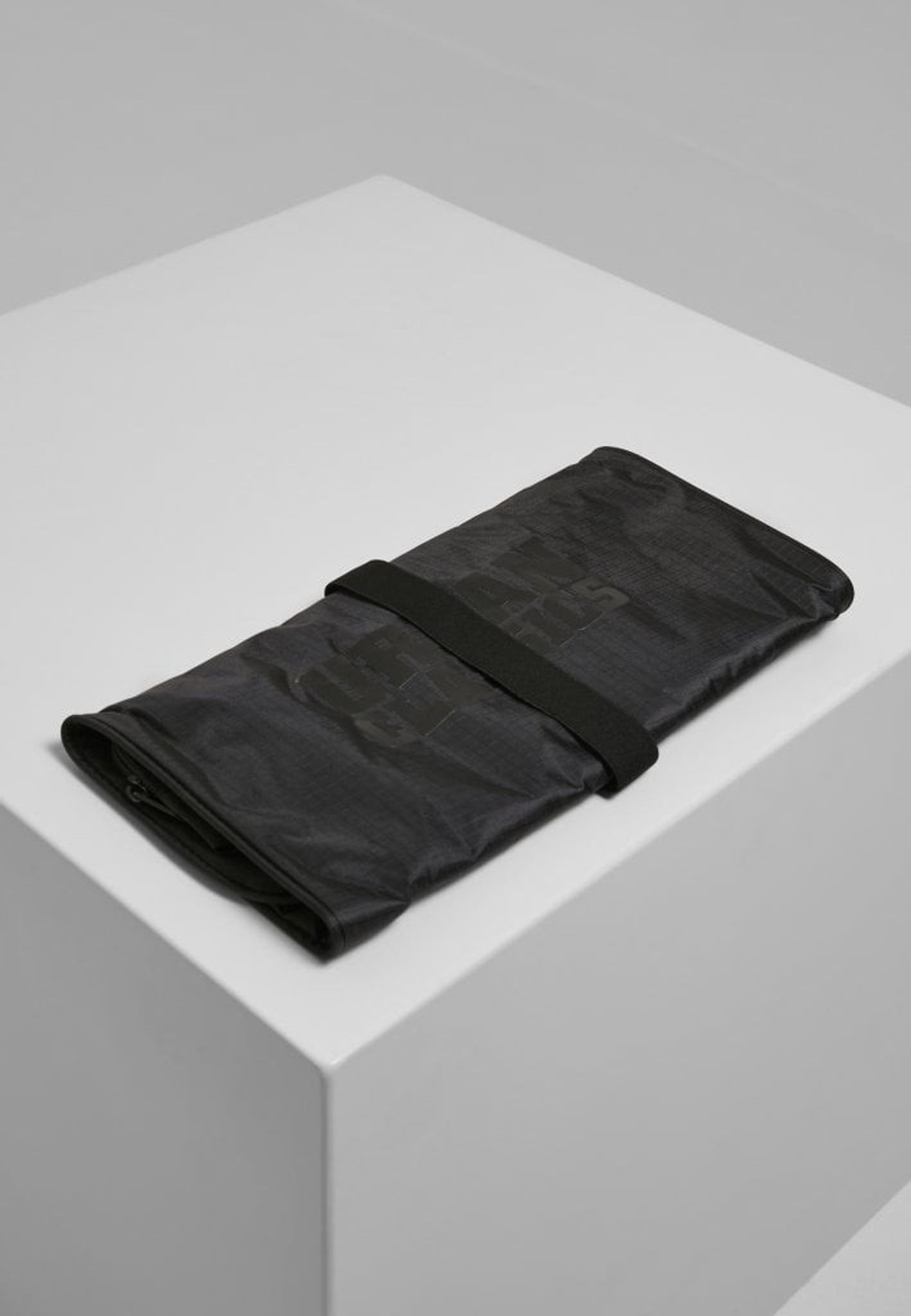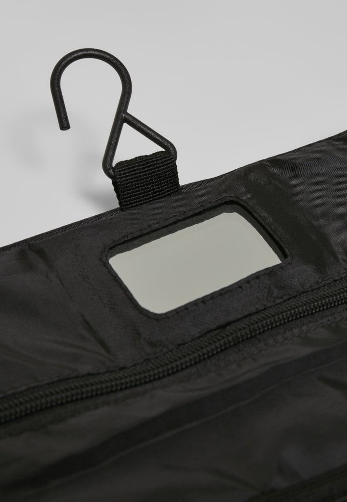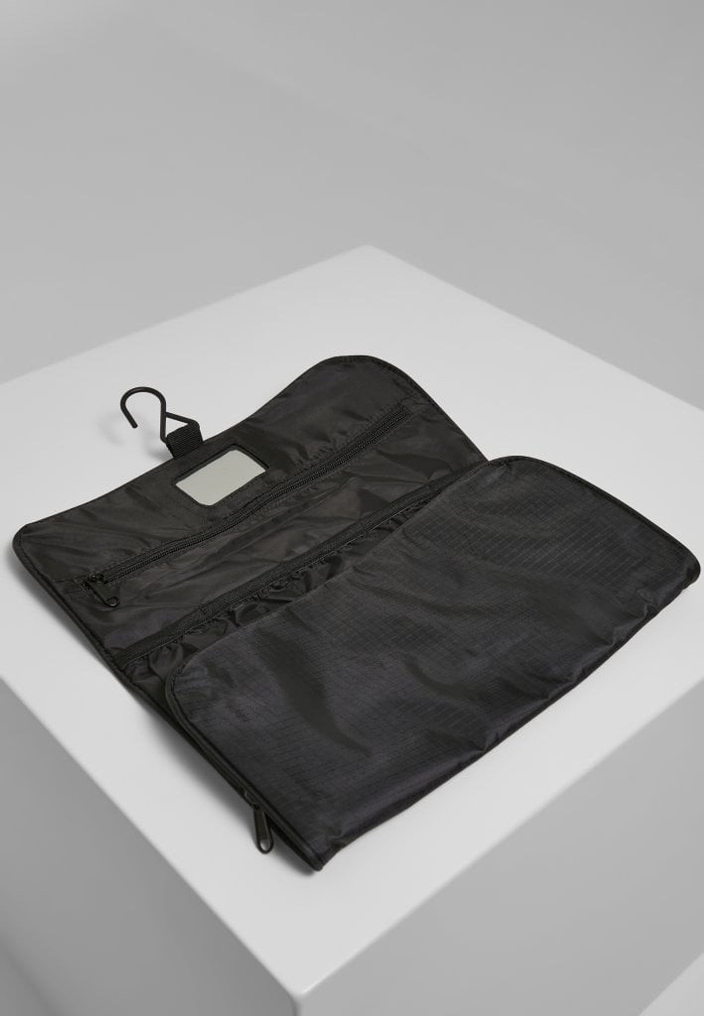 Det finns en rem med kardborreband som håller ihop väskan och det finns en ögla så att påsen kan hängas upp.