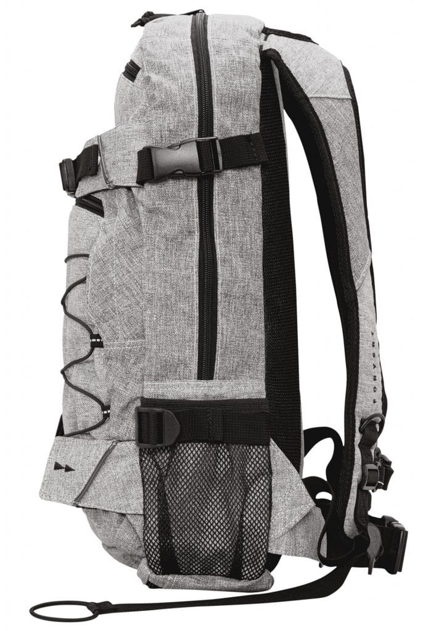 Ryggsäcken stängs med en dragkedja och har två fack med dragkedja fram.