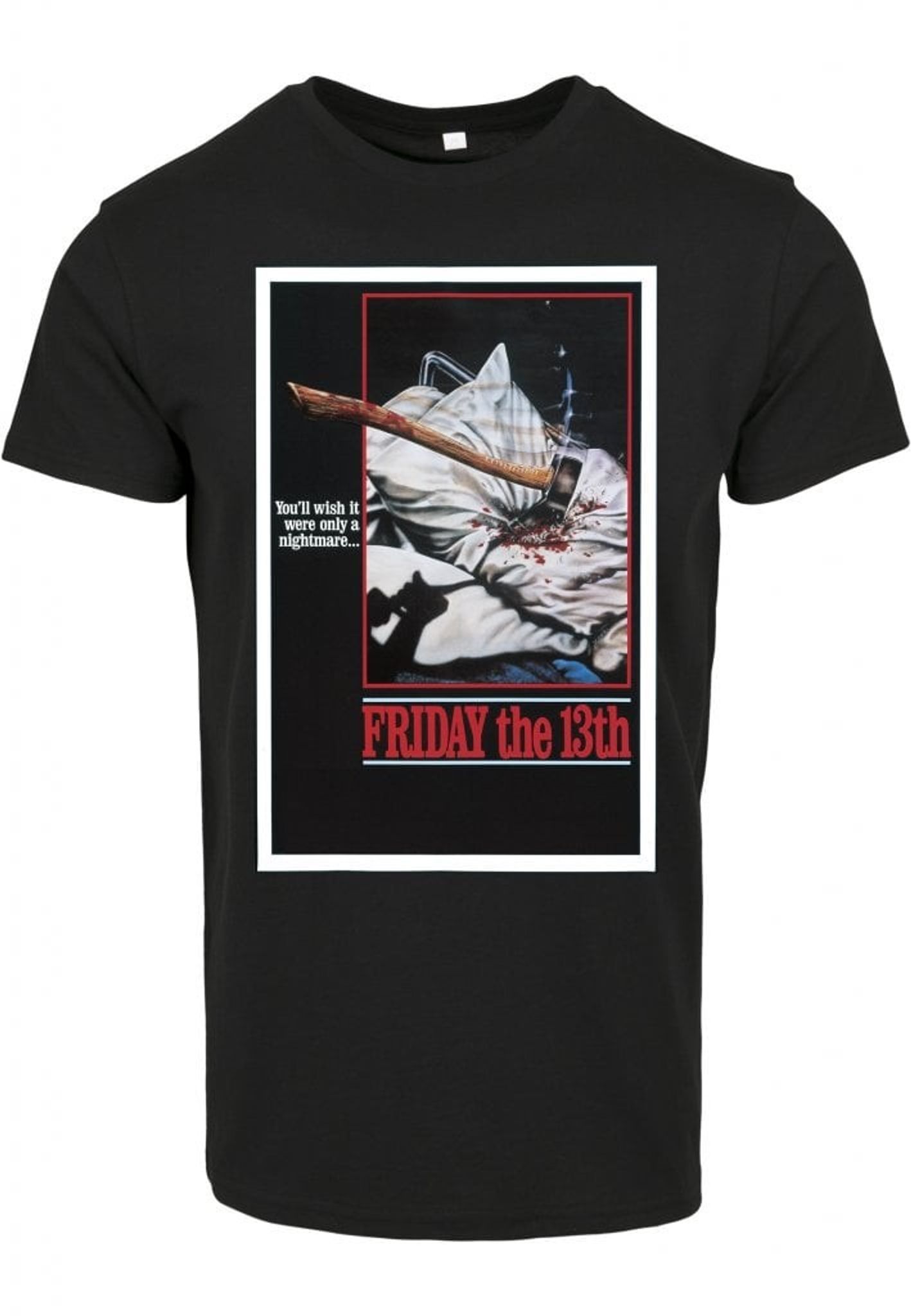 T-shirt med ett affischomslag från den klassiska filmserien Fredagen den 13:e där vi med skräckblandad förtjusning får bevittna den fiktiva mördaren Jason Voorhees i hans jakt på offer.