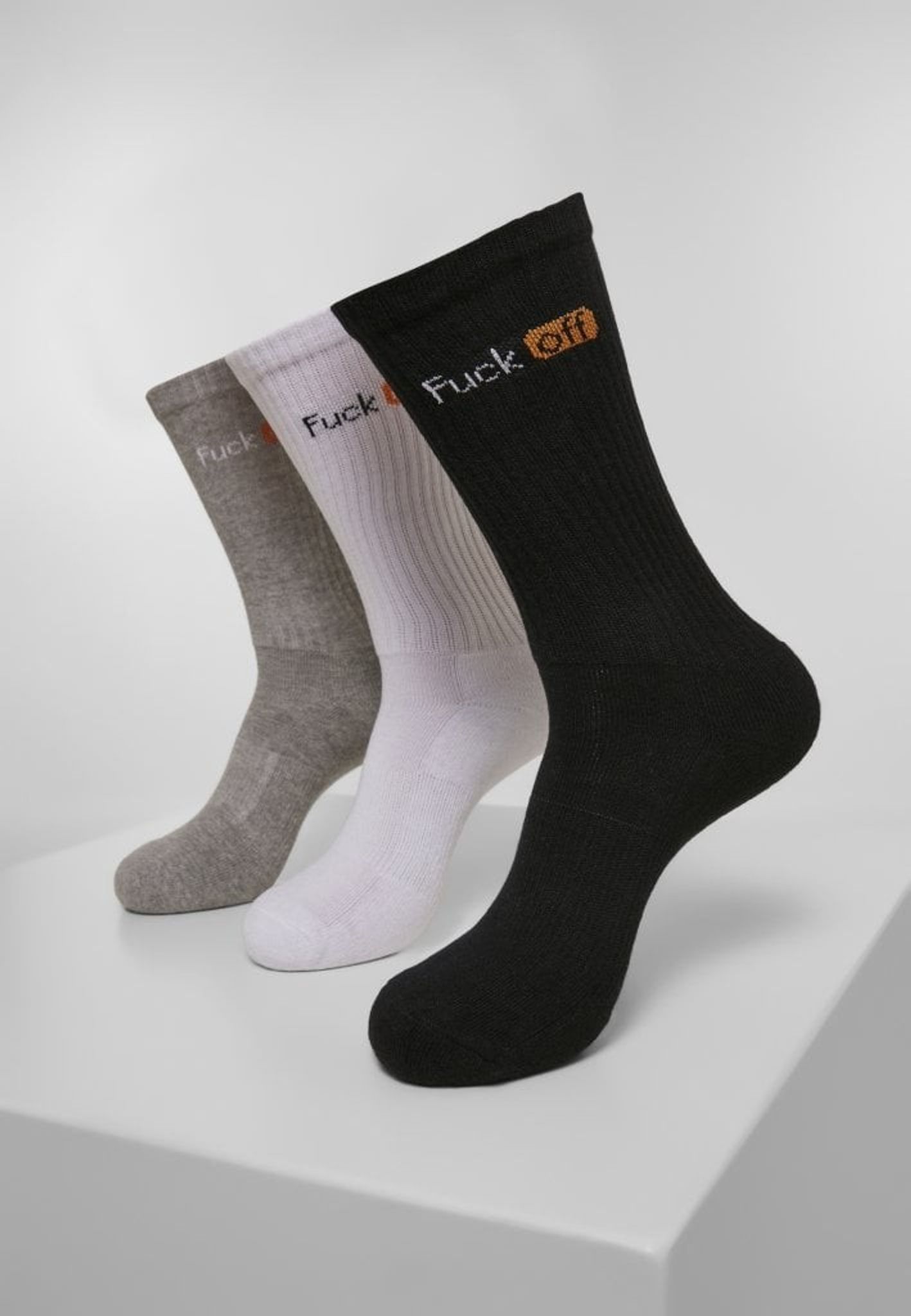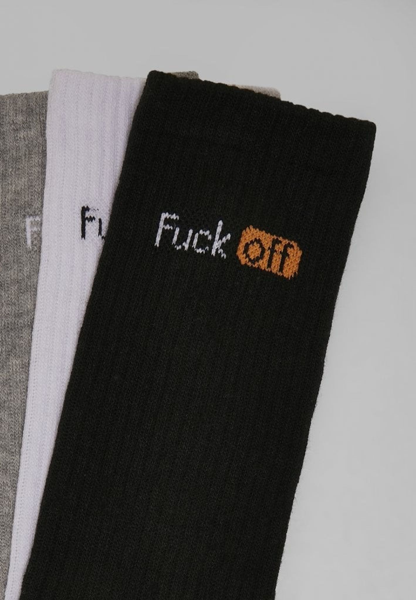 Tre par med strumpor i olika färger men med samma kaxiga tryck - Fuckoff.