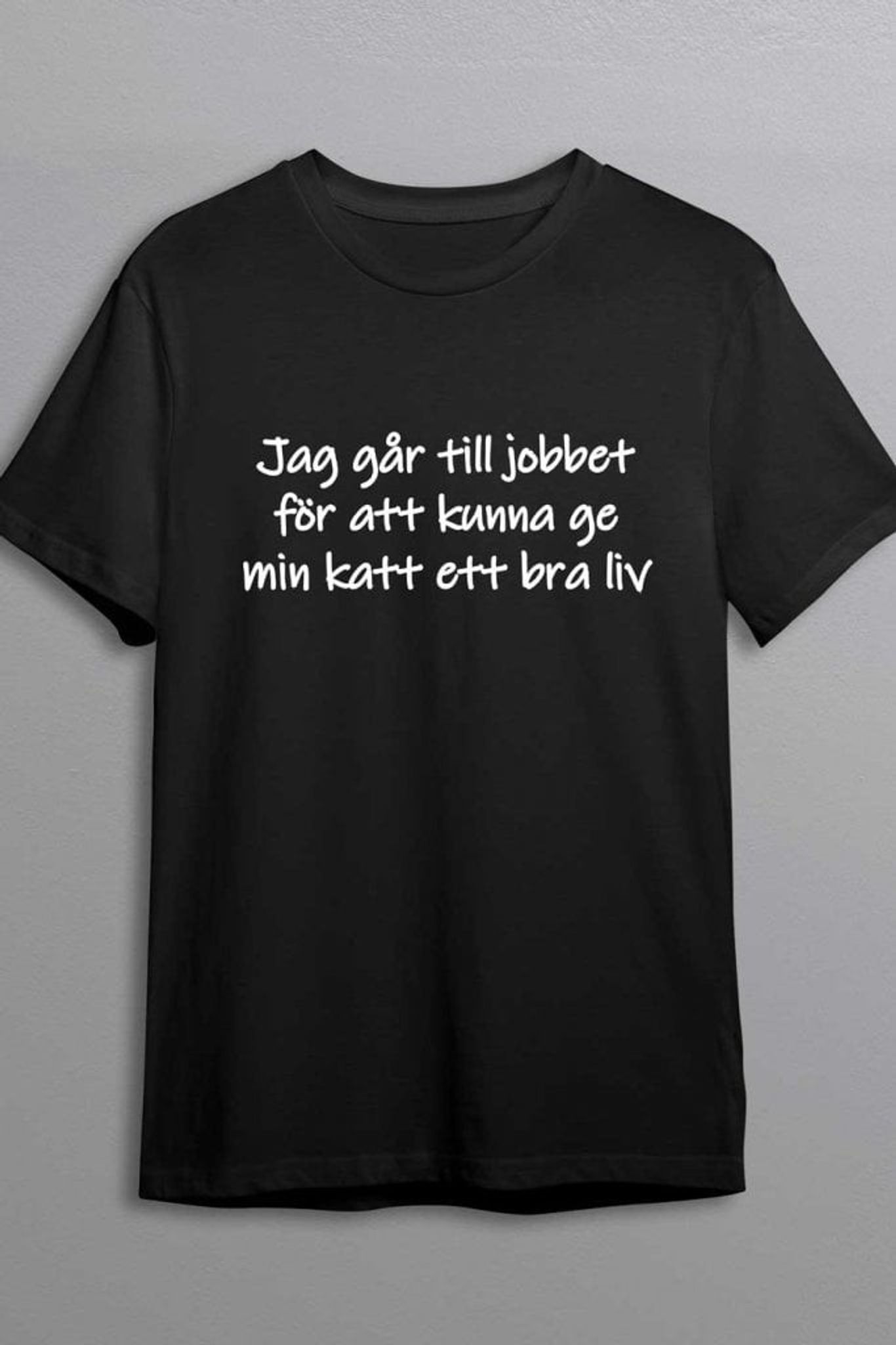 Min svarta T-shirt bär stolt budskapet: "Jag går till jobbet för att kunna ge min katt ett bra liv." Och jag säger dig, min katt är kräsen när det kommer till sitt livsstilskrav! Det här trycket är som en påminnelse om att våra fyrbenta vänner förtjänar det bästa, och vi är beredda att jobba för det.