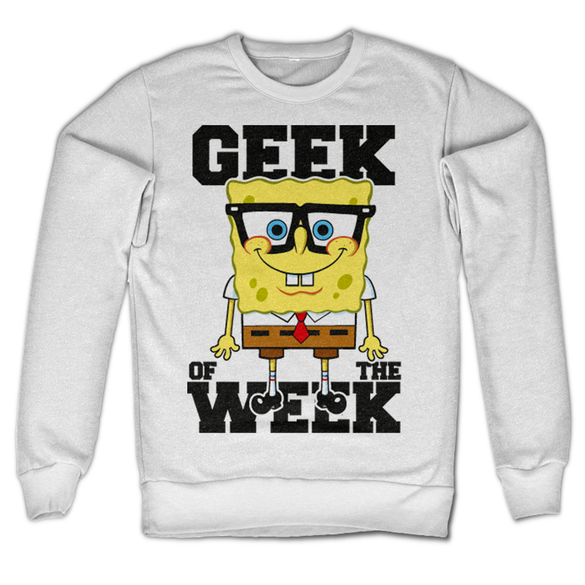 En sweatshirt med en härligt nördig version av den lilla glada SvampBob Fyrkant och texten "Geek Of The Week".
