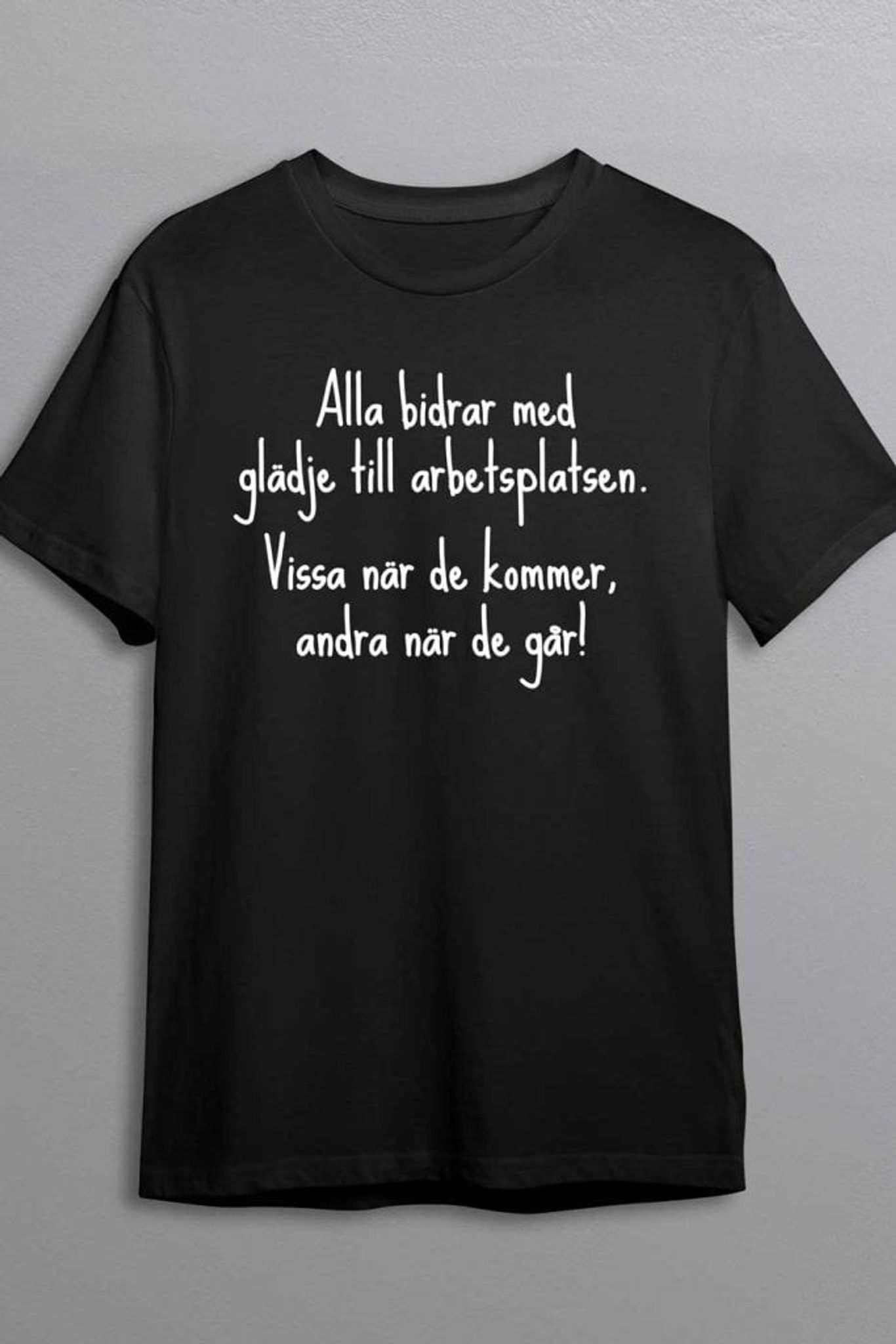 Med sitt djärva och iögonfallande tryck som lyder "Alla bidrar med glädje på jobbet. Vissa när de kommer, andra när de går!", är denna T-shirt en bra konversationsstartare och en påminnelse till alla om att ta med sig sitt bästa jag till jobbet.