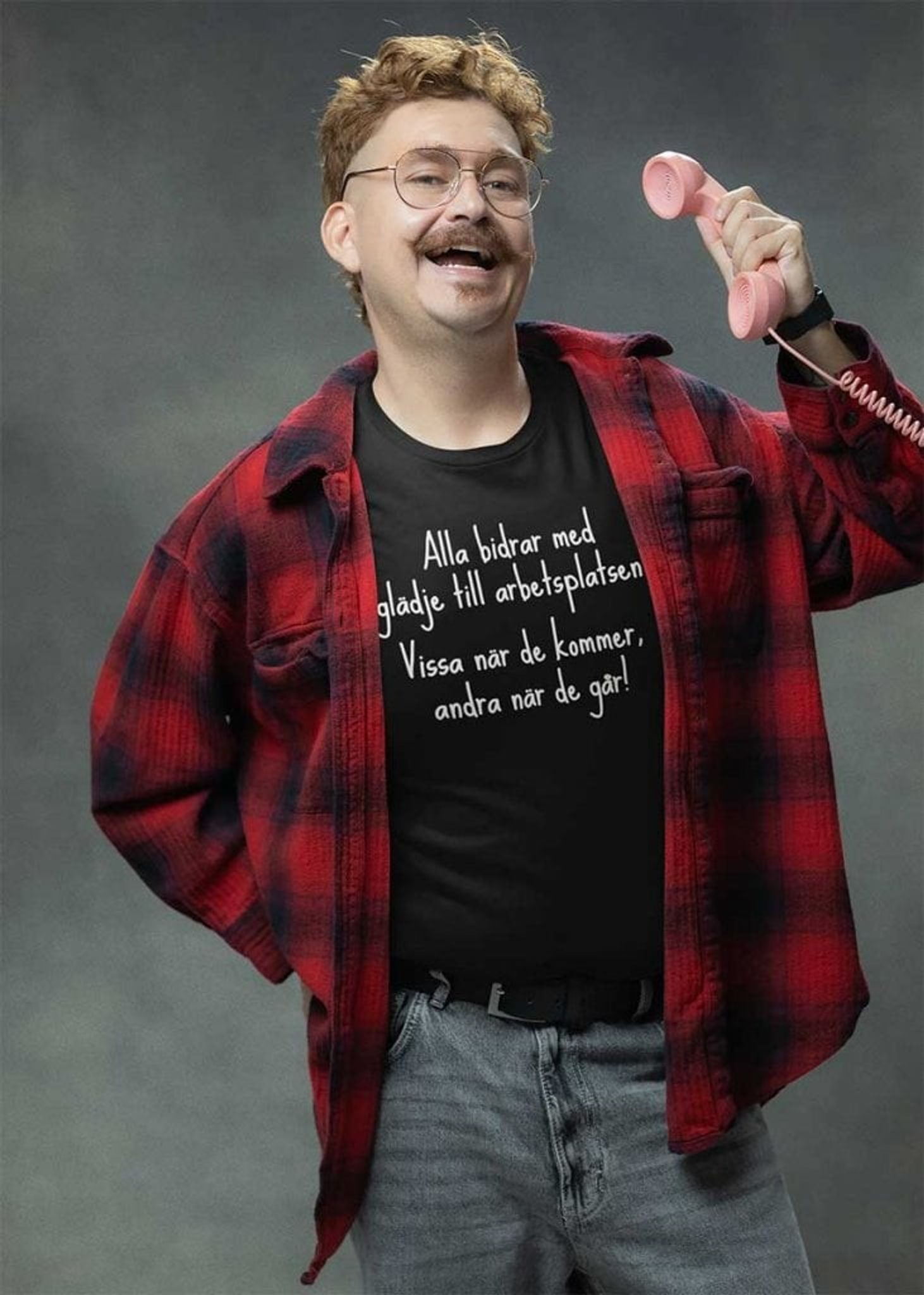 Den finns i både dam- och herrstorlekar, så nu kan du bära denna T-shirt med stolthet och bli en del av det glada och produktiva teamet på din arbetsplats. Bär den på nästa teammöte, företagsevent eller bara på en ledig fredag för att sprida lite glädje och lyfta allas humör.