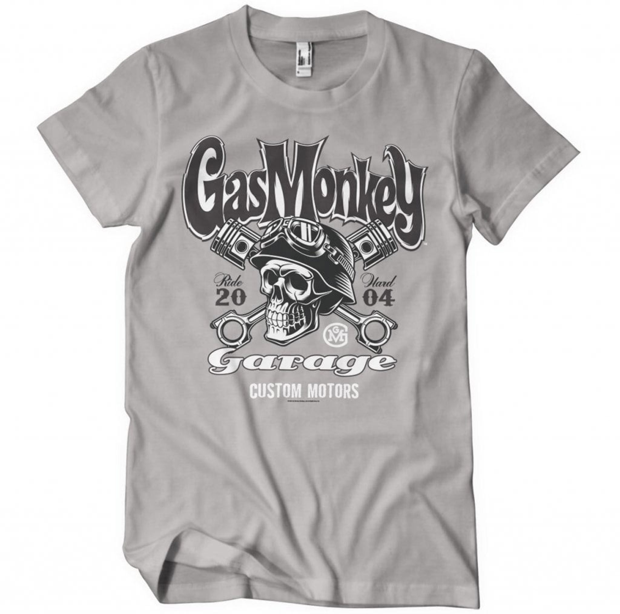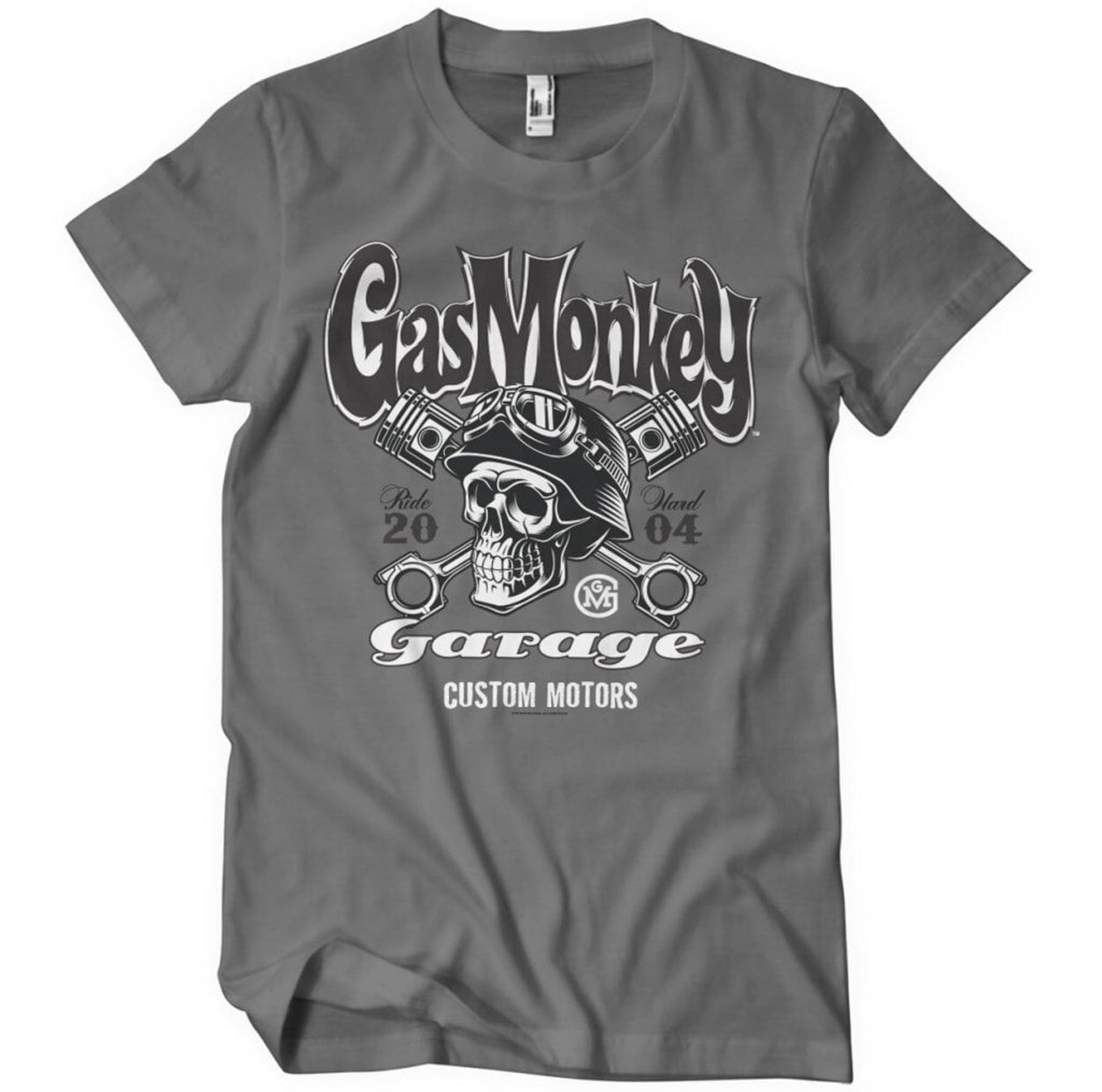 Ovanför dödskallen svävar texten "Gas Monkey" i ett snirkligt typsnitt som nästan känns som en inbjudan till en galen biltävling. Under dödskallen står "Garage" i ett mer rundat typsnitt, med den kända logotypen "GMG" i en cirkel under, som om den säger: "Välkommen till vår värld av motorer och modifieringar!"