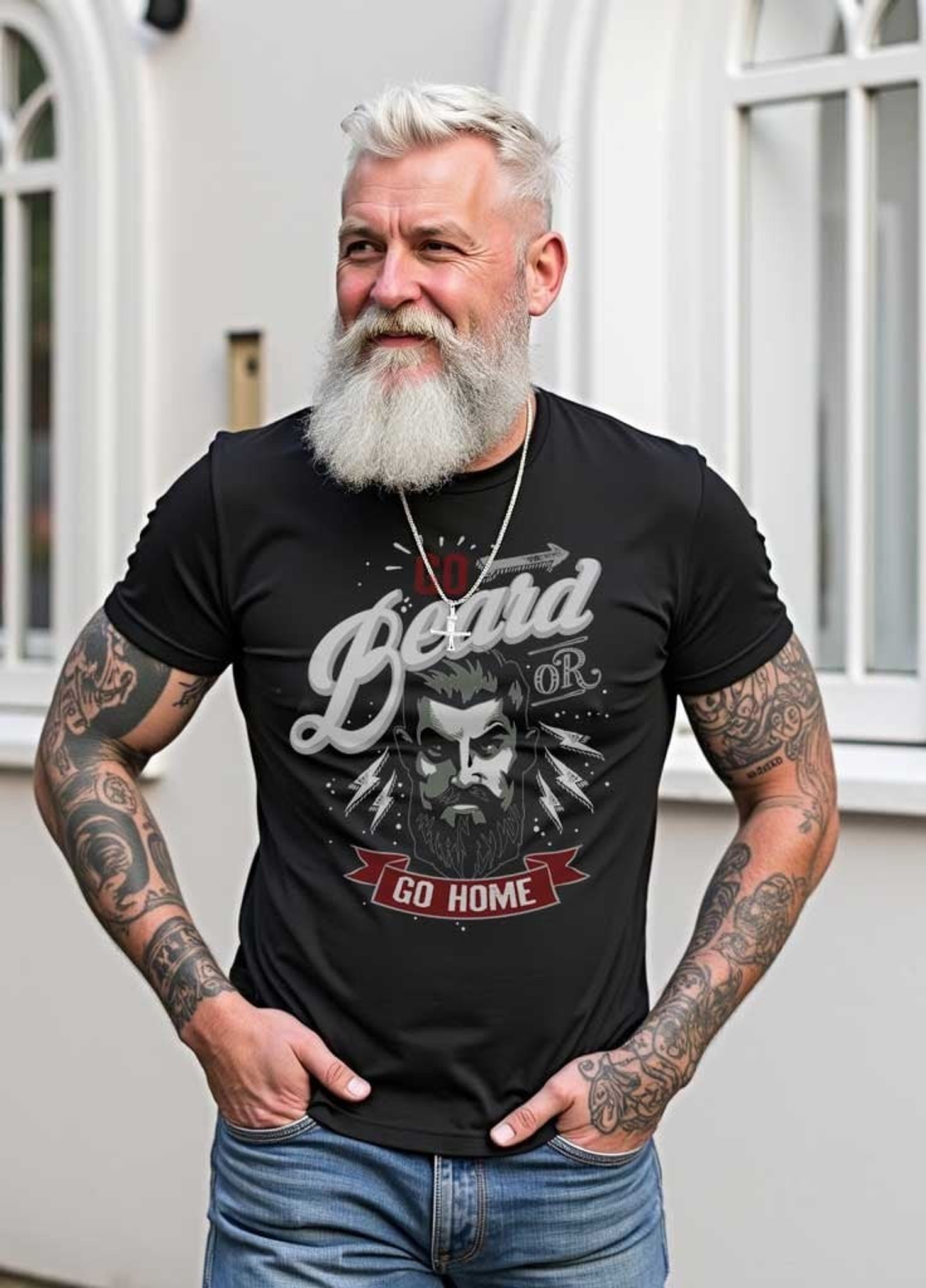 Den svarta bakgrunden gör att trycket verkligen framträder, med en stark kontrast mellan den vita och röda texten och den mörka, dramatiska illustrationen. Denna t-shirt är perfekt för dig som inte bara bär ett skägg, utan också en attityd som matchar.