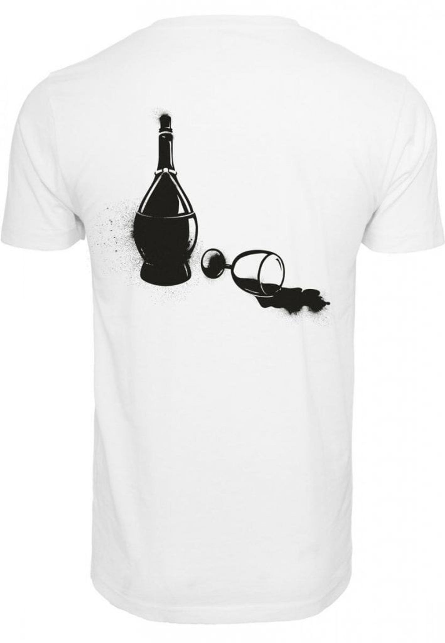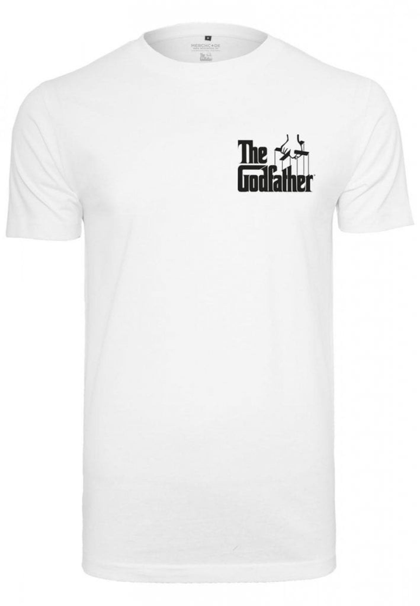 En vit t-shirt med ett tryck på bröstet med texten The Godfather och på ryggen är det ett svart tryck som visar en vinflaska och ett glas vin som trillat omkull.